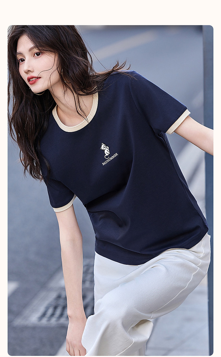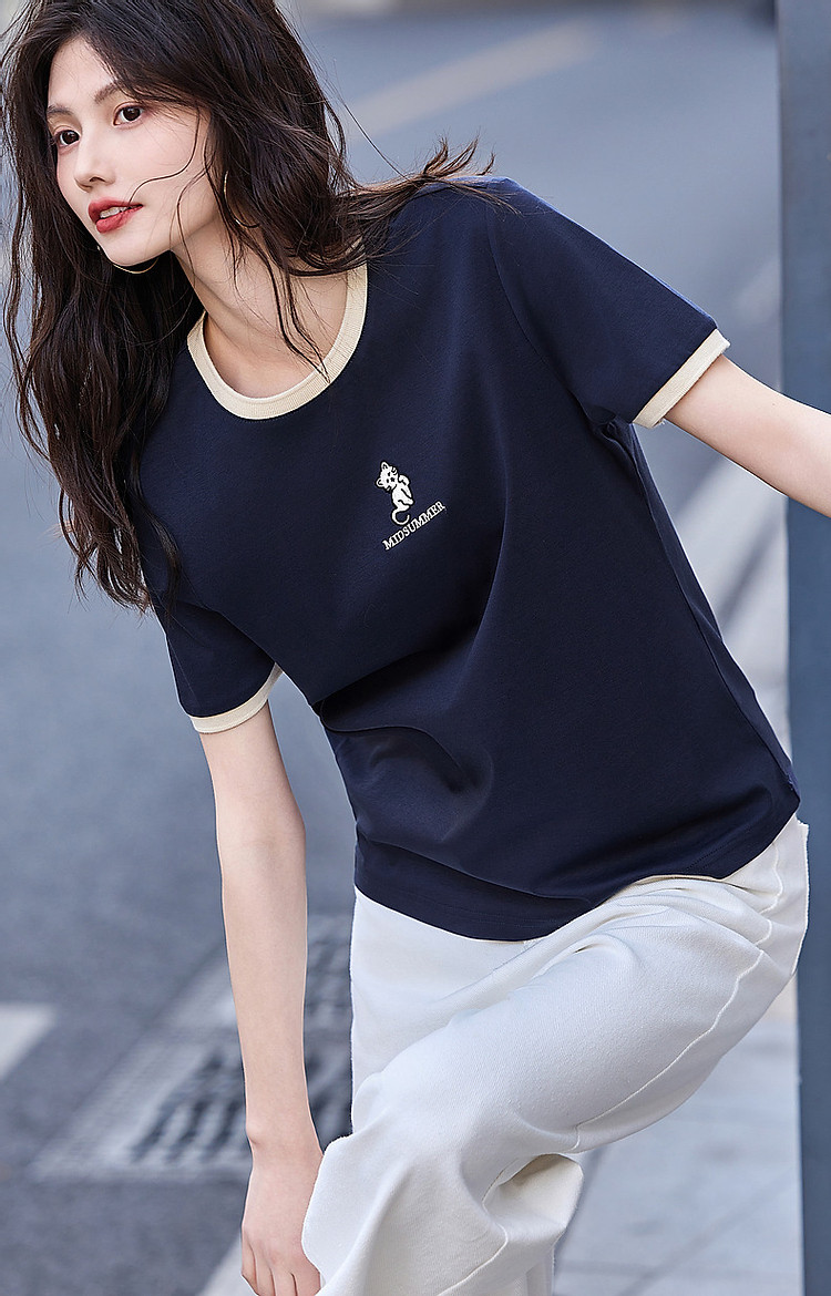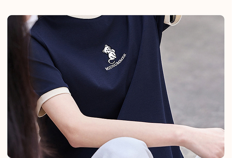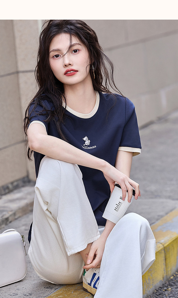 商品名称:【猫咪控可入】夏阳光棉可爱字母绣花短袖撞色罗纹女式t恤 147713