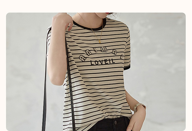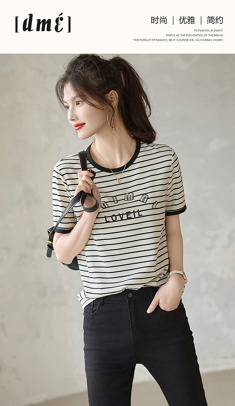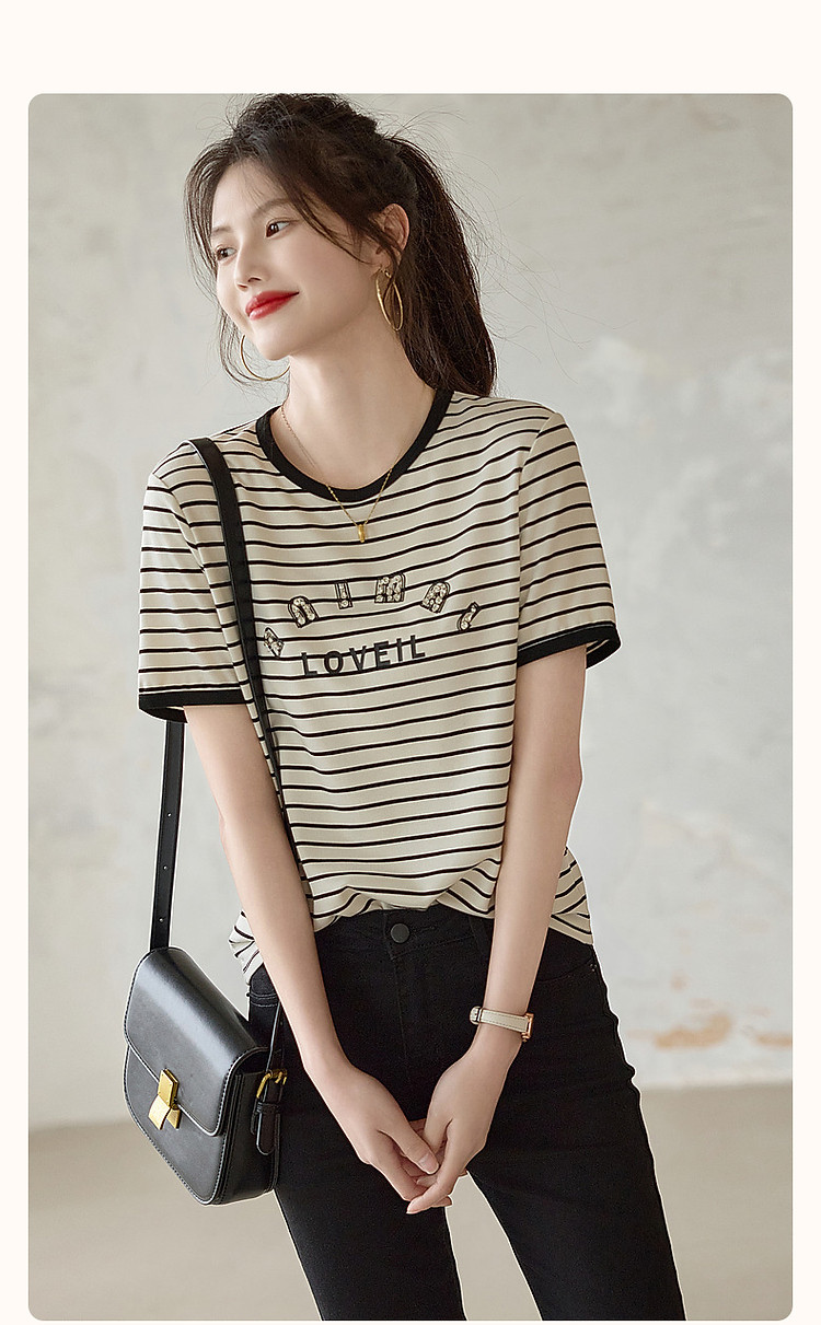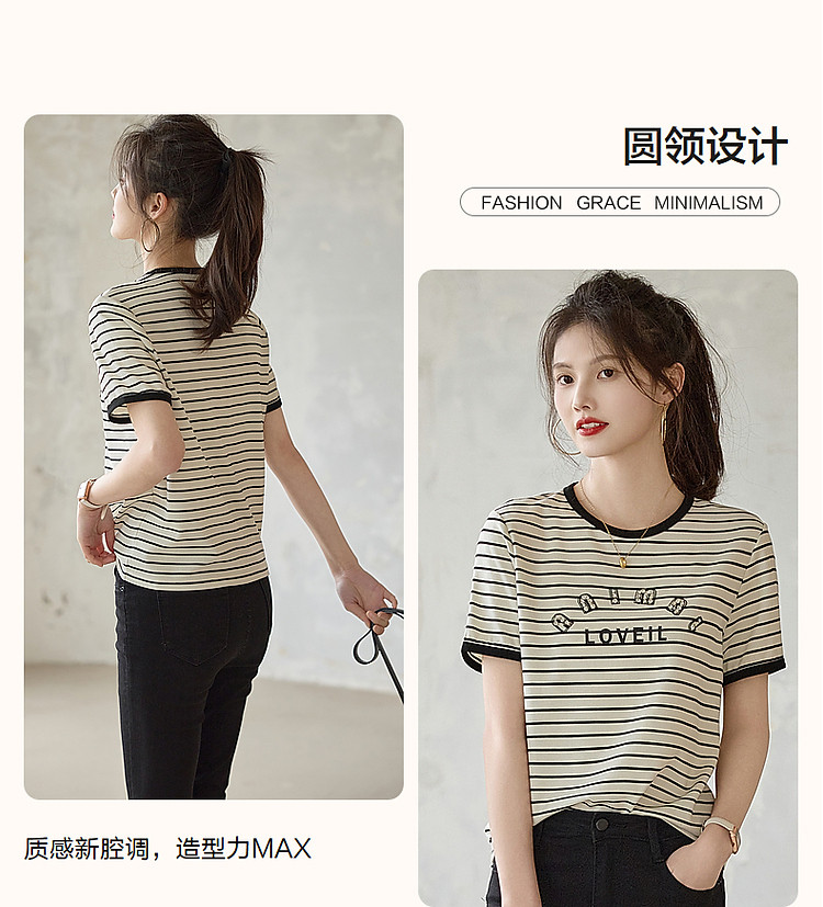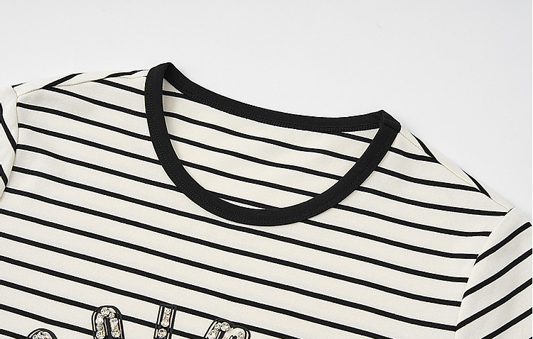 商品名称:【手工钉钻工艺】春秋圆领短袖上衣罗马色织撞色印花女士t恤 173889