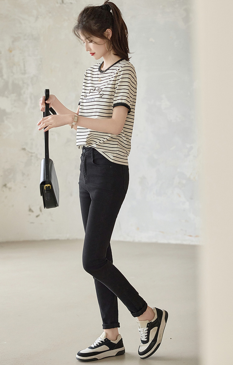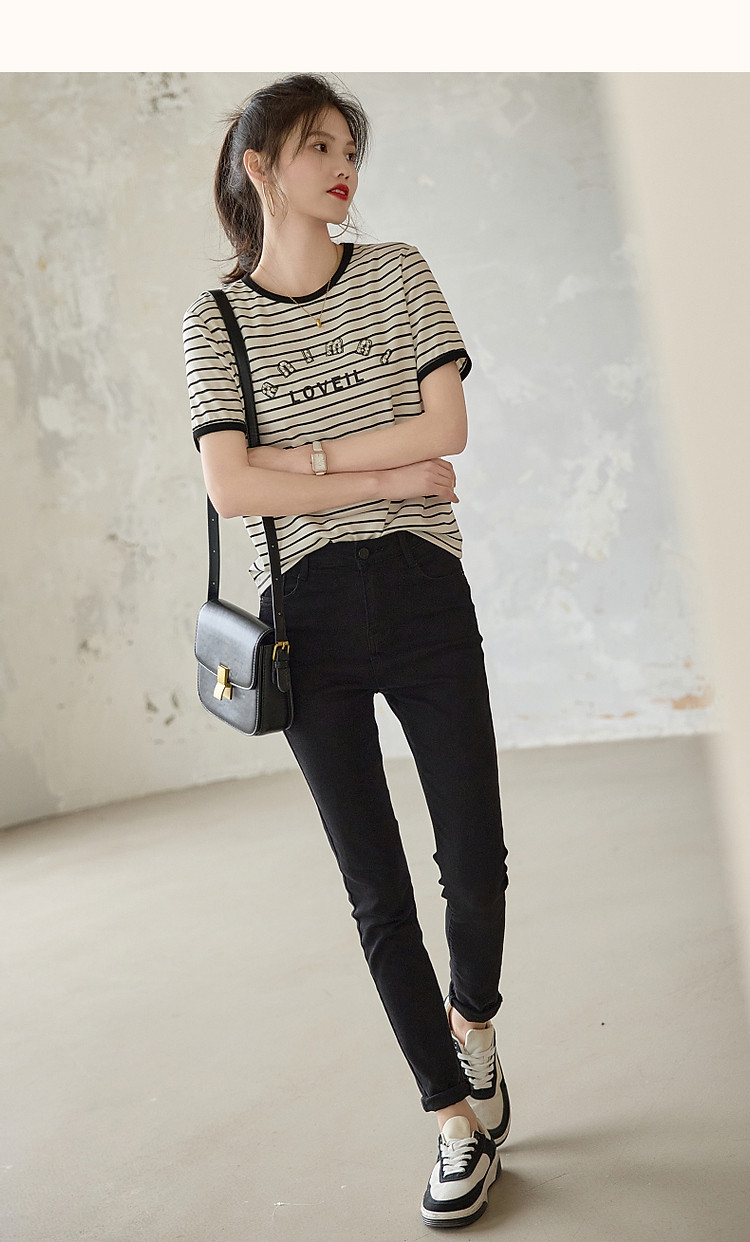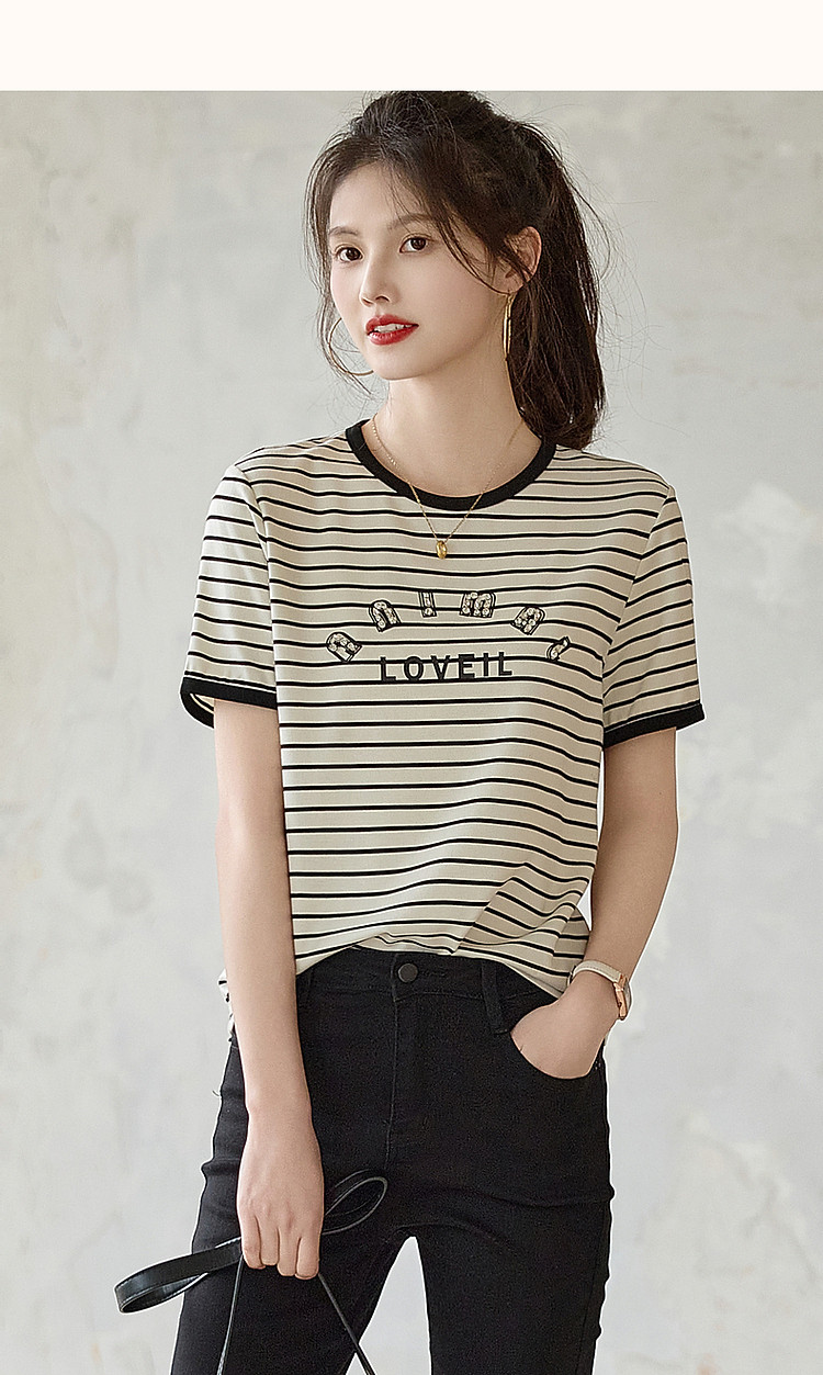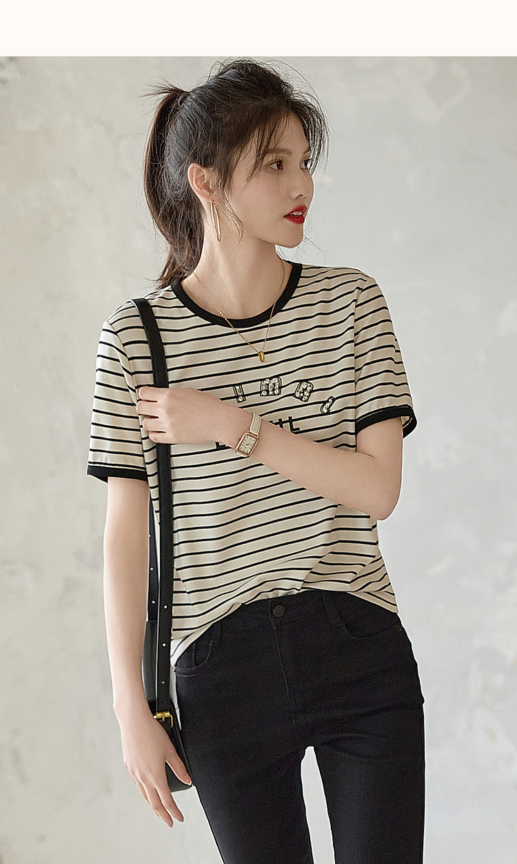 商品名称:【手工钉钻工艺】春秋圆领短袖上衣罗马色织撞色印花女士t恤 173889