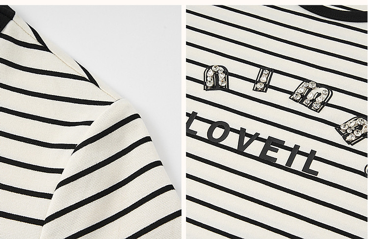 【手工钉钻工艺】春秋圆领短袖上衣罗马色织撞色印花女士t恤 173889