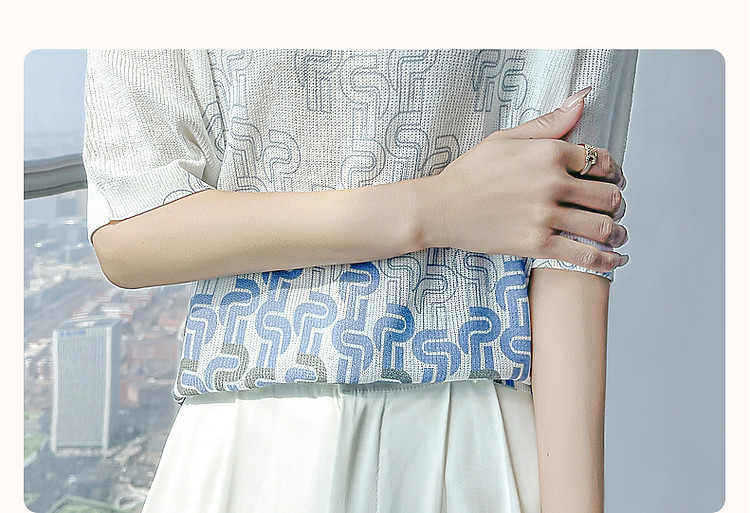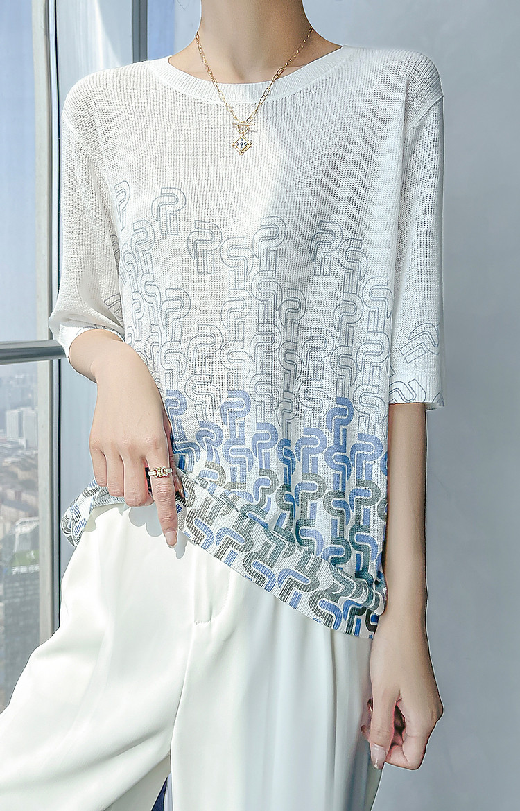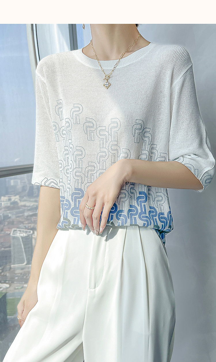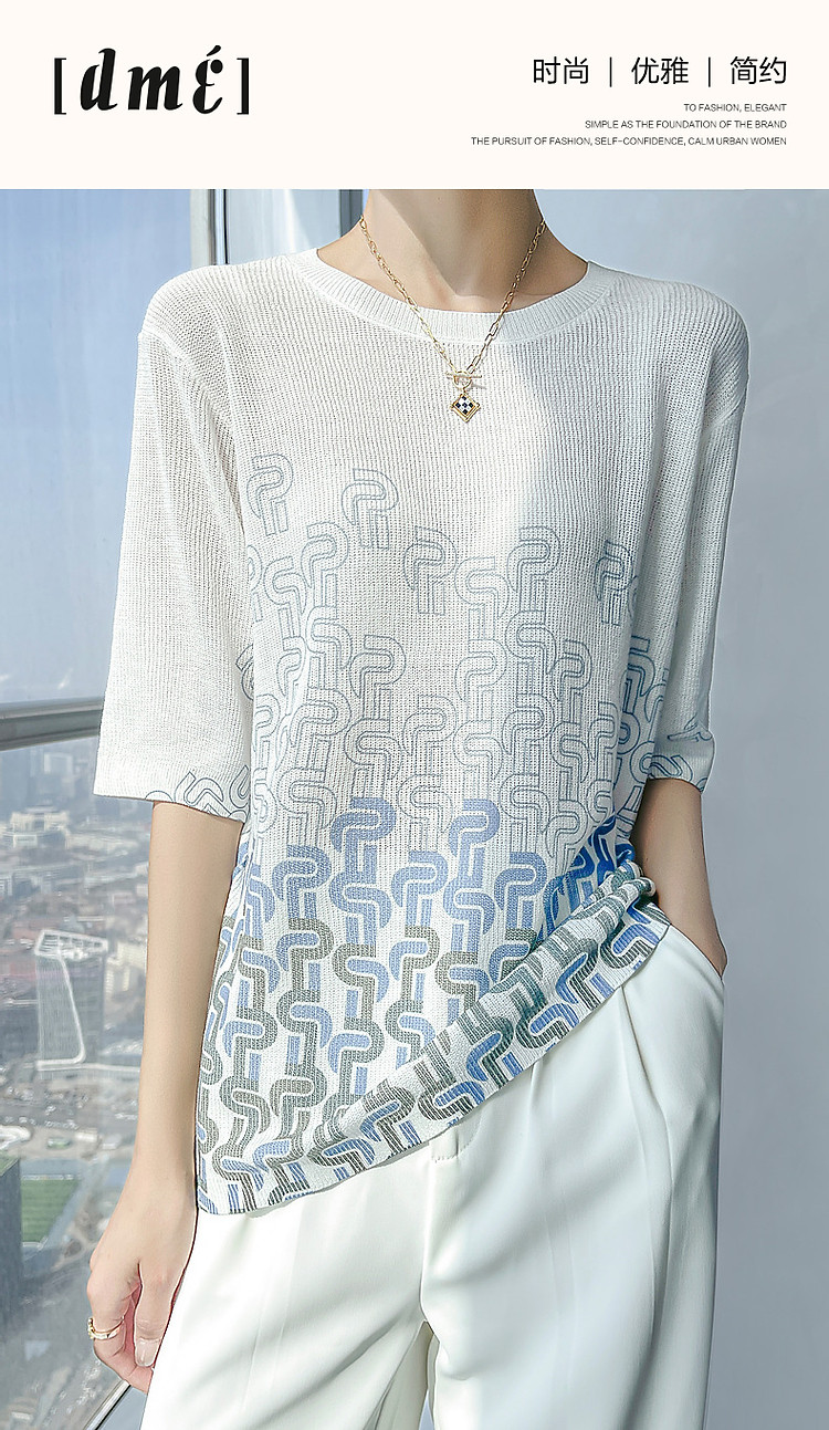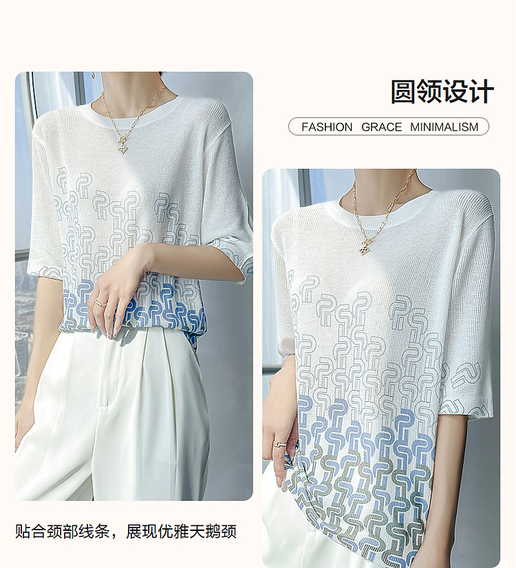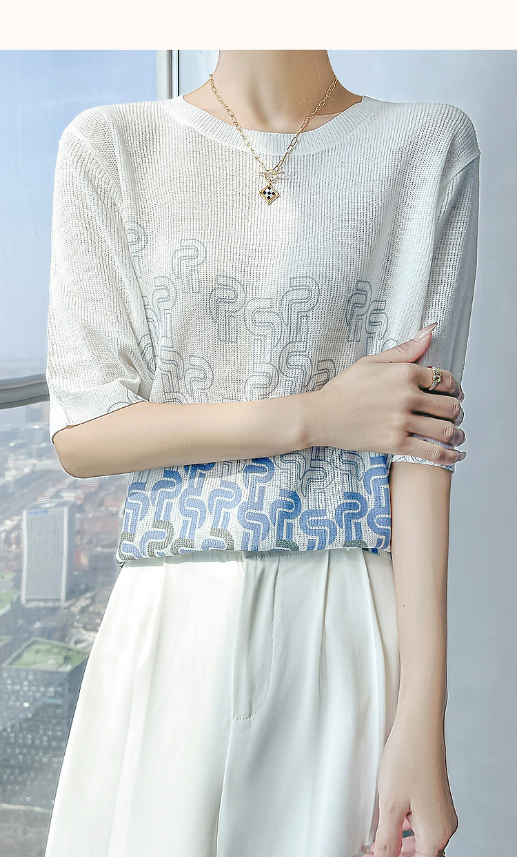 商品名称:【风雅格调】夏季简约通勤圆领短袖几何印花线衫气质针织衫女上衣 541249