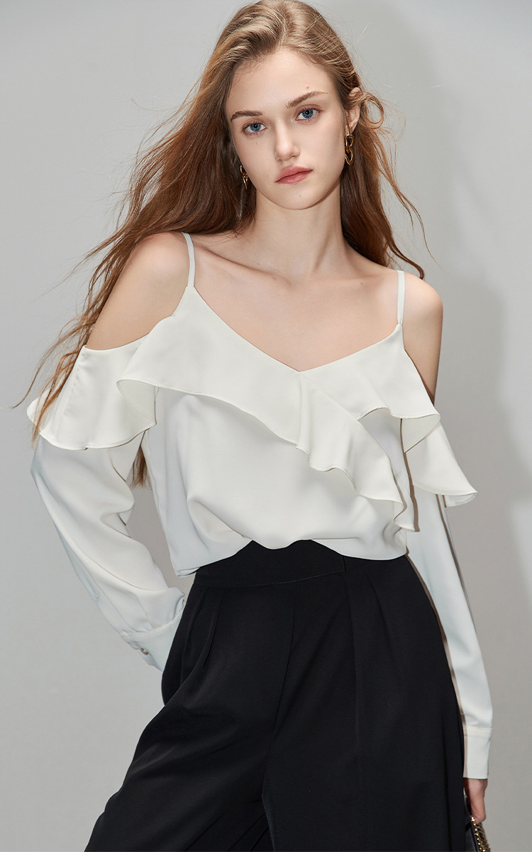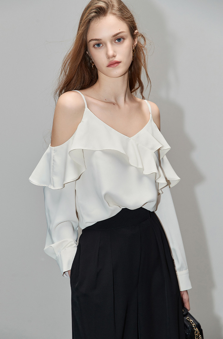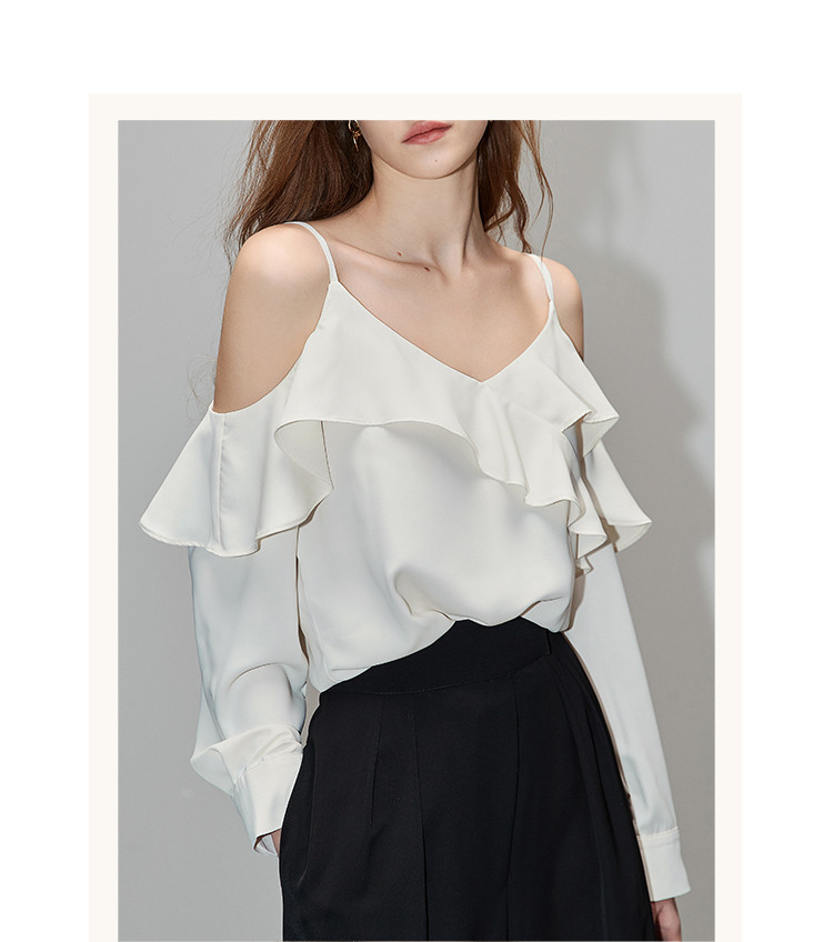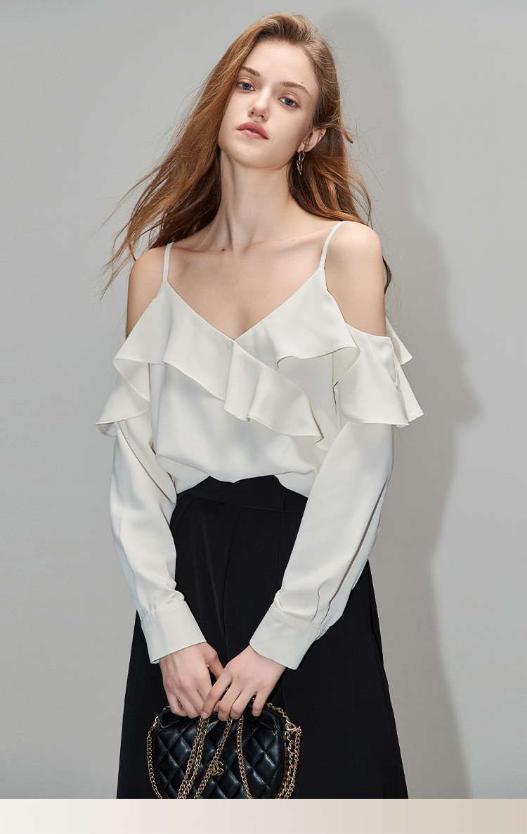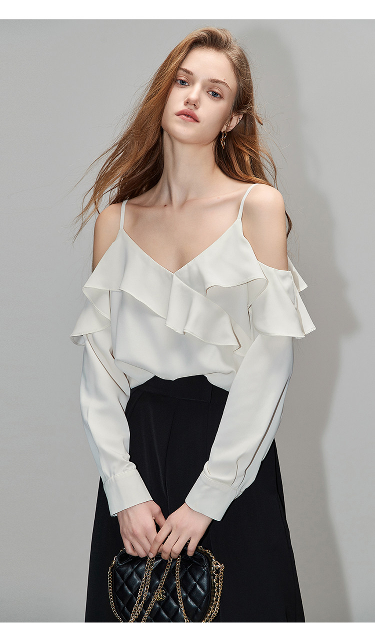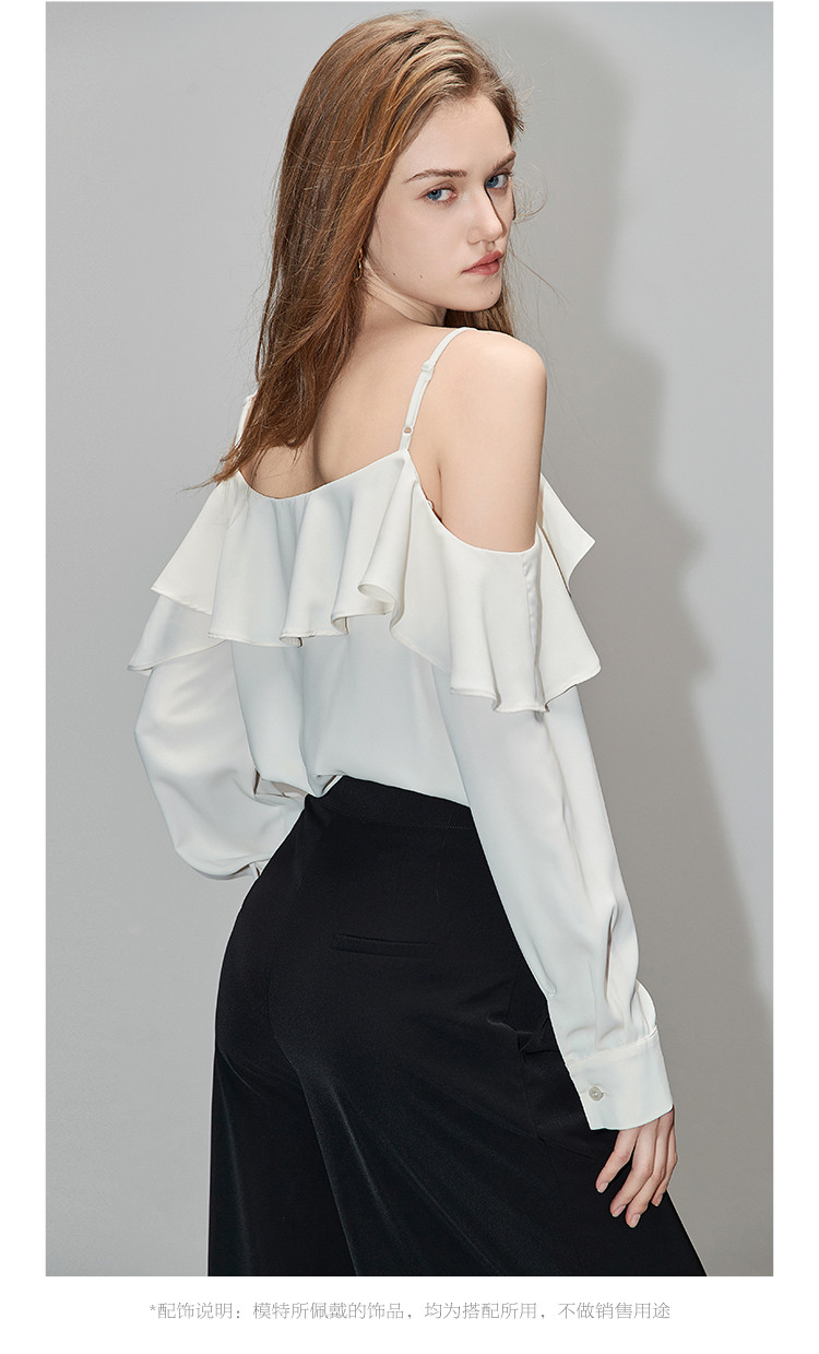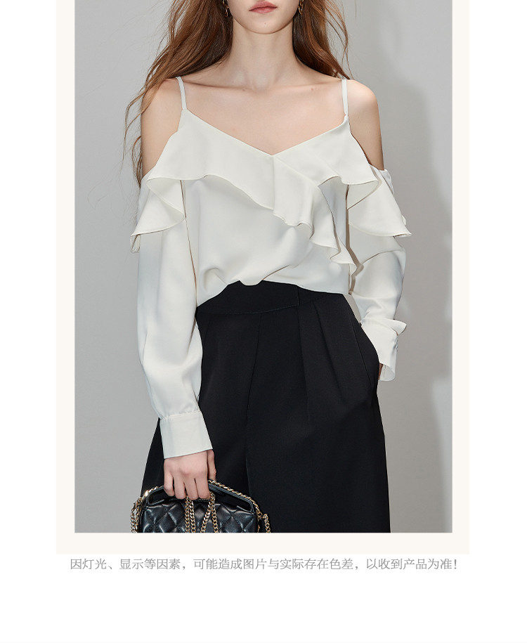 商品名称:【冰淇淋衬衫】春秋法式雪纺露肩一字领荷叶边藏肉好搭衬衣女上衣 081857