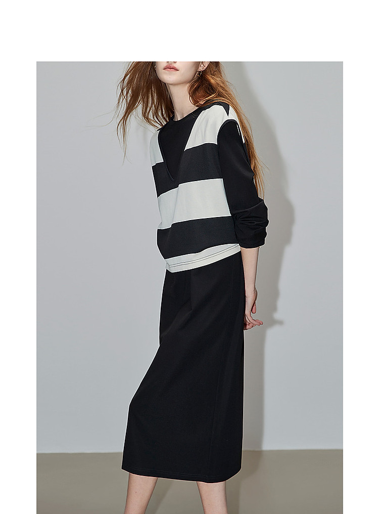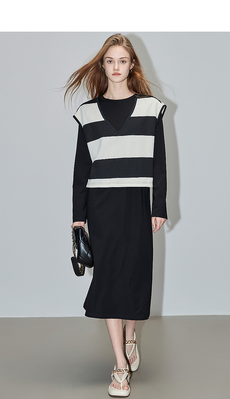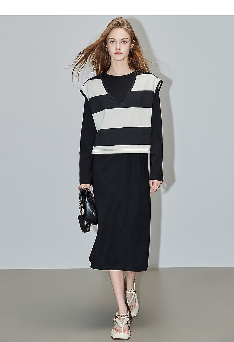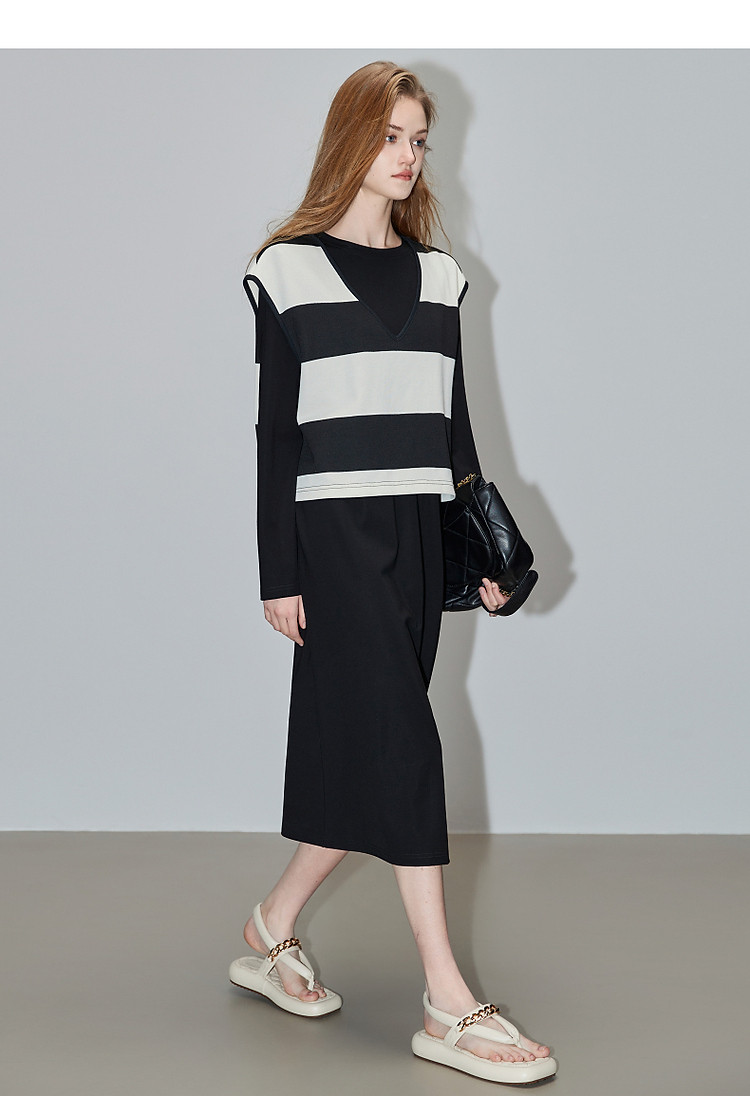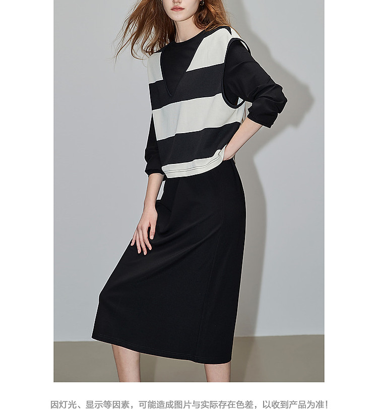 商品名称:【懒人休闲套装】春秋新时尚垂感罗马布连衣裙箱型条纹马甲两件套 723841