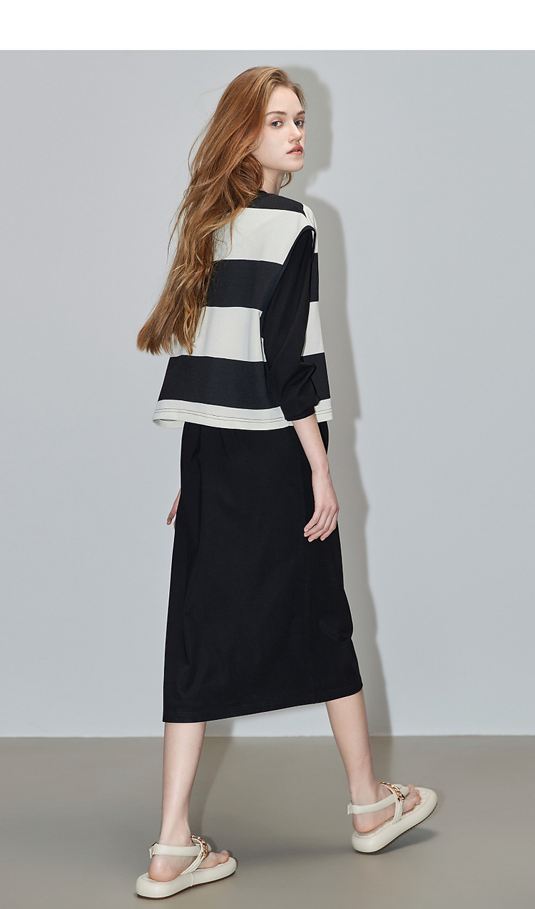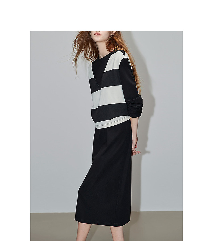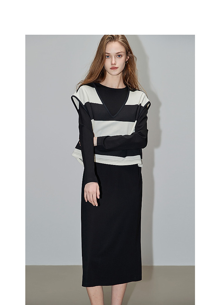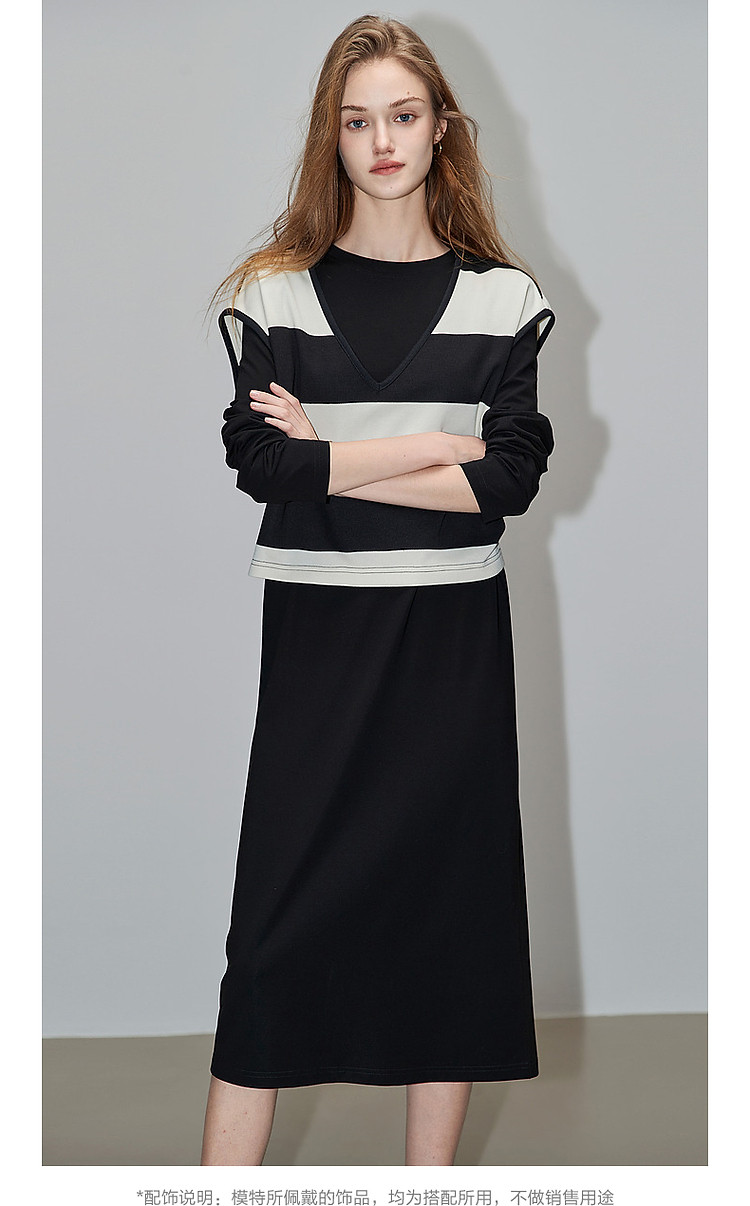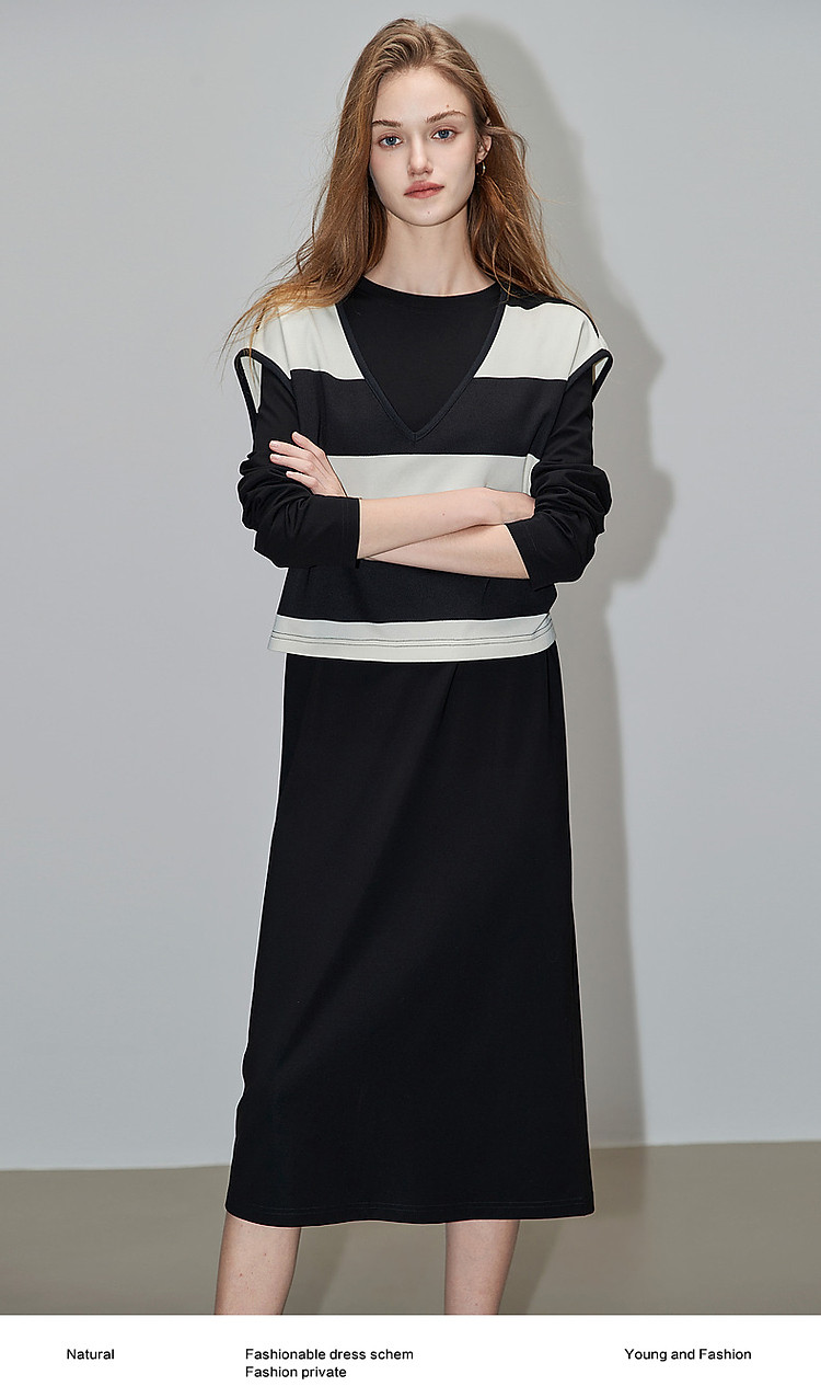 商品名称:【懒人休闲套装】春秋新时尚垂感罗马布连衣裙箱型条纹马甲两件套 723841