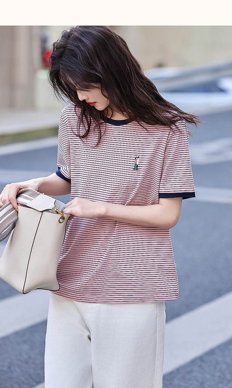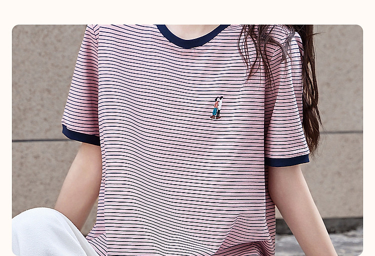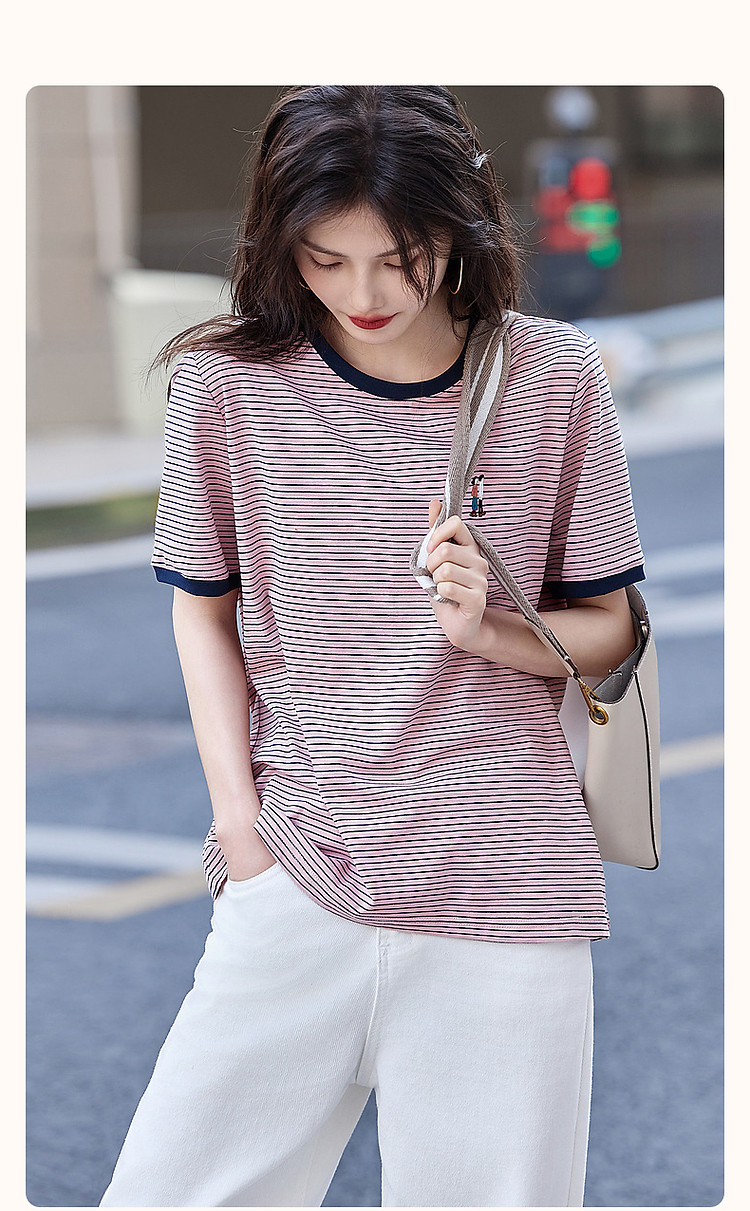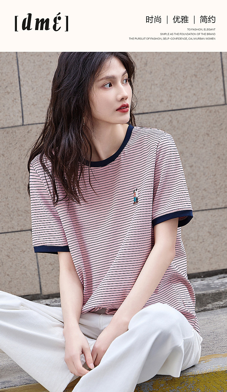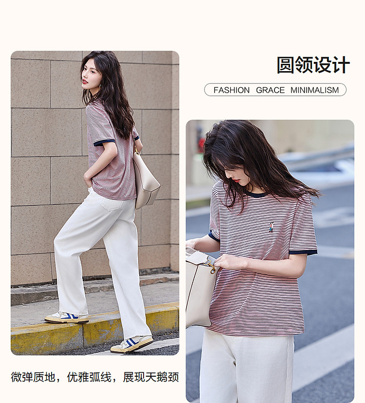 商品名称:【复古情怀】夏季圆领条纹撞色短袖t恤女刺绣时髦舒适女式t恤 846529