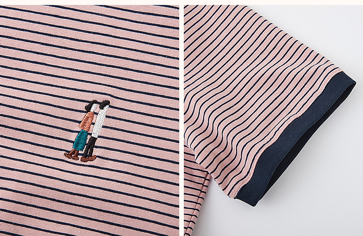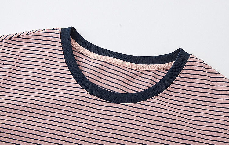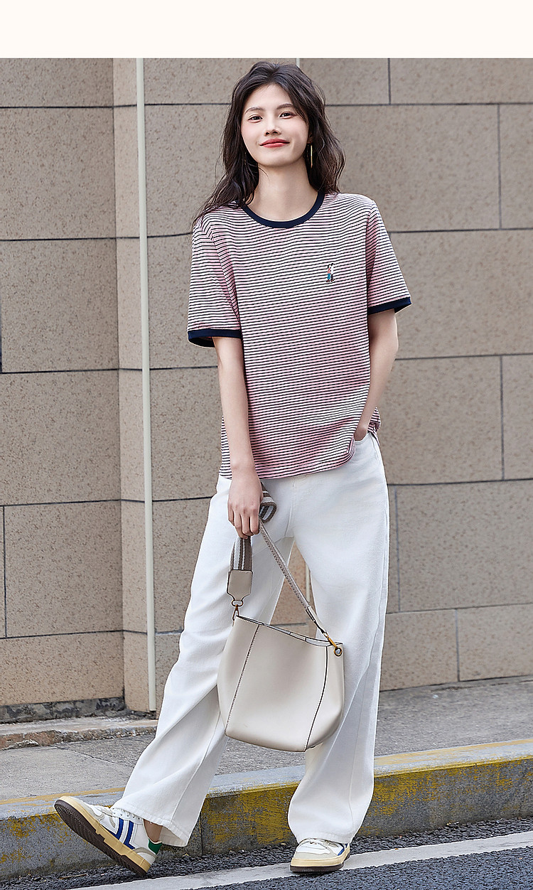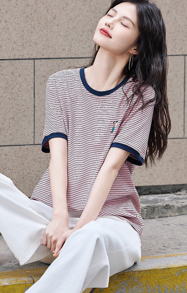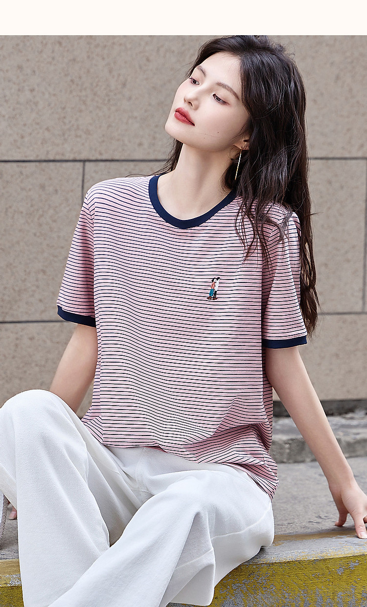 商品名称:【复古情怀】夏季圆领条纹撞色短袖t恤女刺绣时髦舒适女式t恤 846529