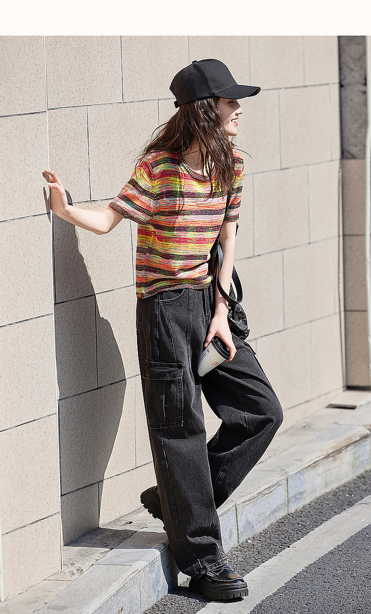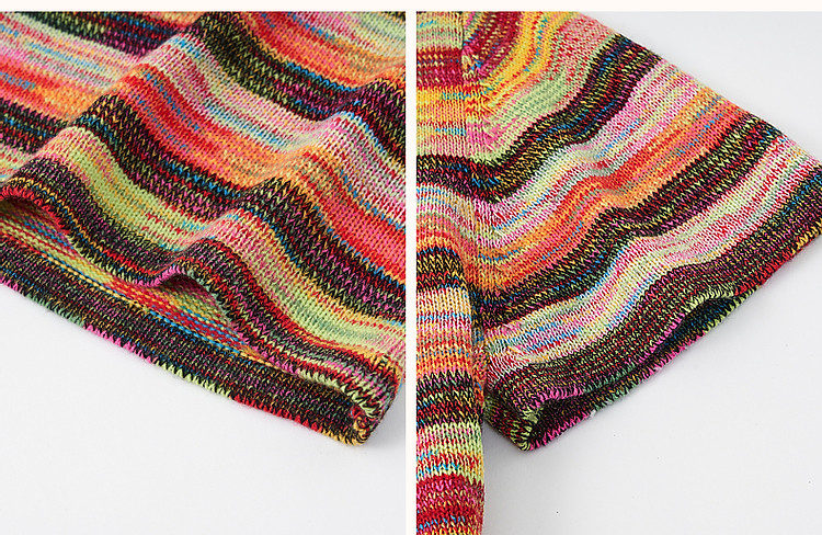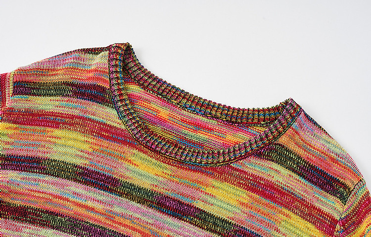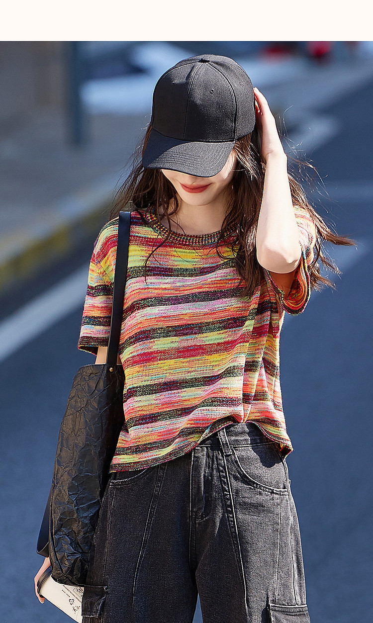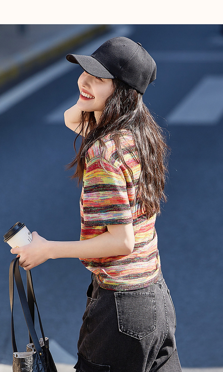 商品名称:【段染纱撞色新风尚】夏季减龄圆领线衫条纹短袖针织衫女上衣 609281