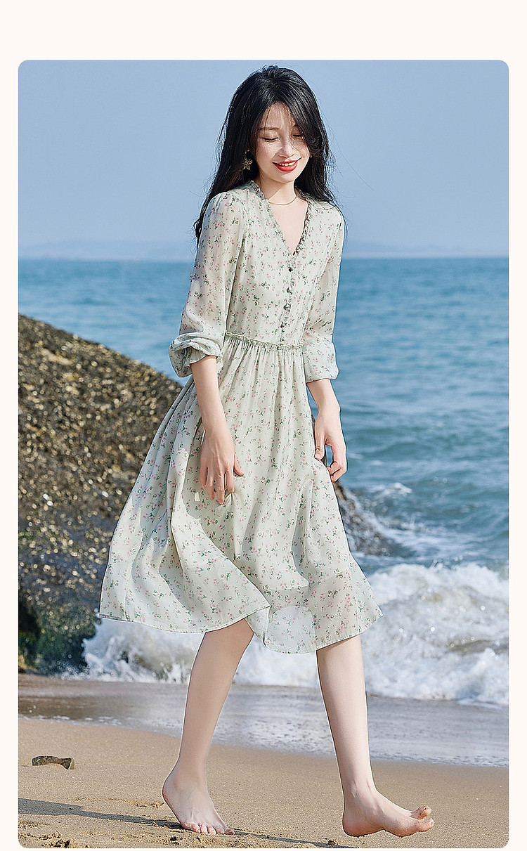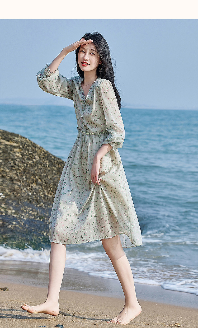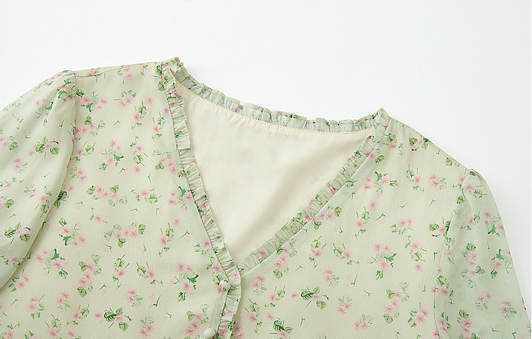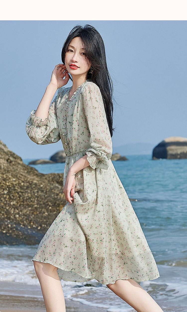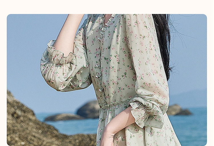 商品名称:【假日薄荷曼波】春秋法式V领印花泡泡袖荷叶边绑带A字连衣裙 229633
