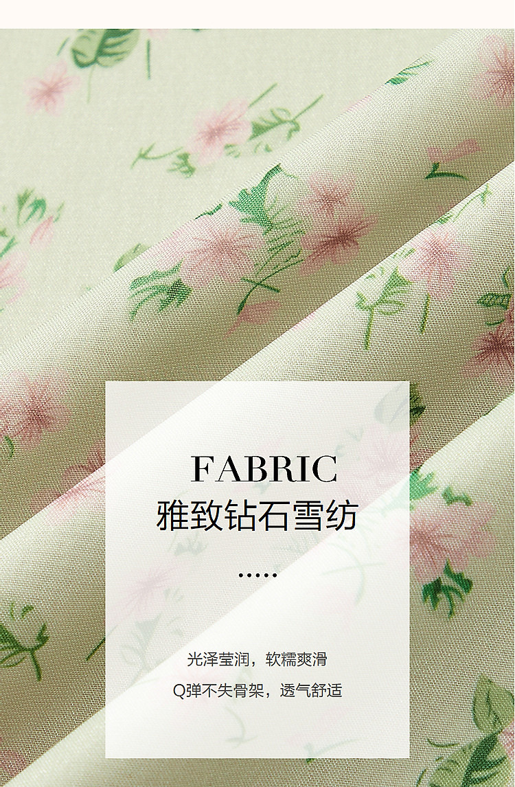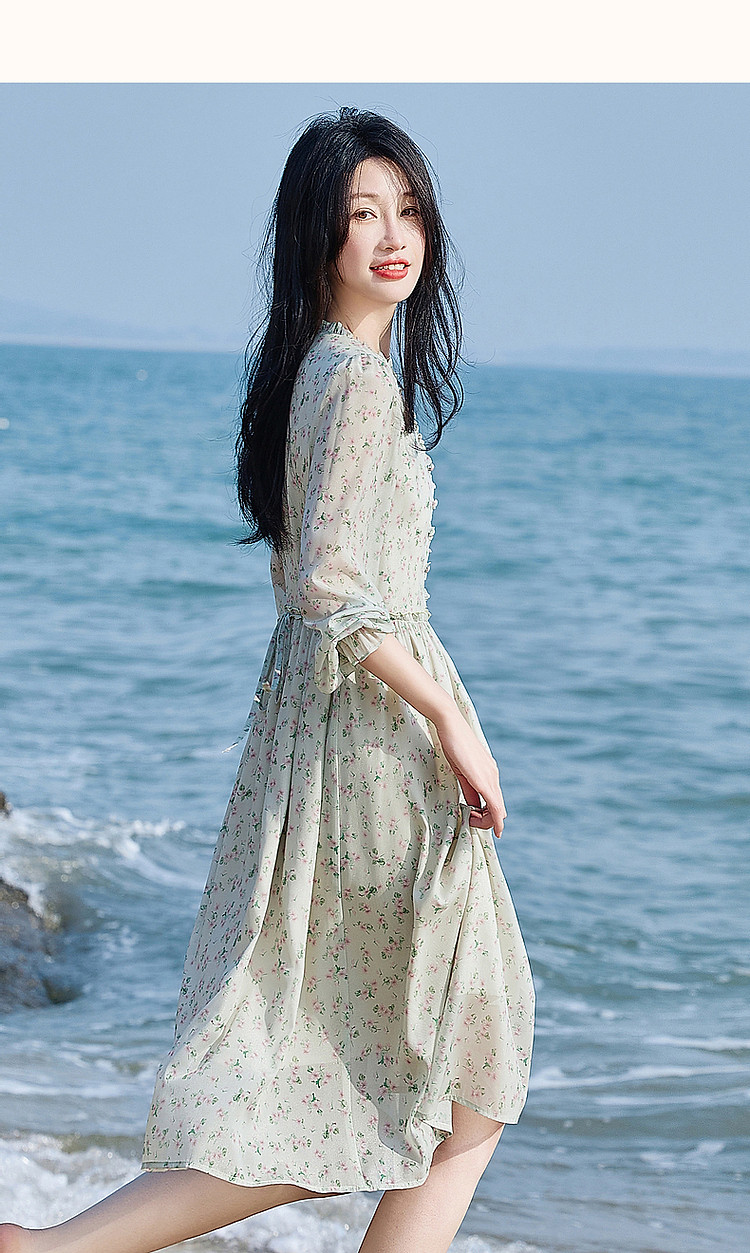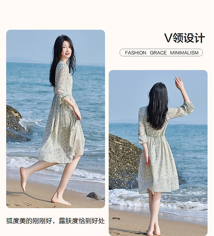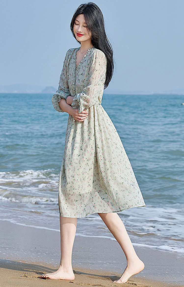 商品名称:【假日薄荷曼波】春秋法式V领印花泡泡袖荷叶边绑带A字连衣裙 229633