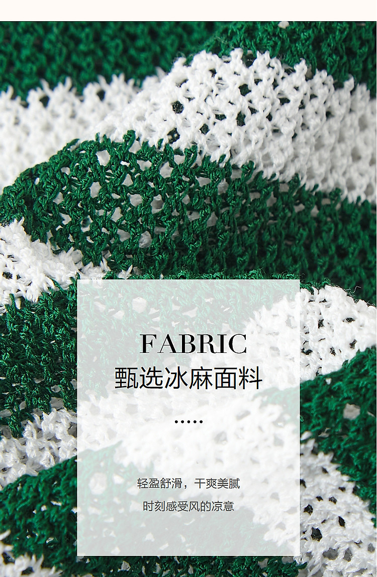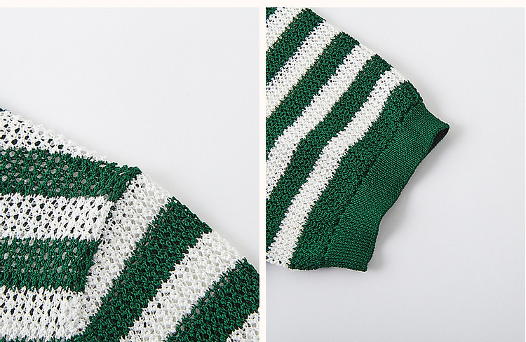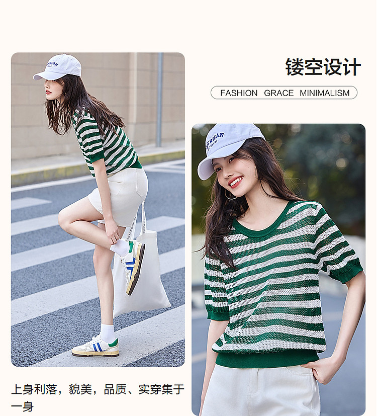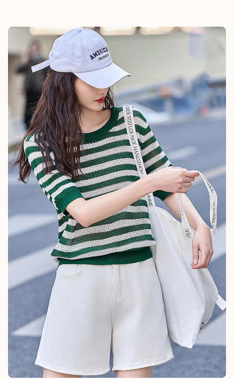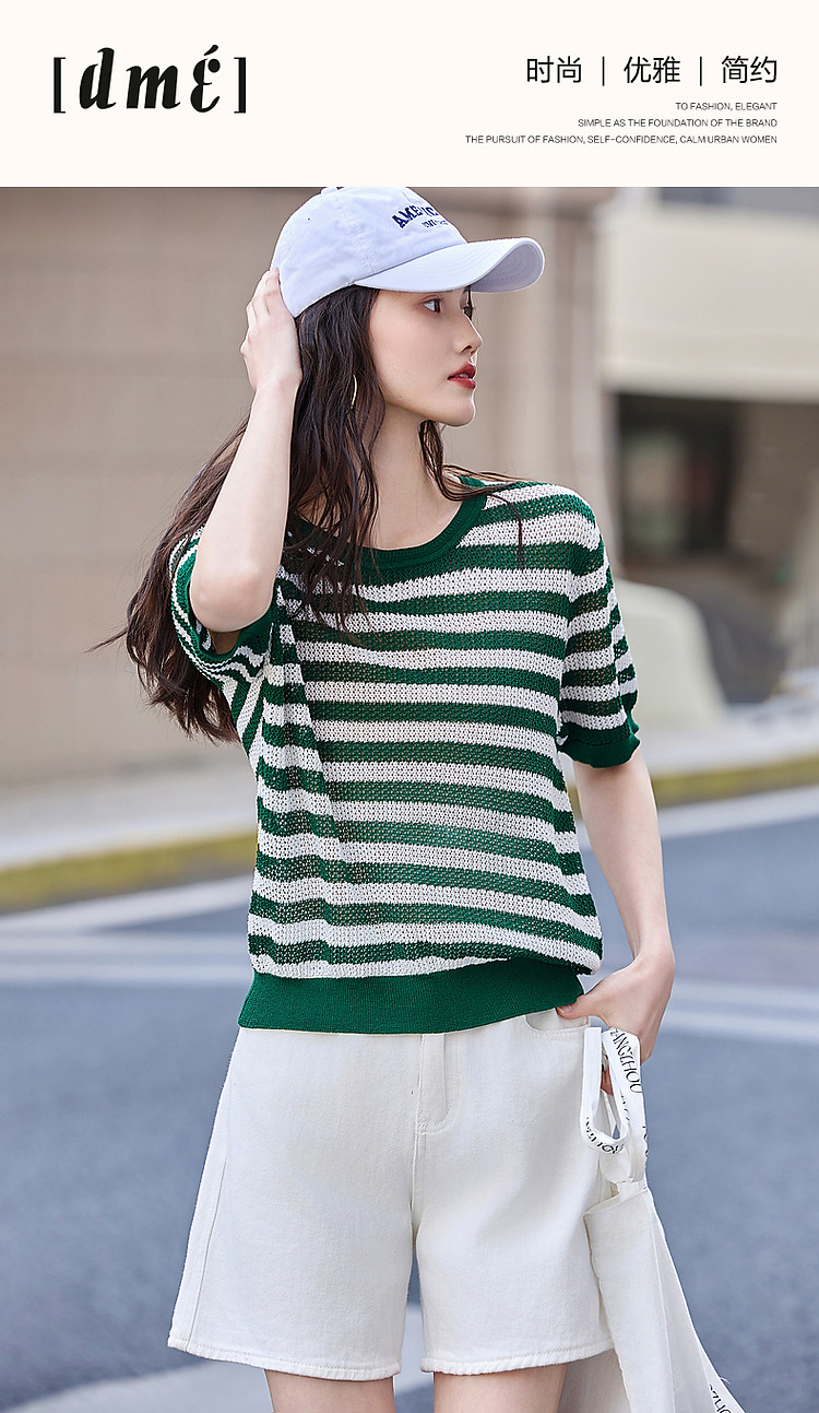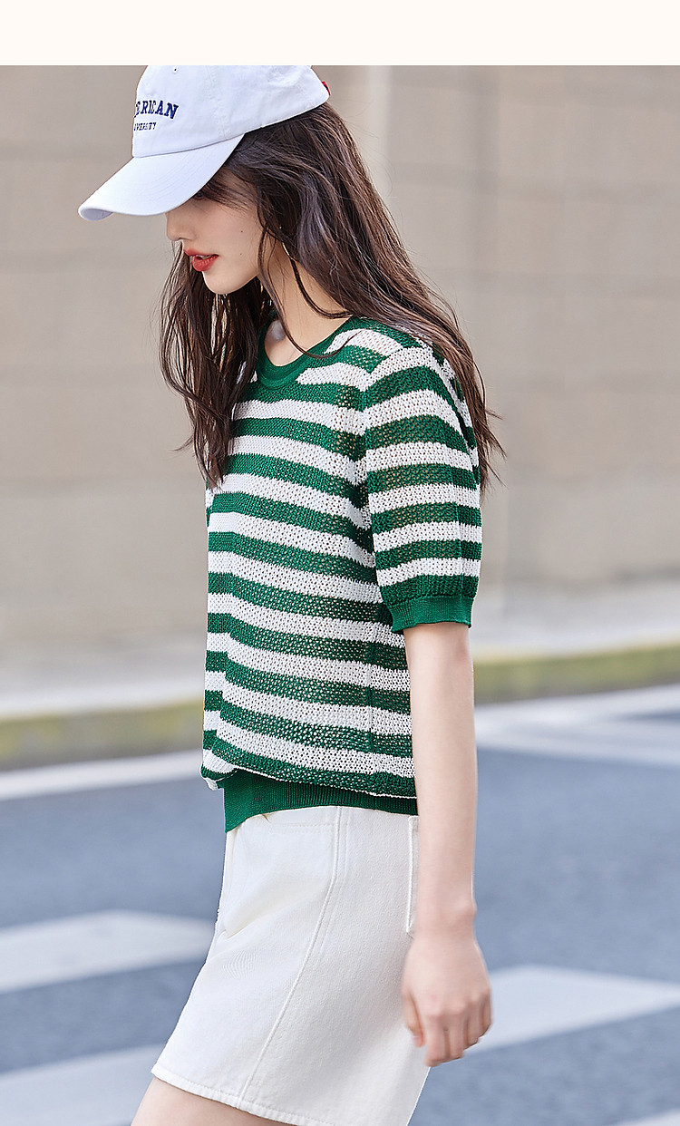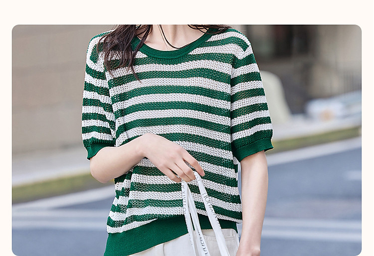 商品名称:【法风复古通勤】夏季爽滑冰麻短袖线衫条纹镂空撞色针织衫女上衣 506881