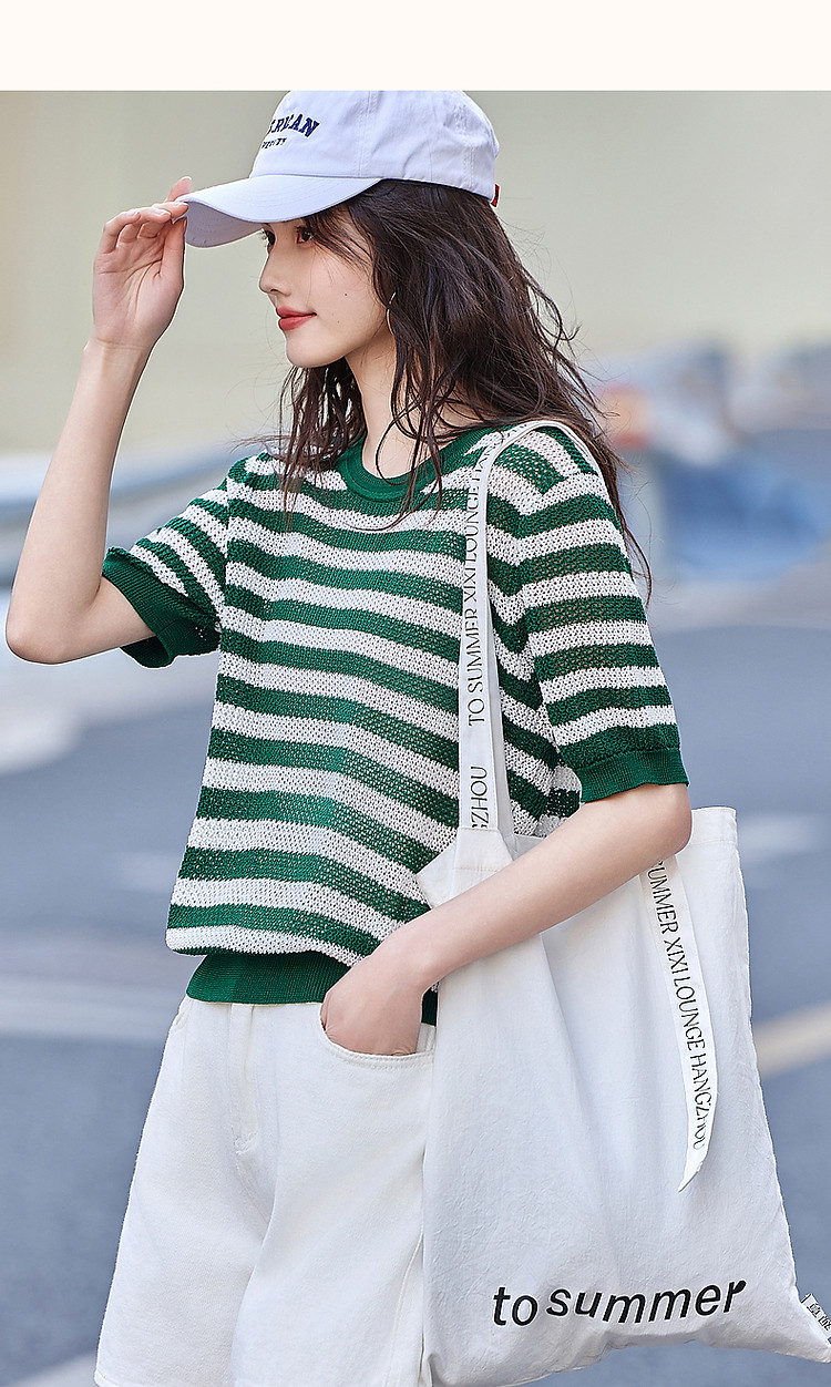 【法风复古通勤】夏季爽滑冰麻短袖线衫条纹镂空撞色针织衫女上衣 506881