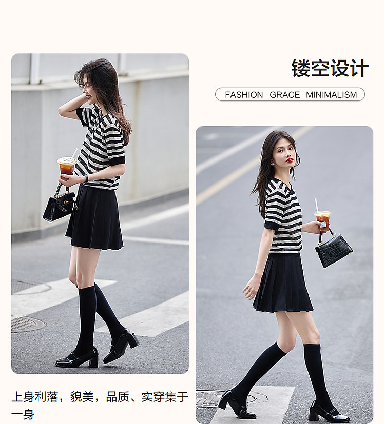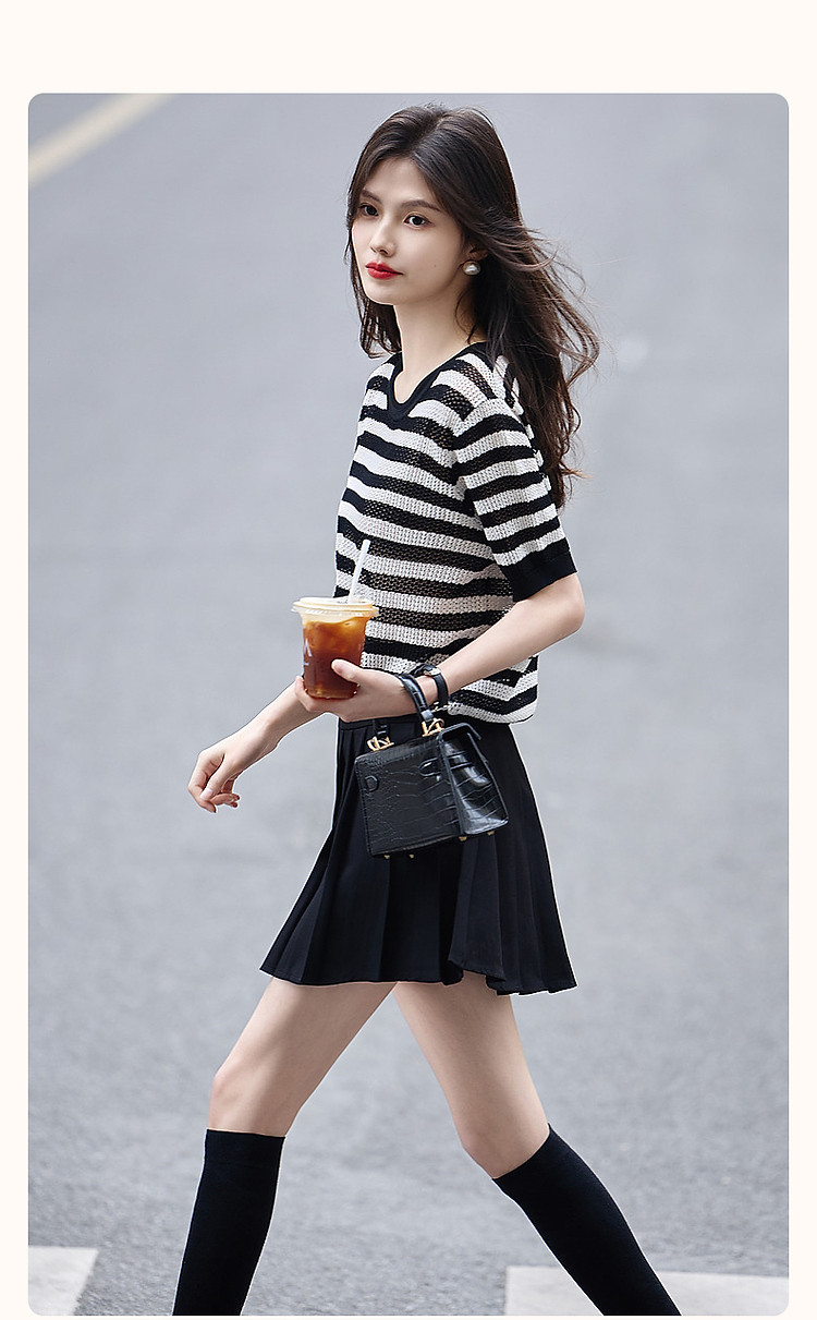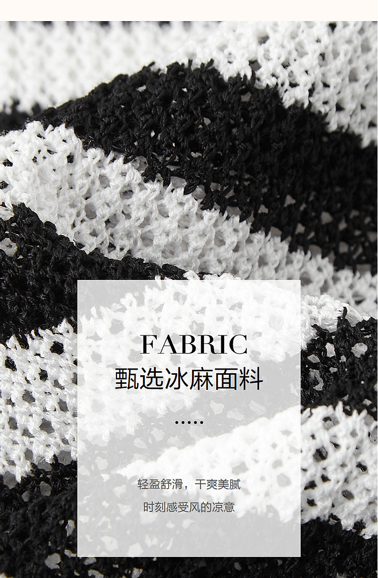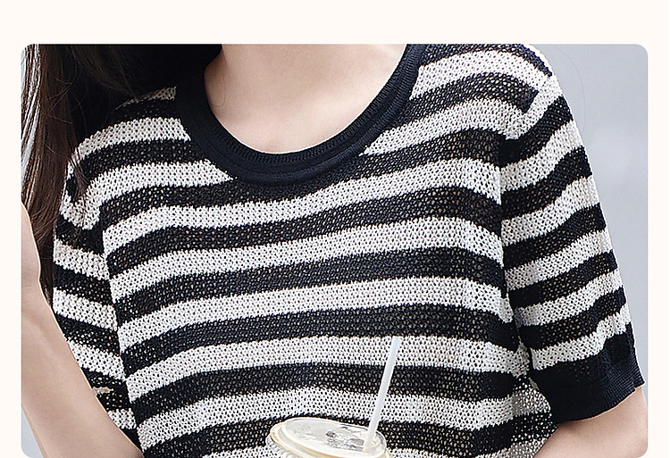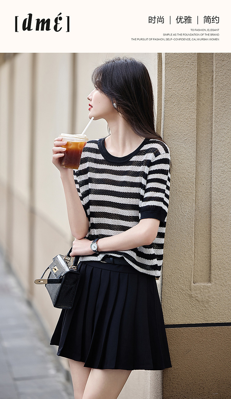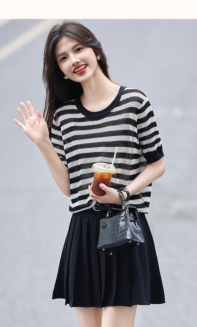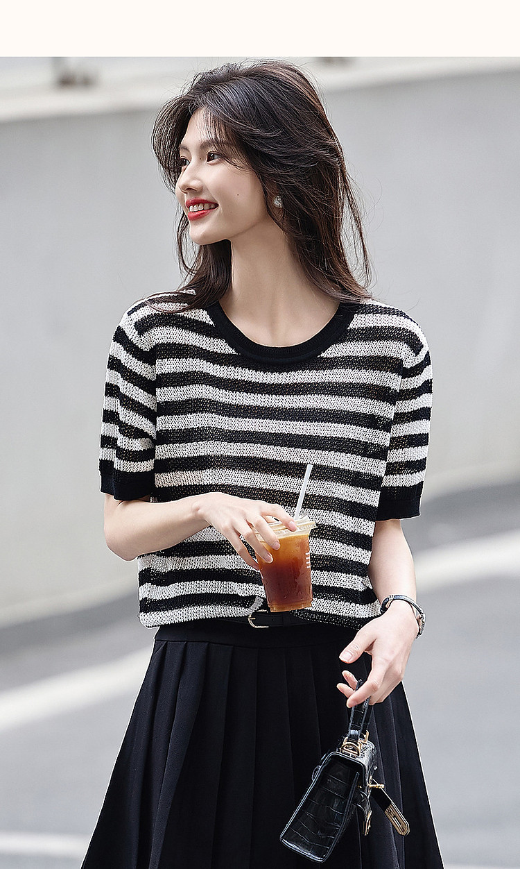 商品名称:【法风复古通勤】夏季爽滑冰麻短袖线衫条纹镂空撞色针织衫女上衣 445441