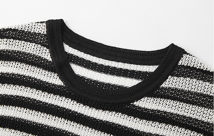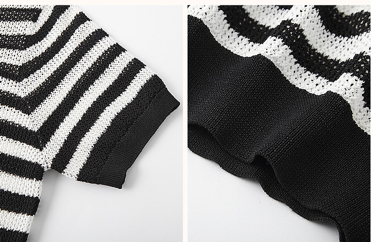 【法风复古通勤】夏季爽滑冰麻短袖线衫条纹镂空撞色针织衫女上衣 445441