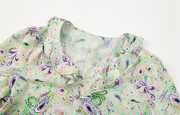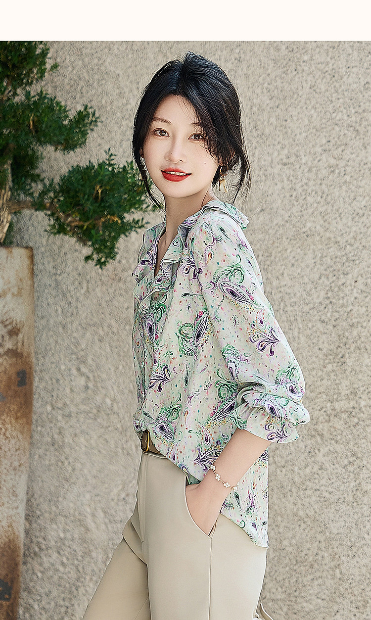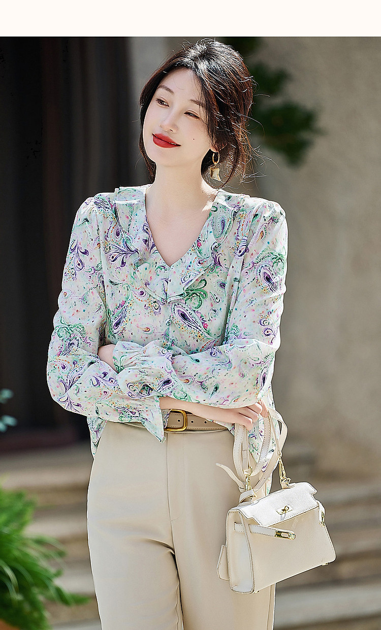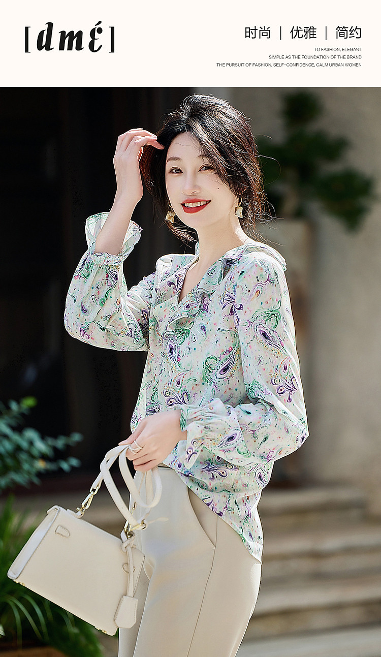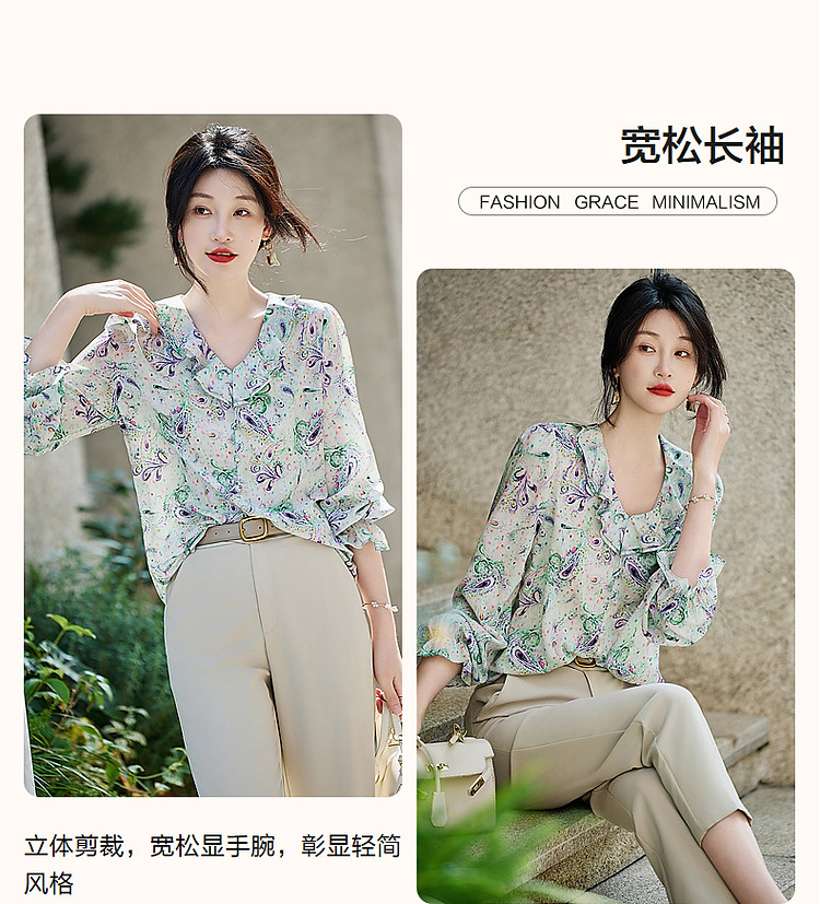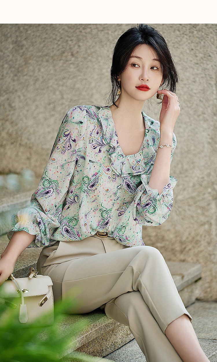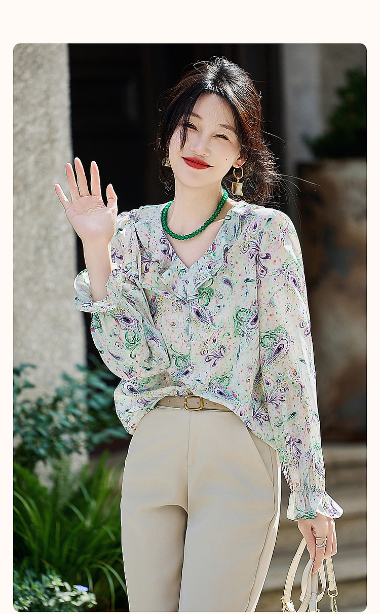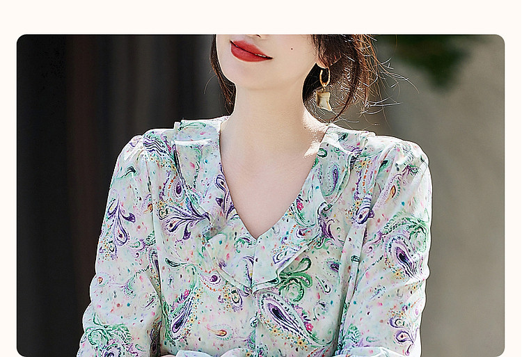 商品名称:【甄选仿丝双绉】春秋V领抽象印花衬衫木耳边长袖衬衣女装上衣 181761