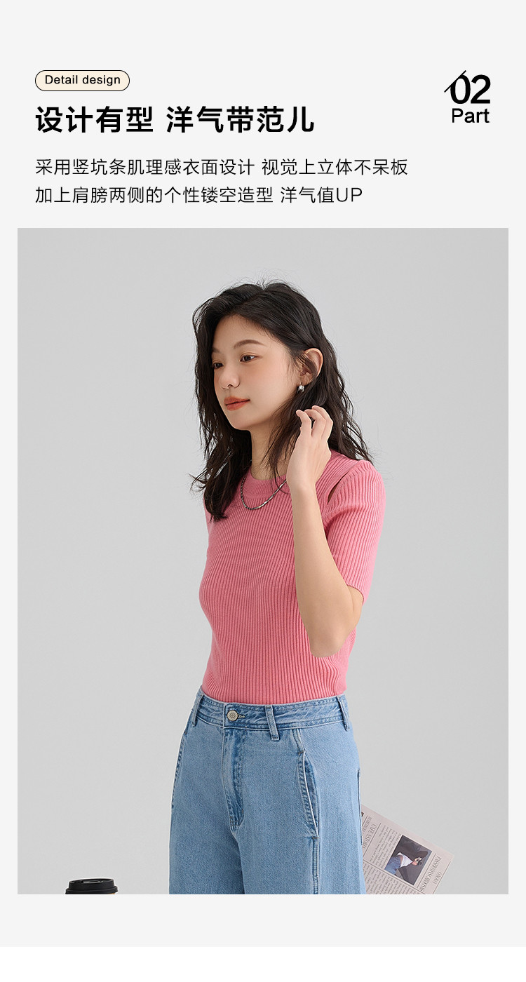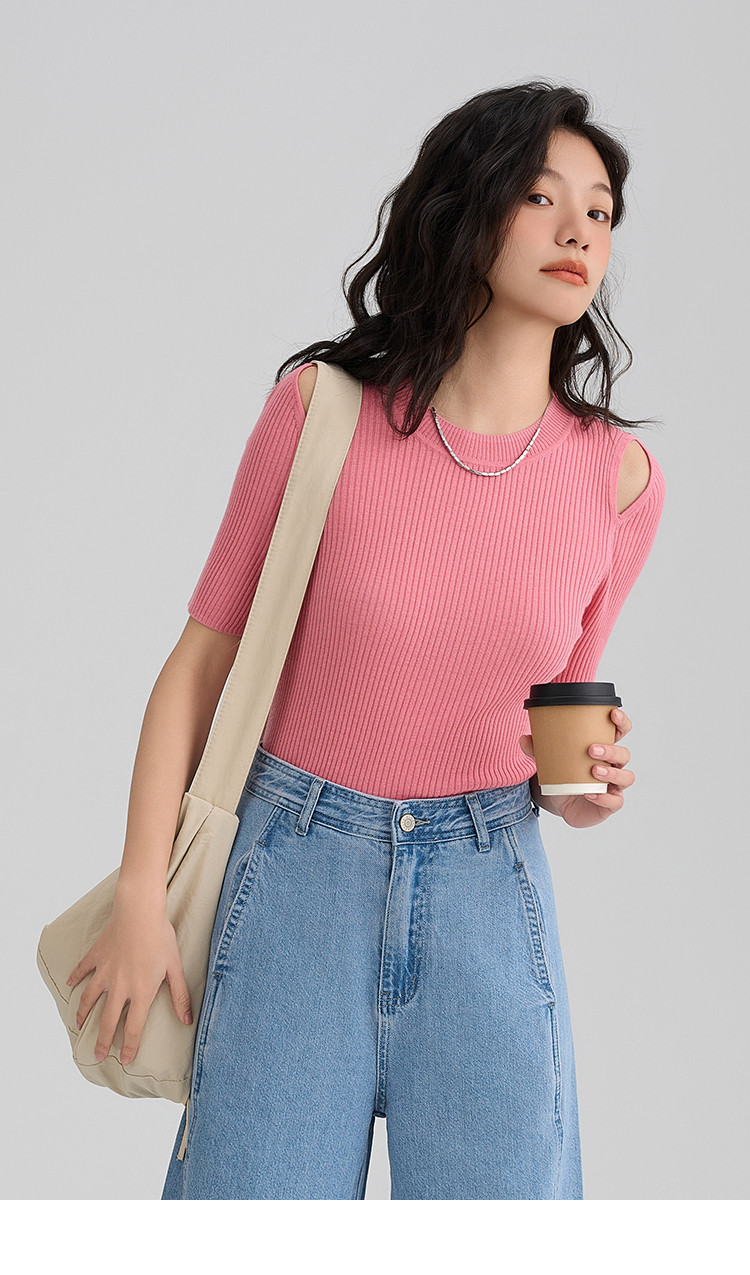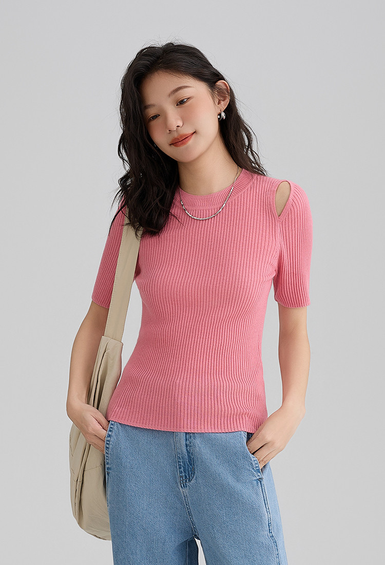 【温柔嫩粉针织衫】夏款个性肩部镂空简约减龄修身显瘦 942594