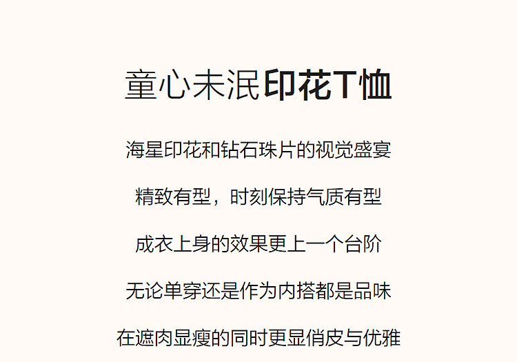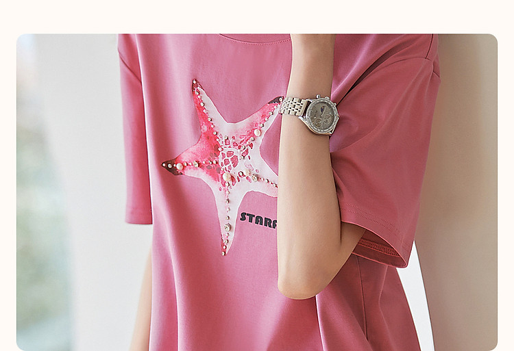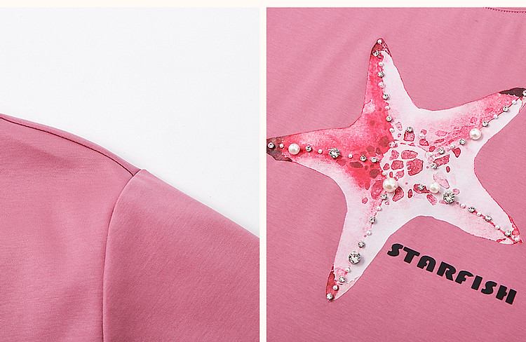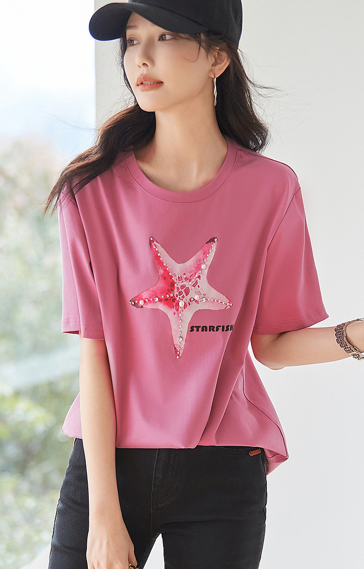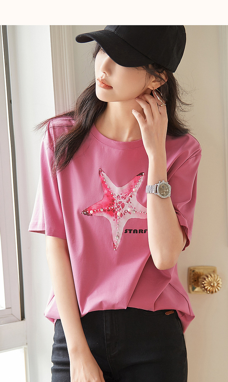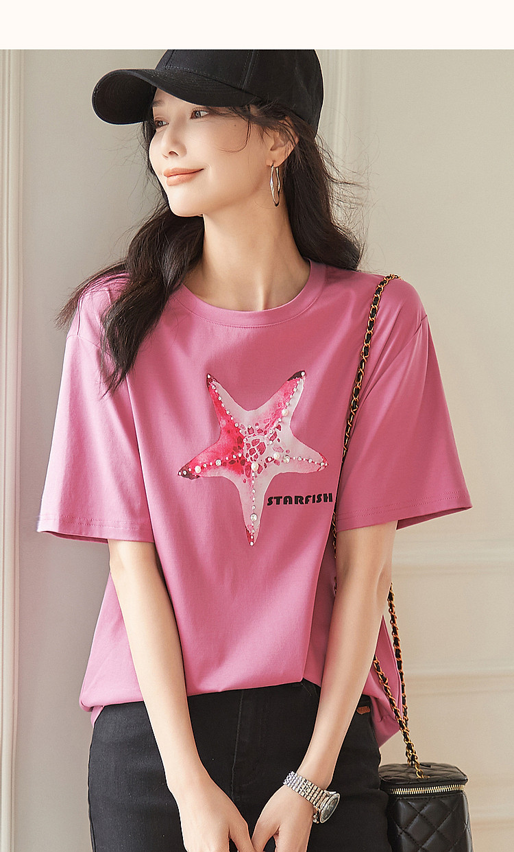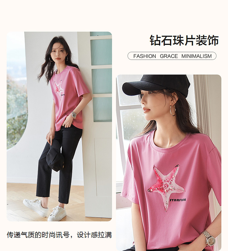 商品名称:【童心未泯】夏圆领减龄海星印花短袖t恤女钻石珠片装饰女式t恤 102593