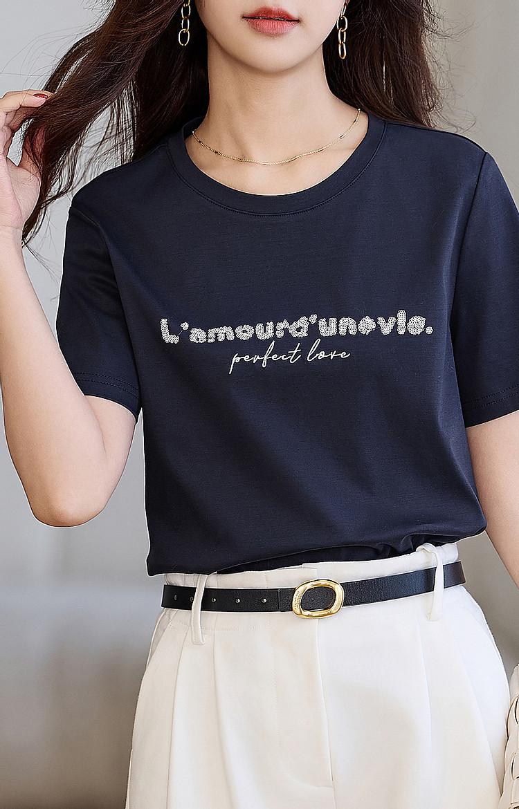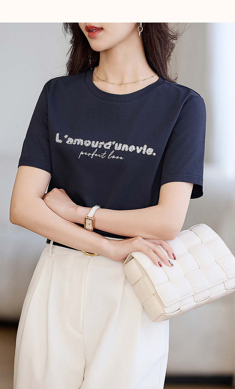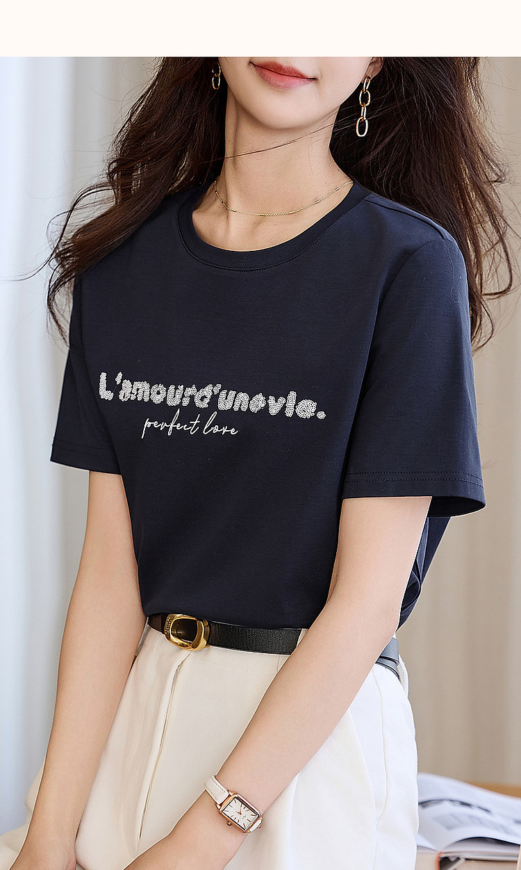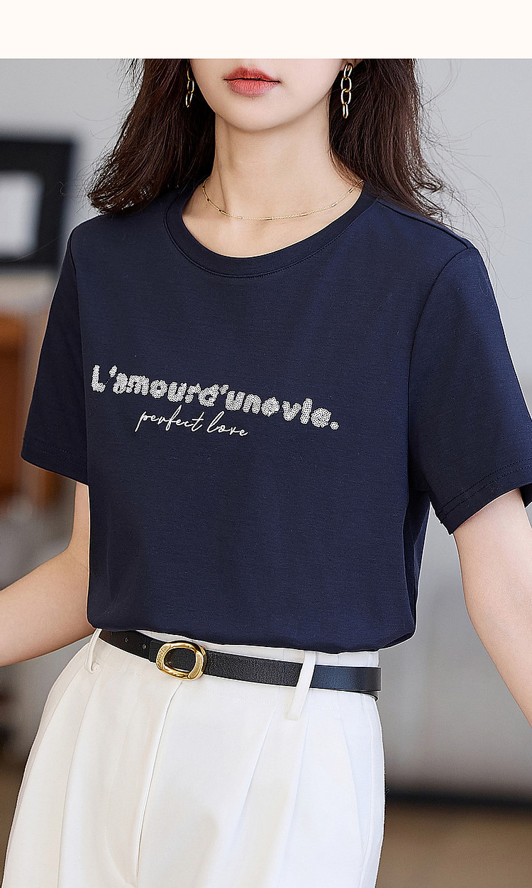 商品名称:【都市时髦棉氨t恤】春秋新圆领弹力短袖女字母珠片绣花女式t恤 227137