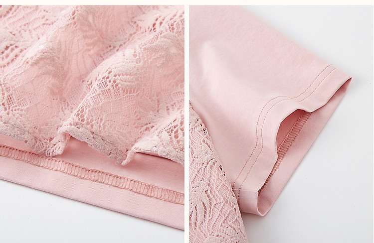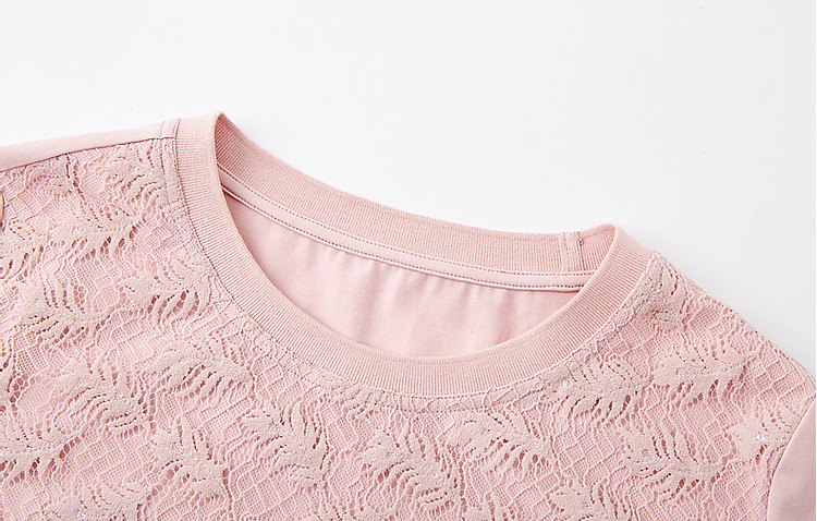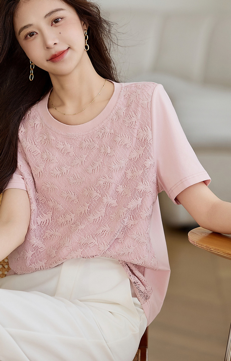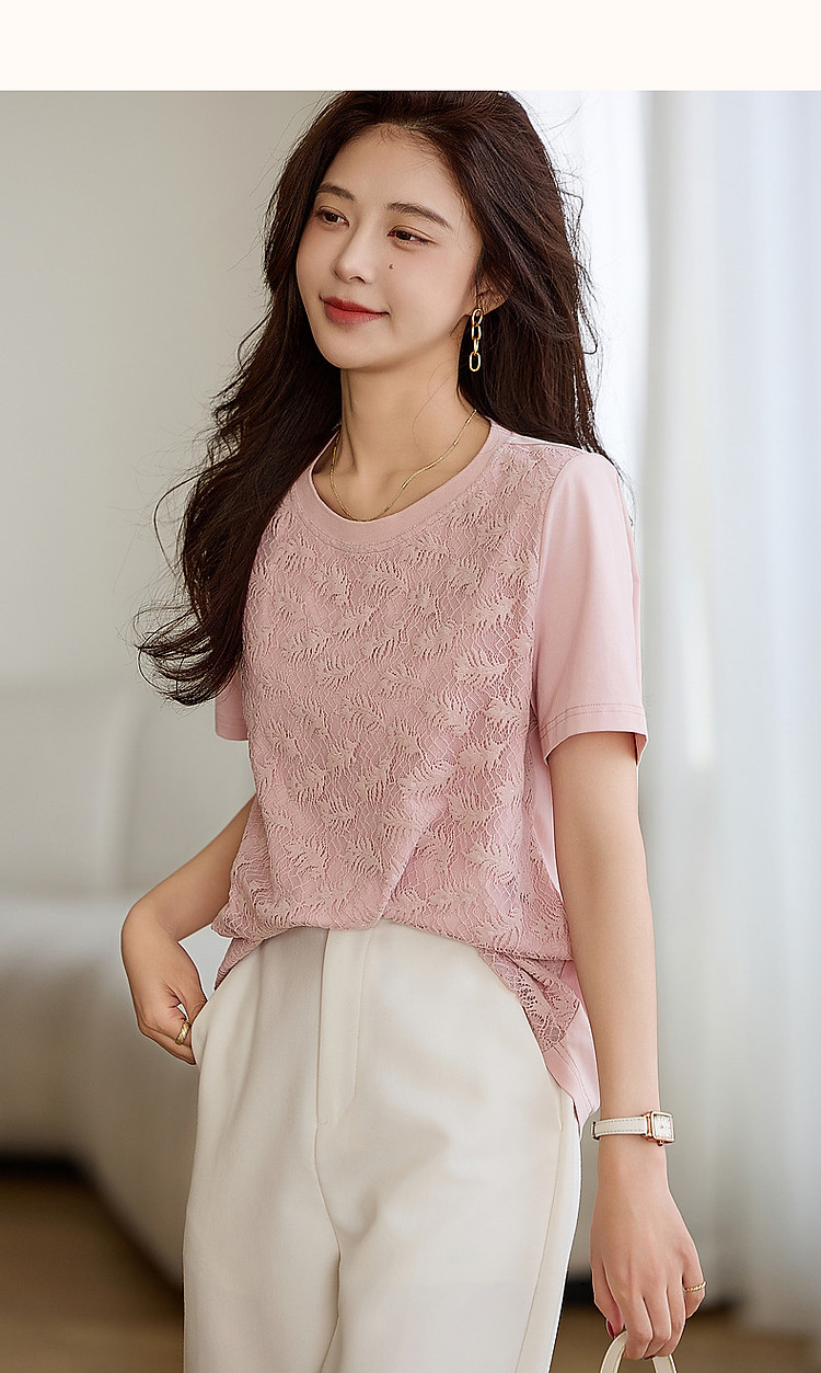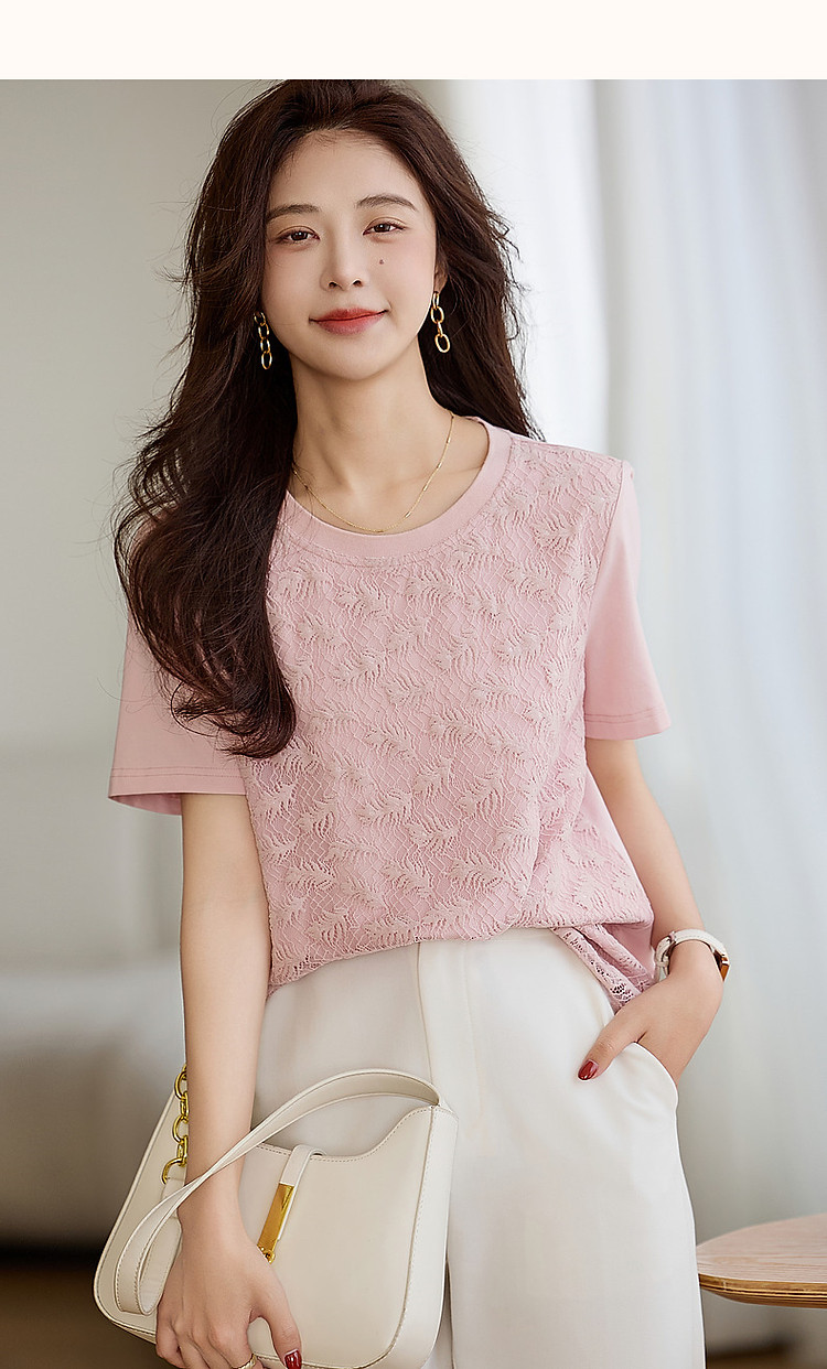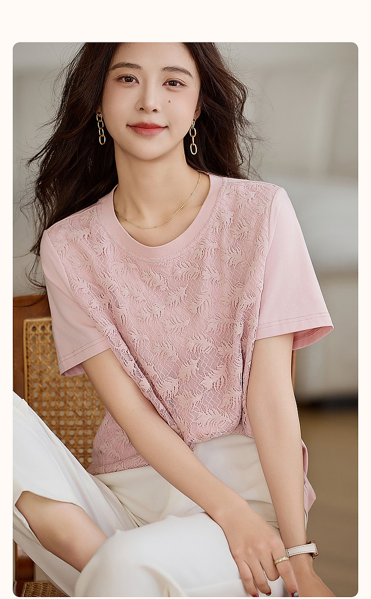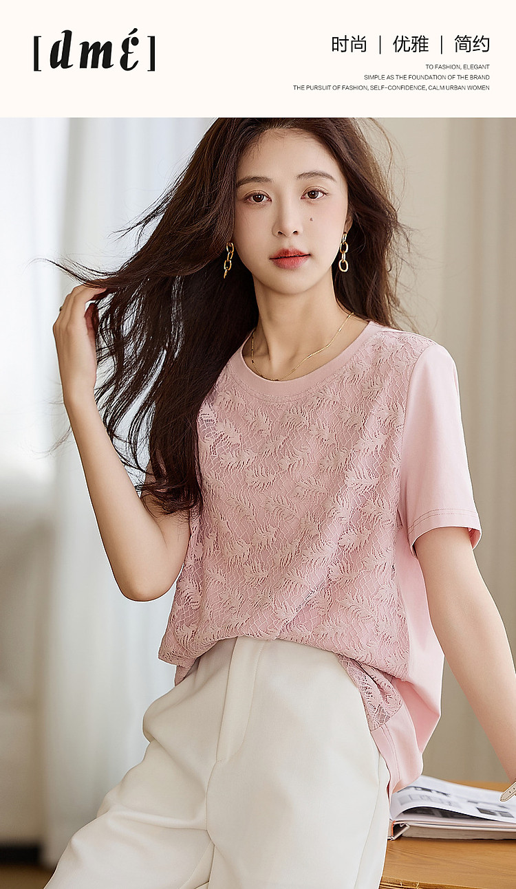 【盘活夏日衣橱】春圆领短袖微弹棉氨上衣女蕾丝拼接女士t恤女 057281