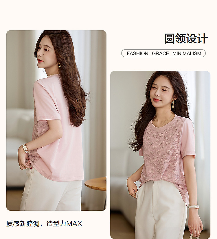 商品名称:【盘活夏日衣橱】春圆领短袖微弹棉氨上衣女蕾丝拼接女士t恤女 057281