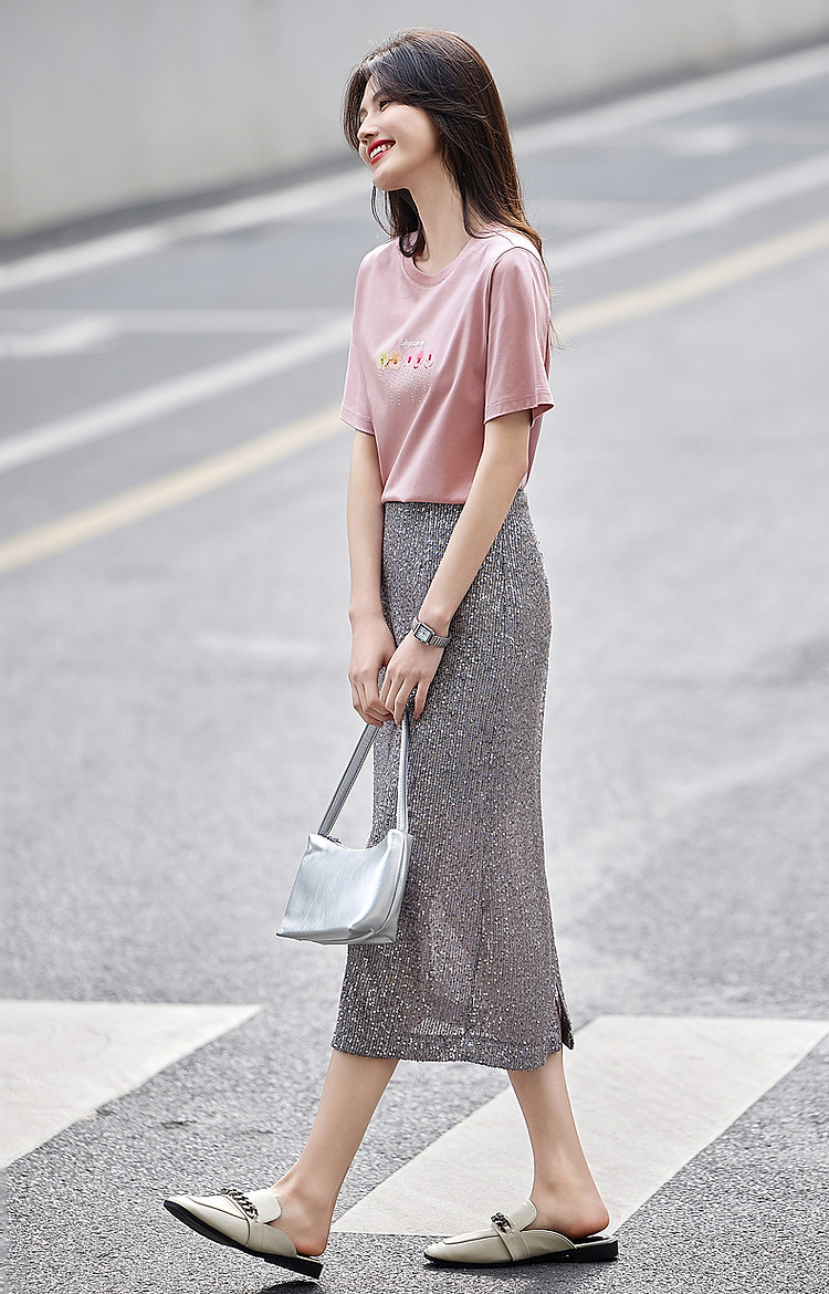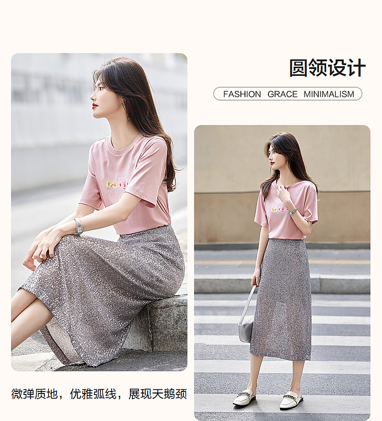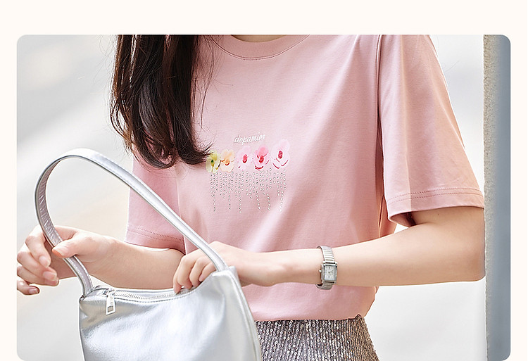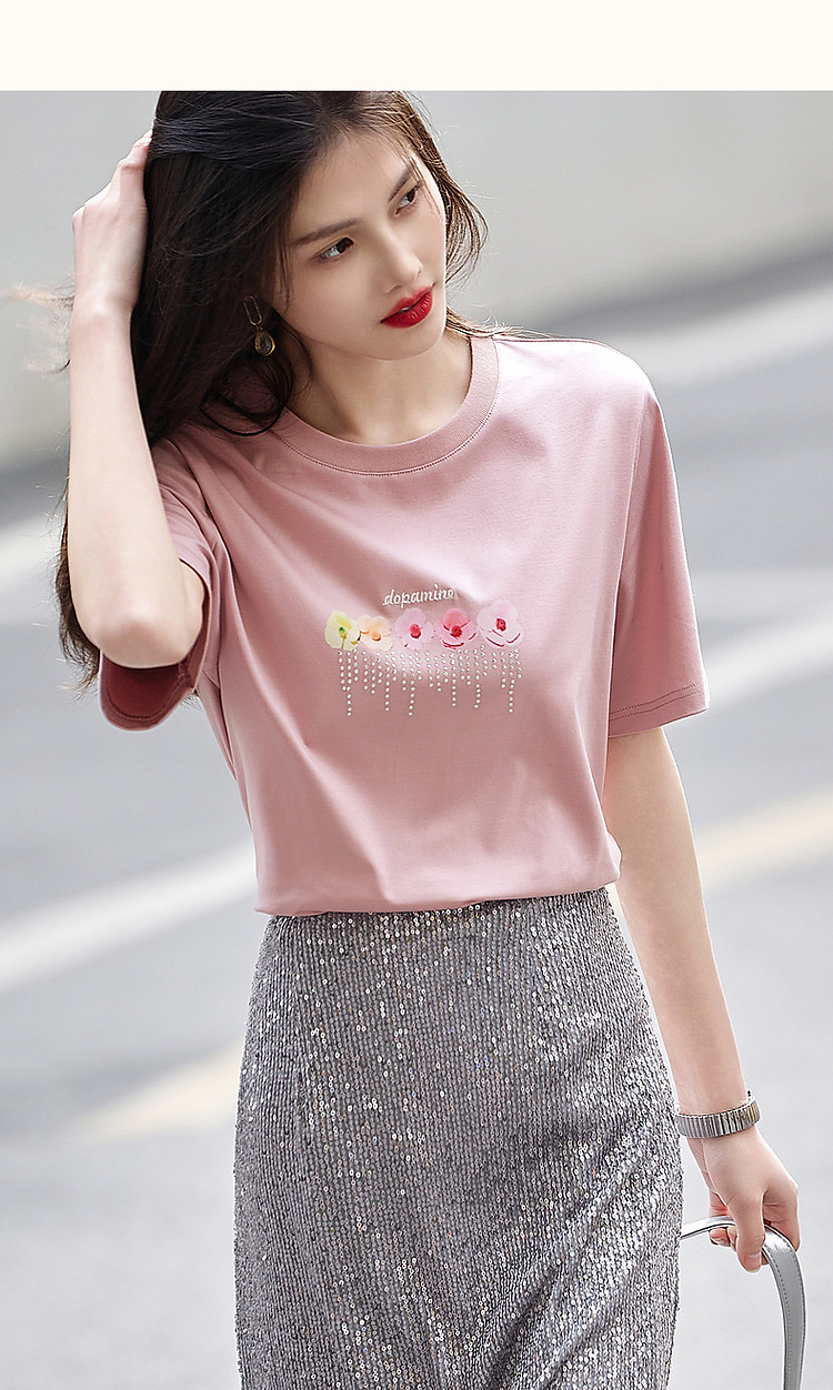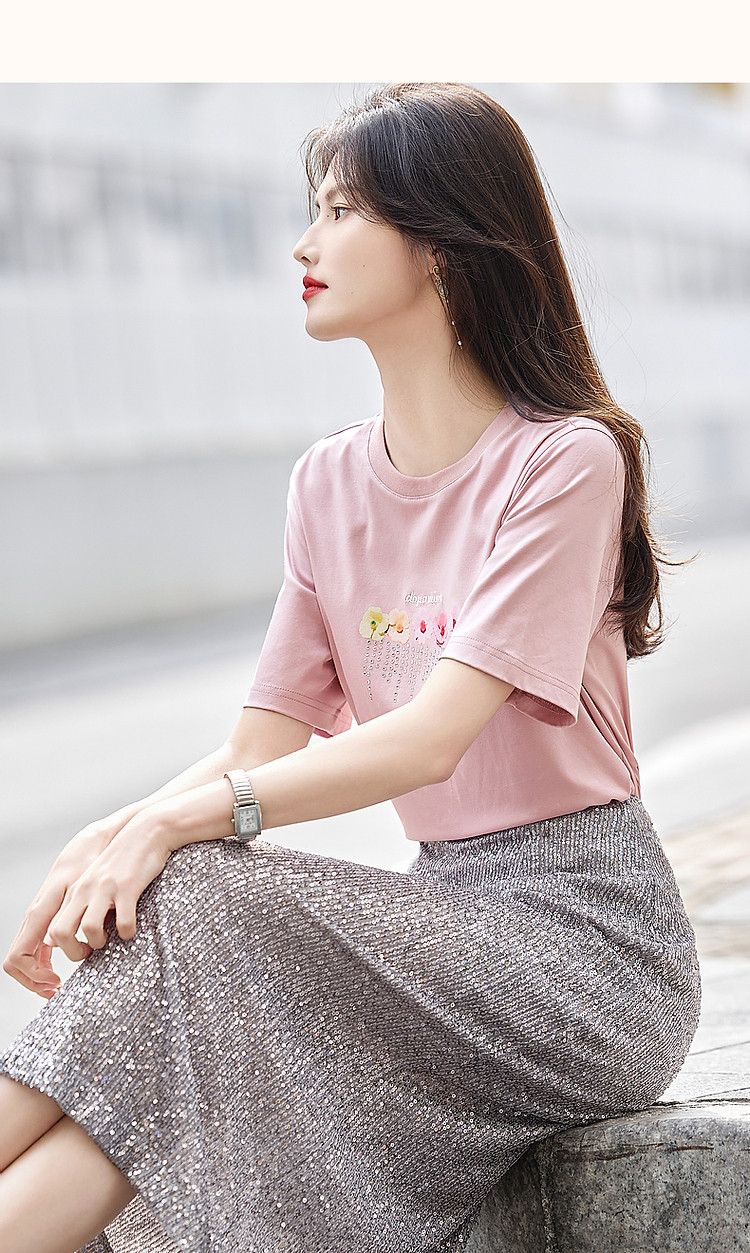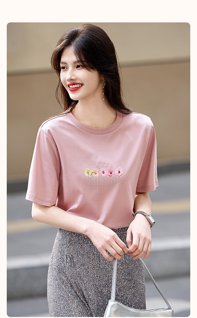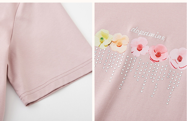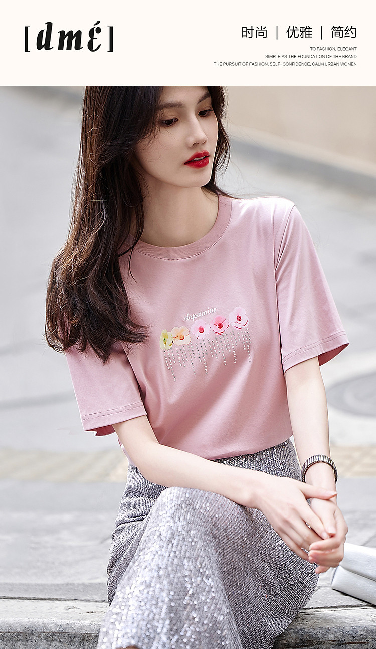 商品名称:【半熟恋人】夏圆领印花烫钻装饰短袖t恤女人味棉氨无压女式t恤 499969