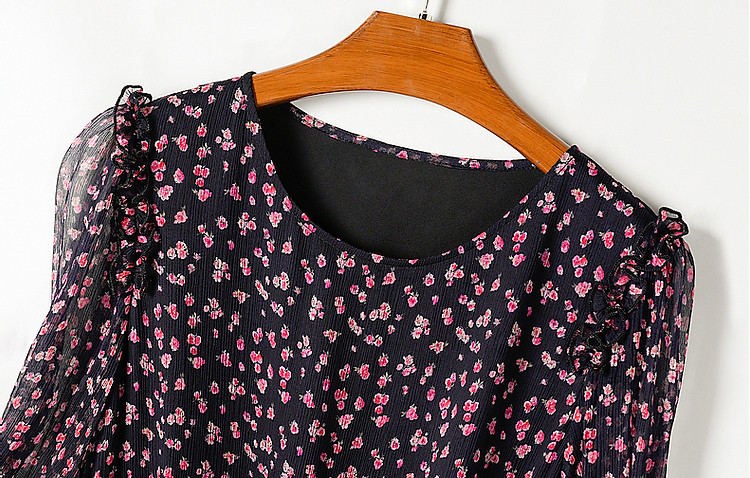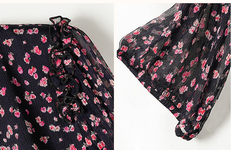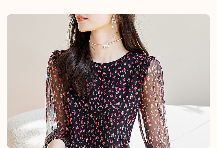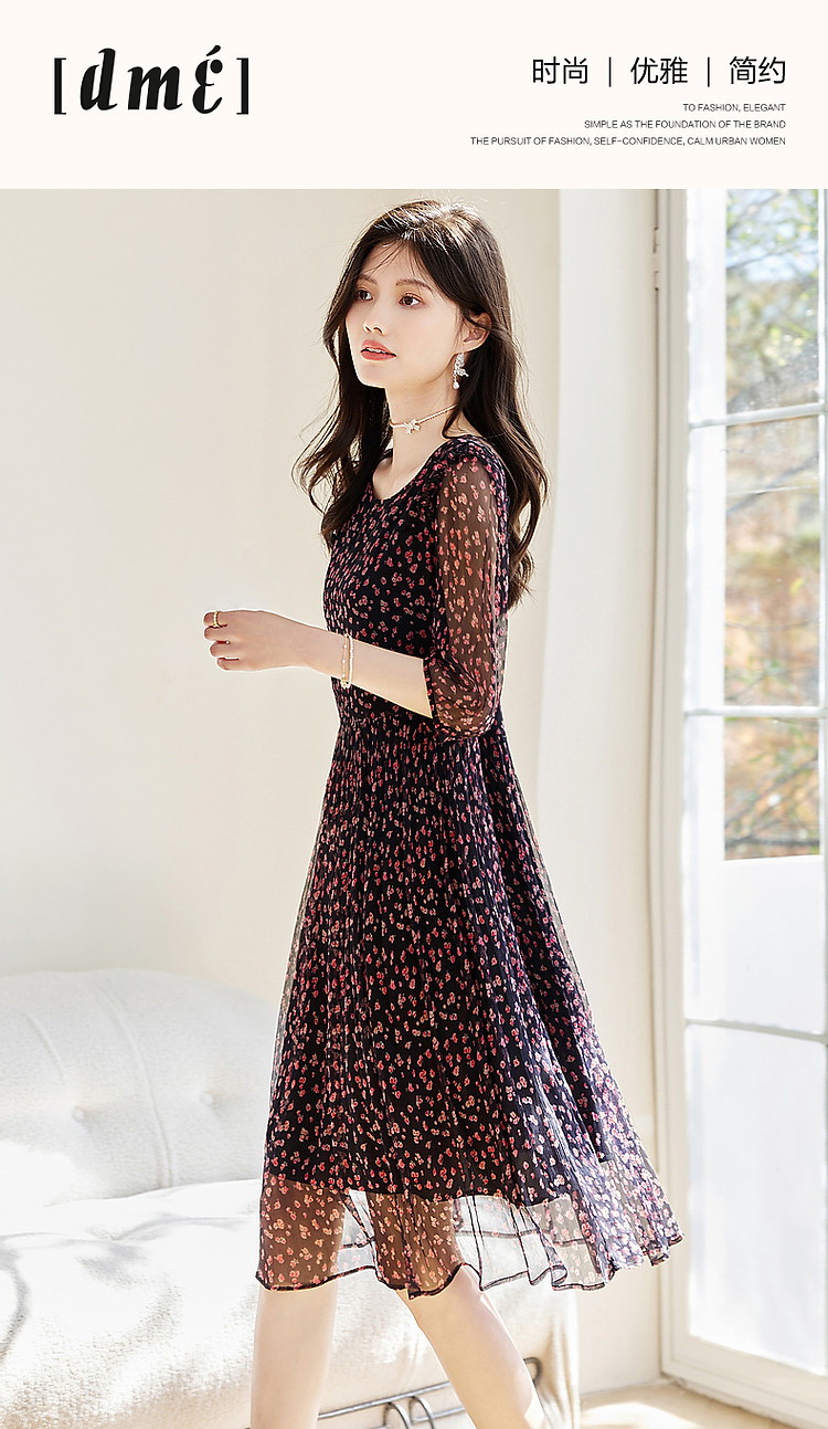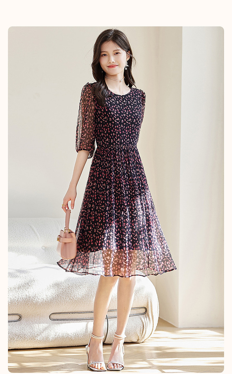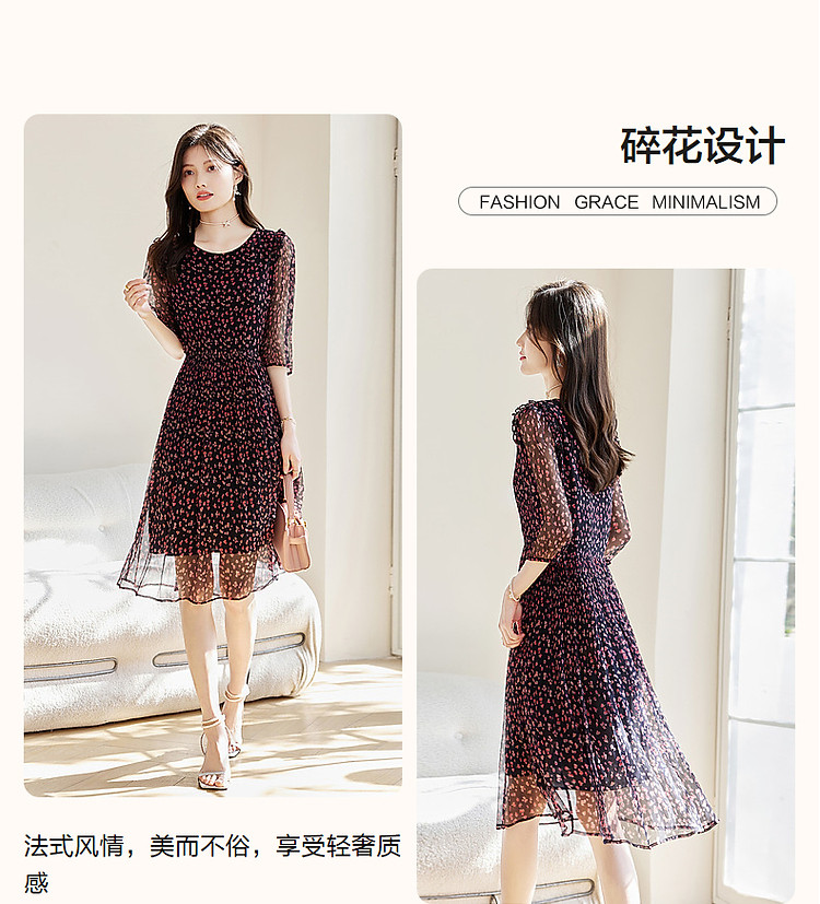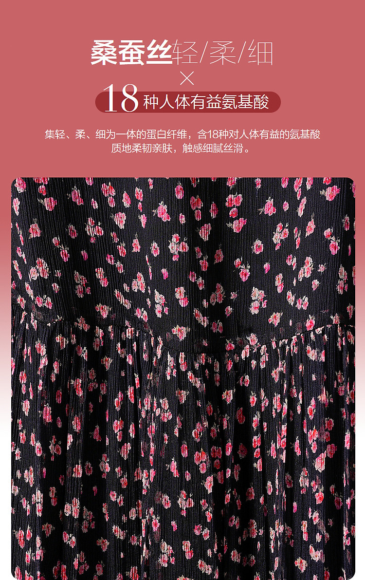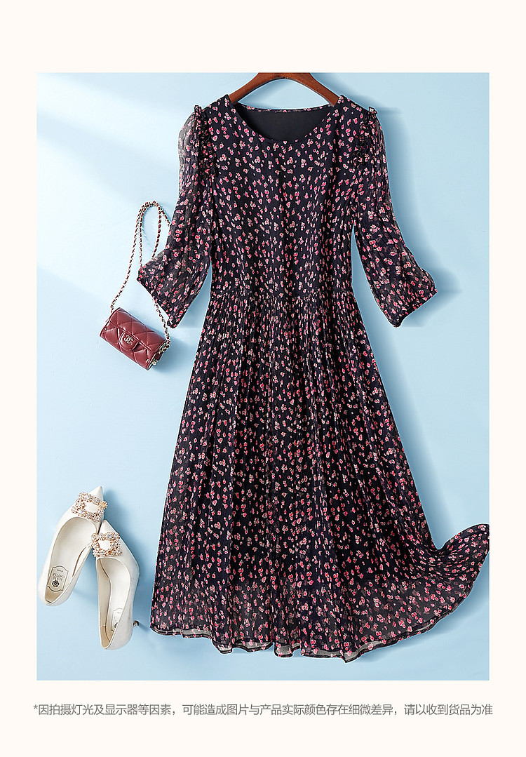商品名称:【浪漫真丝季】春法式丝滑轻奢桑蚕丝碎花五分袖中长连衣裙 616257