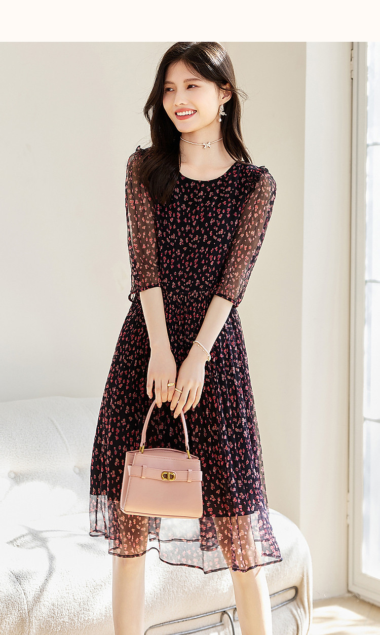 【浪漫真丝季】春法式丝滑轻奢桑蚕丝碎花五分袖中长连衣裙 616257