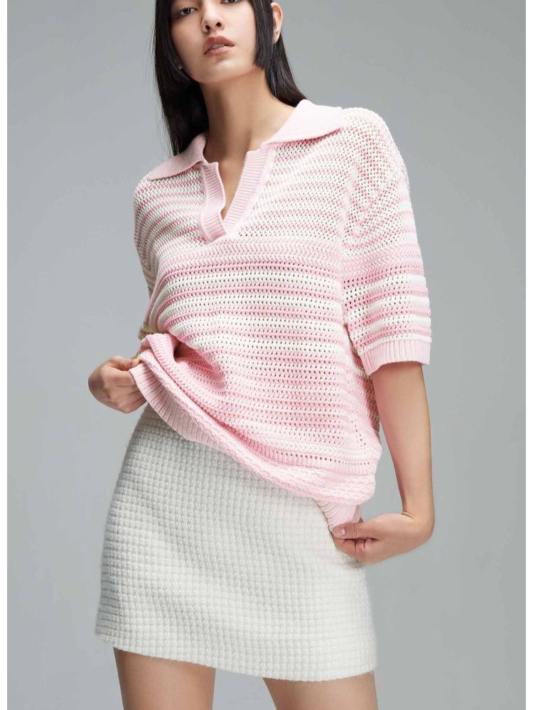 【宽松落肩】春季镂空POLO领落肩短袖针织衫女 520922