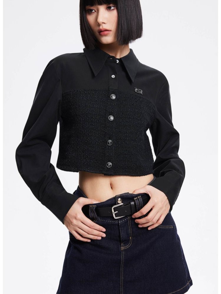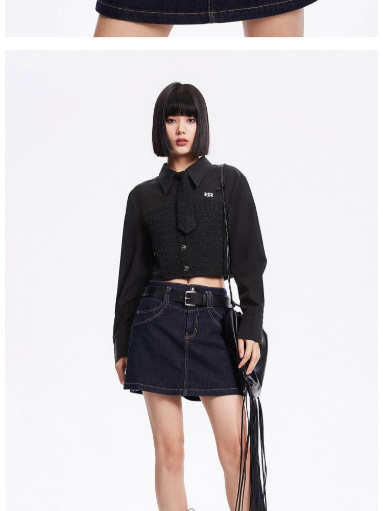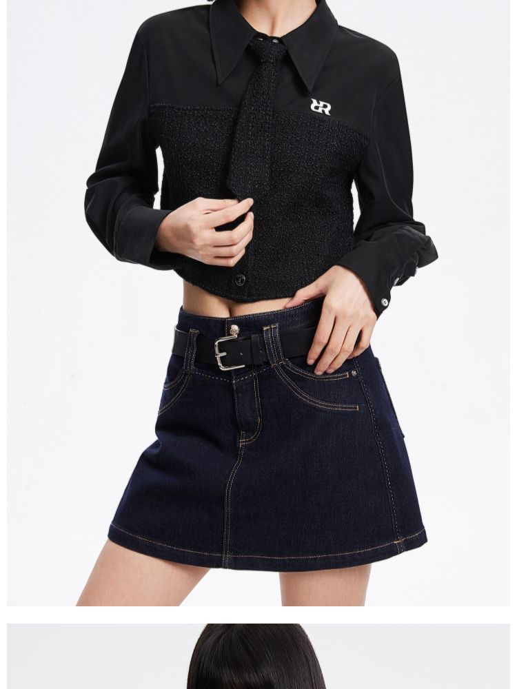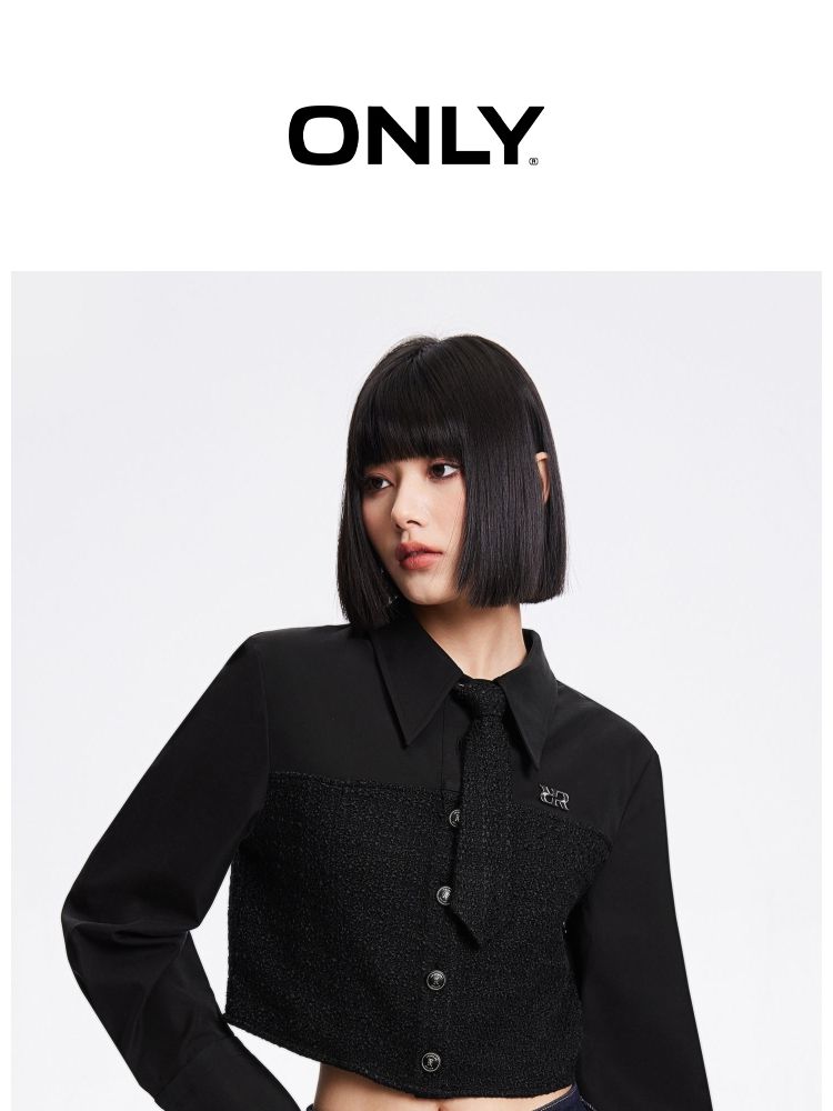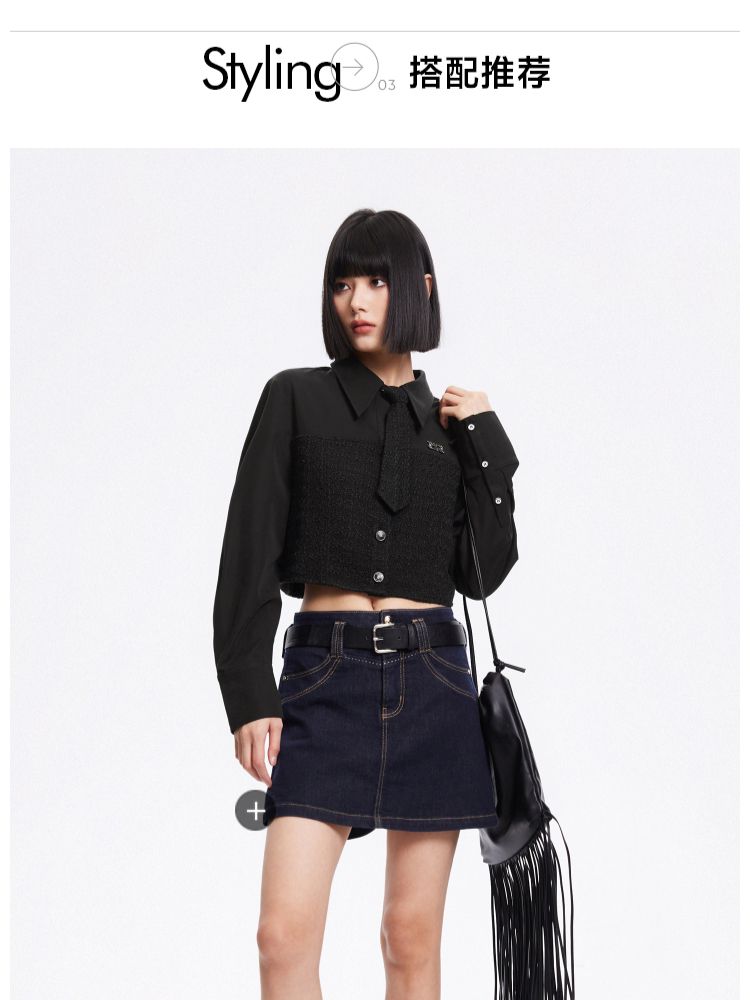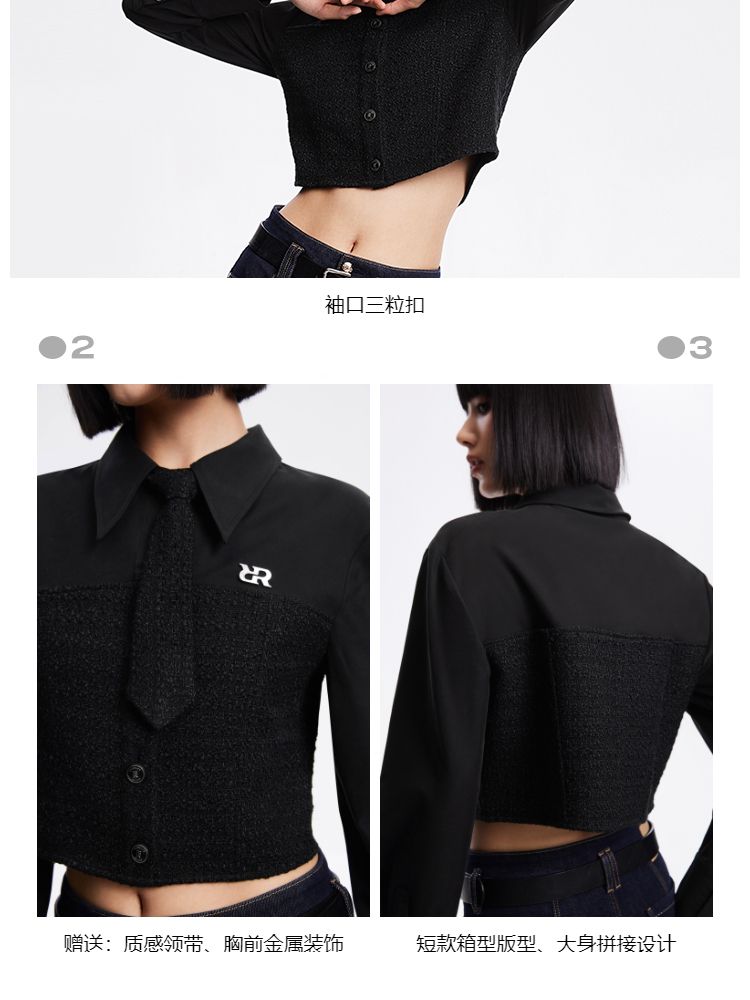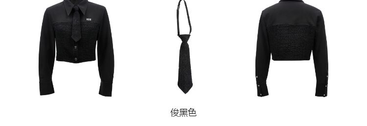 【拼接设计】春季可拆卸领带翻领短款雪纺衫女 647770