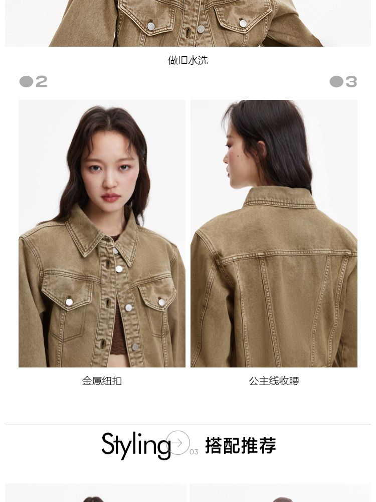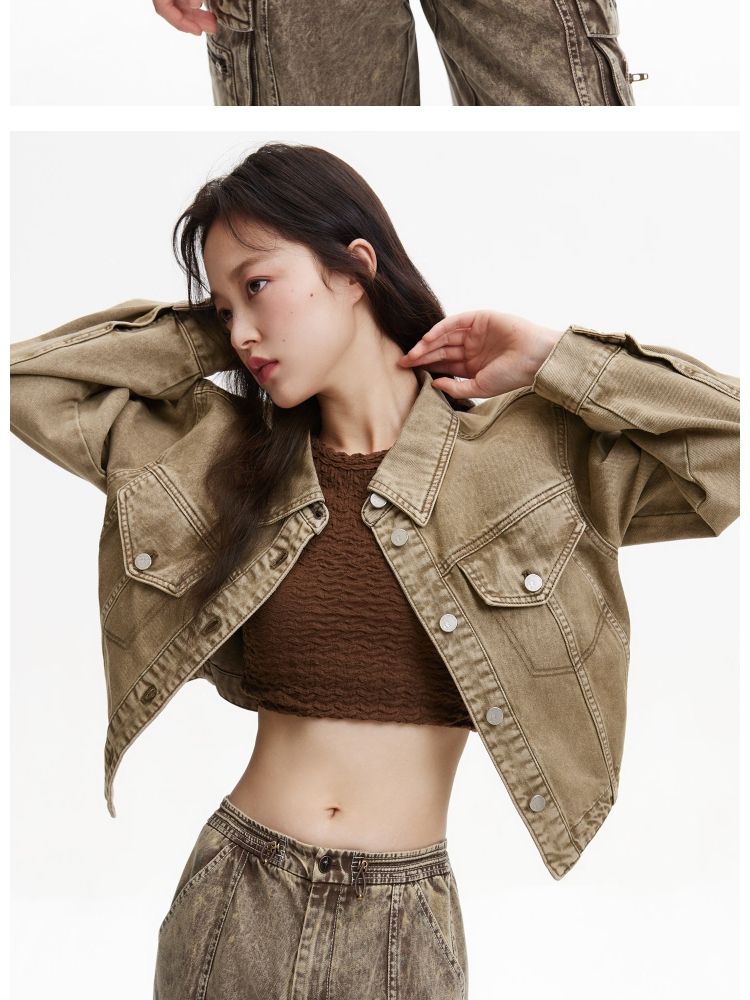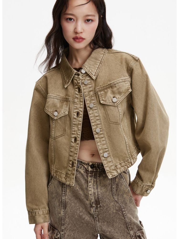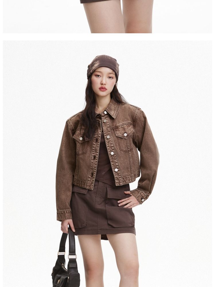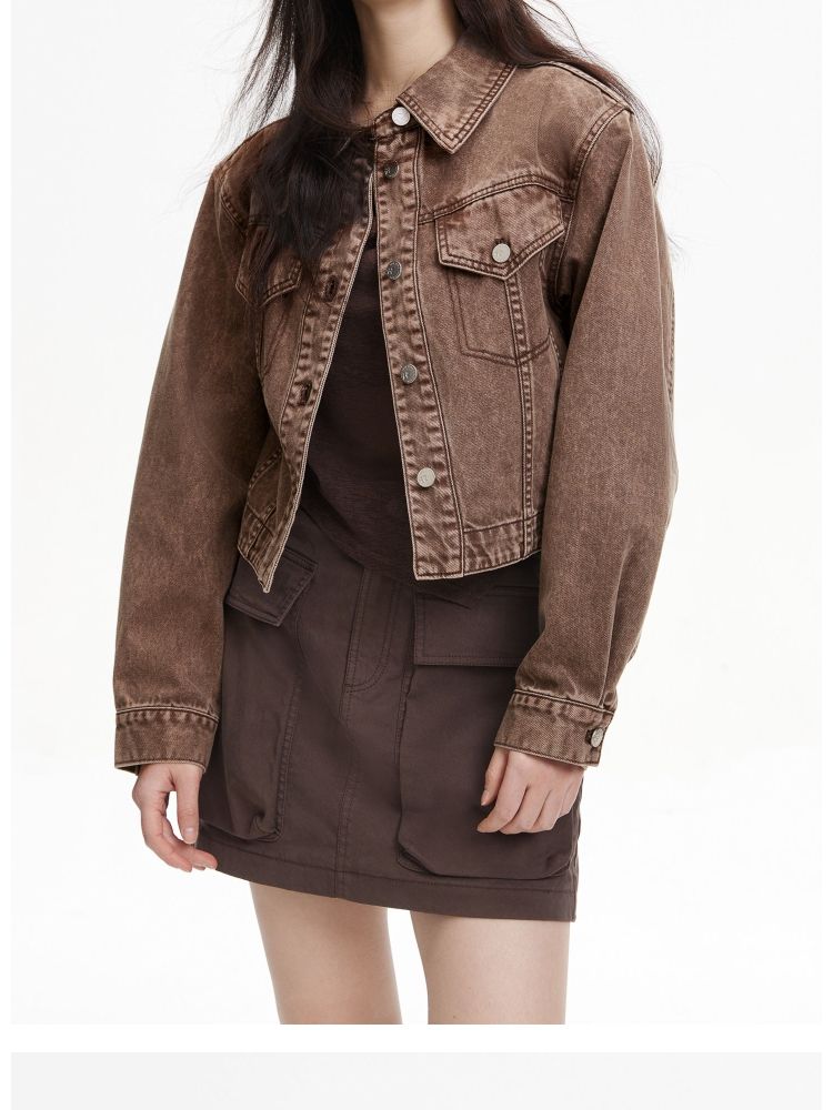 【复古做旧】春季水洗金属纽扣翻领短款外套女 806682