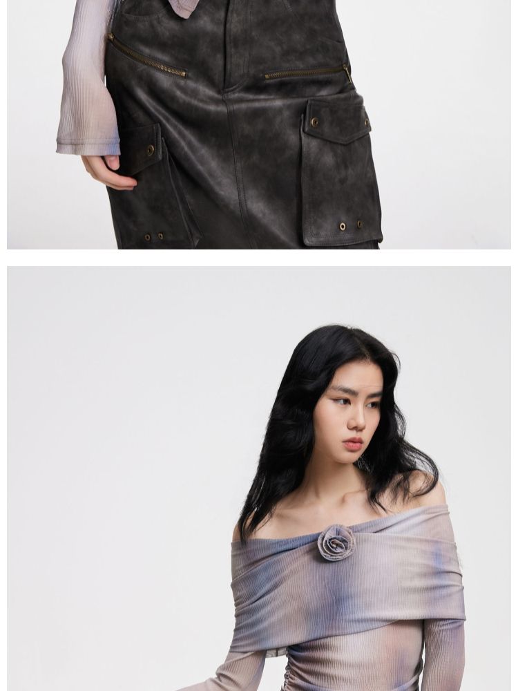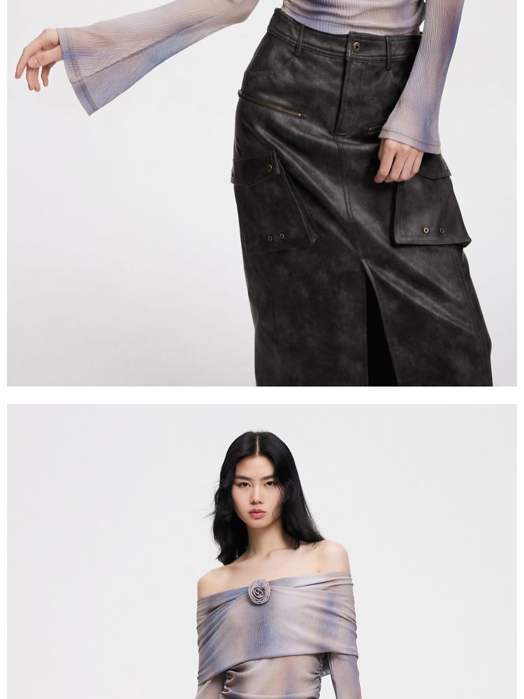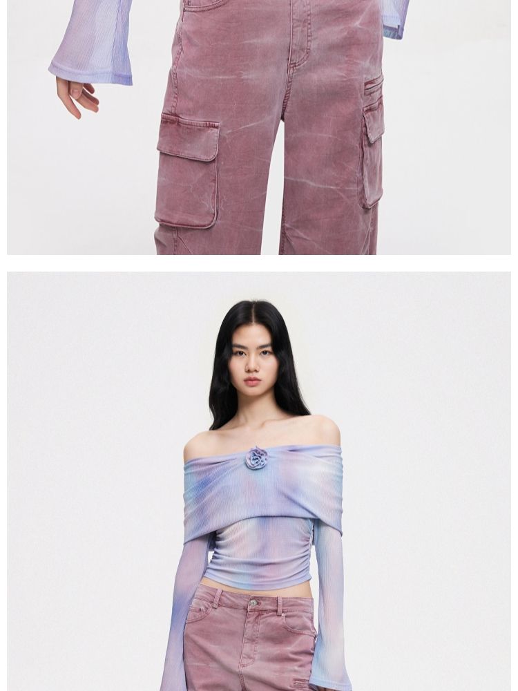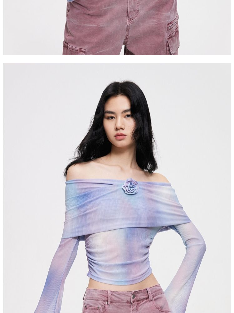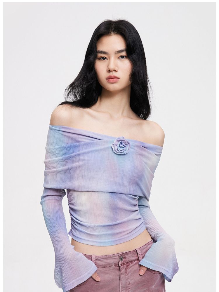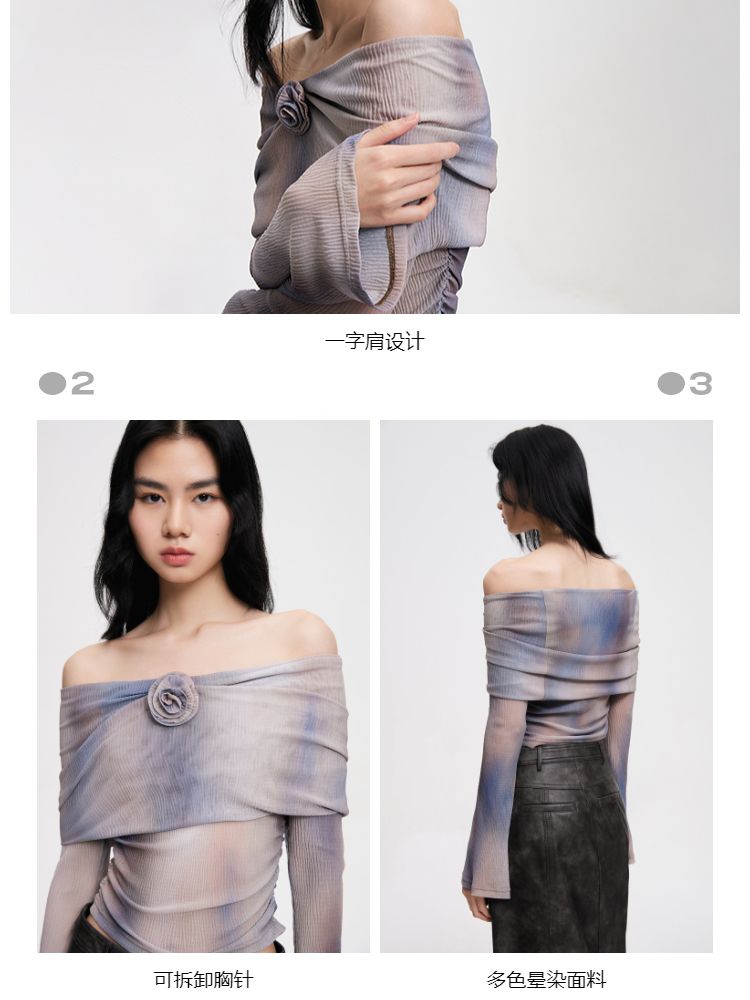 【一字肩设计】夏季设计感晕染一字肩长袖T恤女 382298
