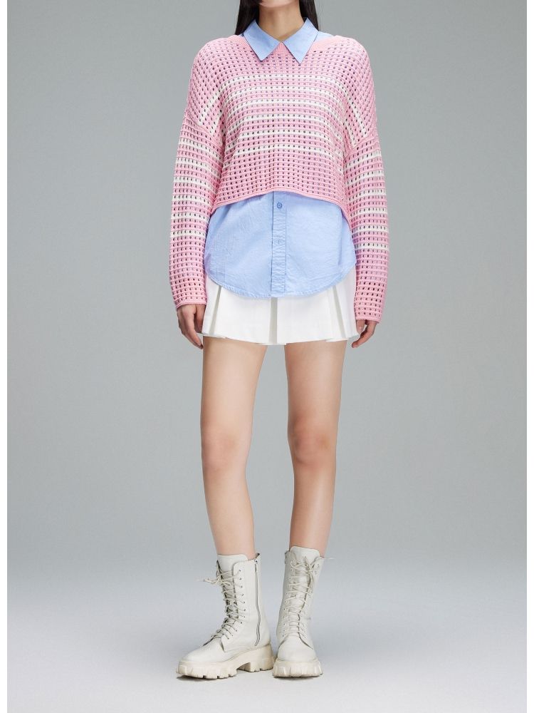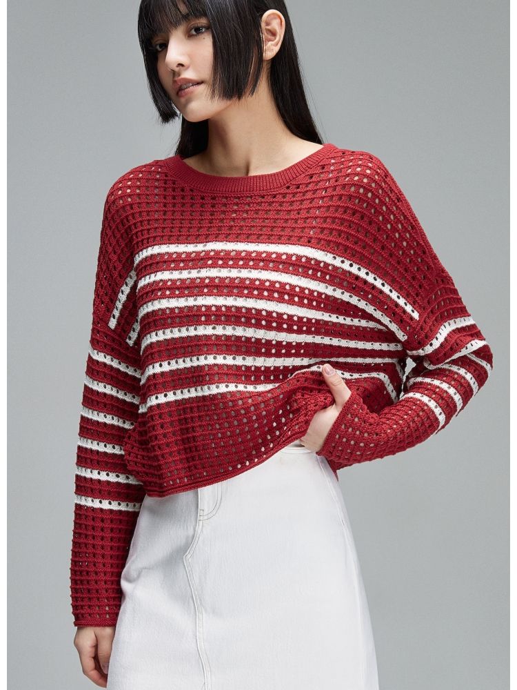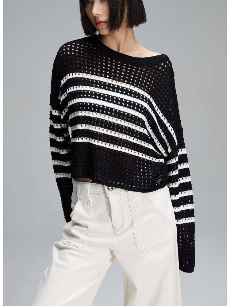 【宽松落肩】夏季镂空条纹宽松落肩短款毛衣针织衫女 854490