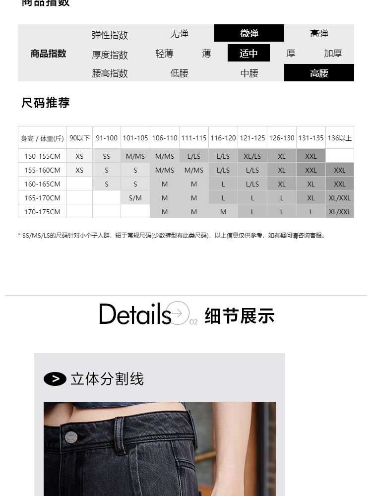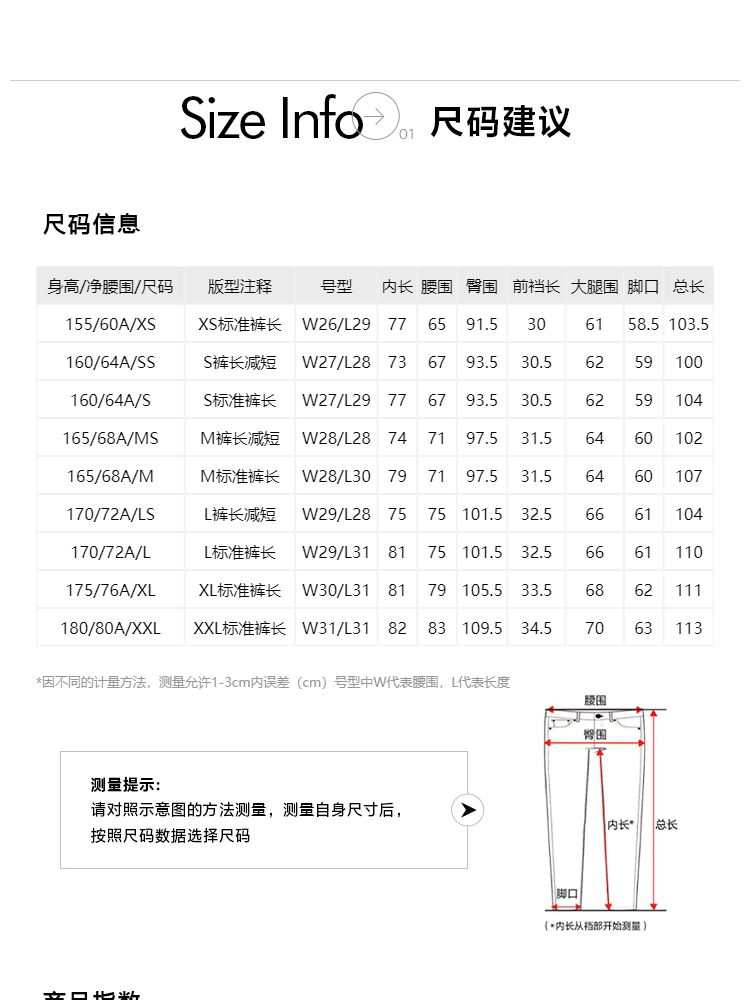 | XS(标准裤长) | 61 | 65 | 103.5 | 91.5 | 155/60A |