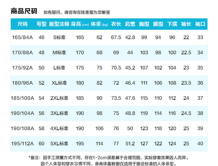 | 尺码 | 衣长(cm) | 肩宽(cm) | 腰围(cm) | 袖长(cm) | 胸围(cm) | 下摆围(cm) | 号型 |