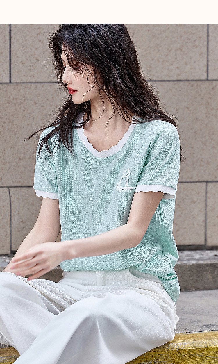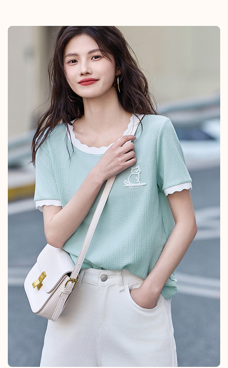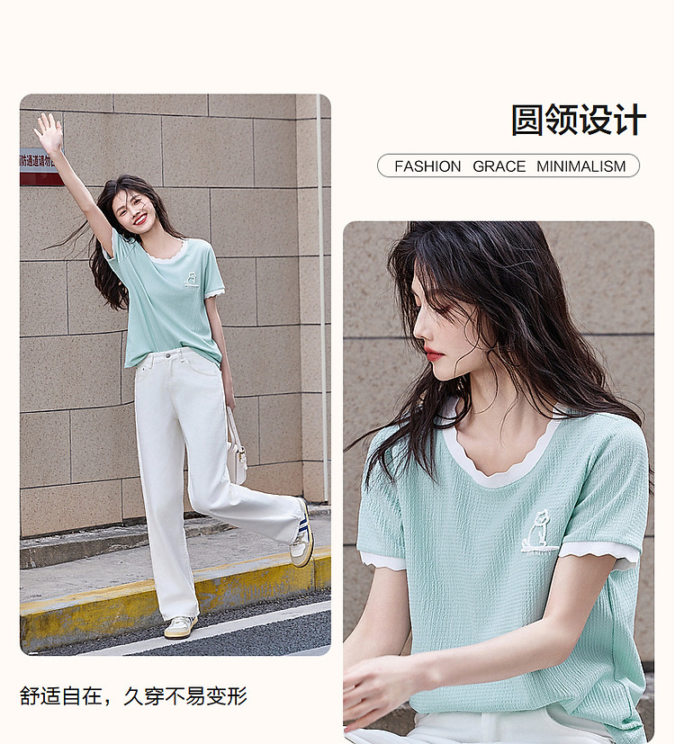 【夏日轻龄衣橱】新圆领喵咪字母牙刷绣短袖t恤少女感女式t恤 658433