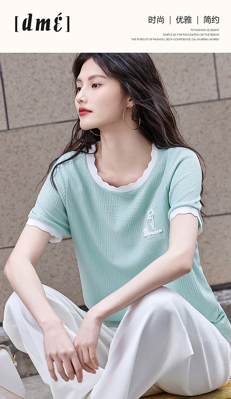 【去繁就简】夏新轻熟风光泽感肌理圆领短袖t恤女连袖露肩女式t恤 694913