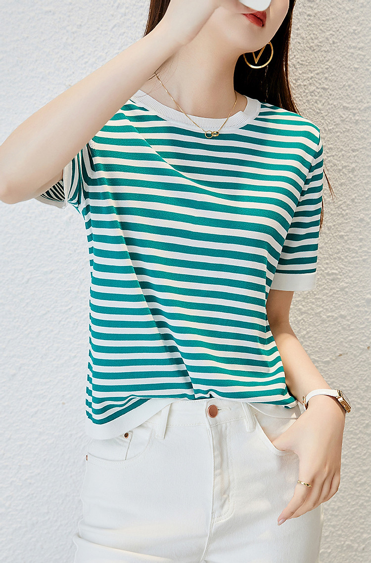 【双曲冰麻线衫】夏季款圆领短袖条纹针织衫女上衣 920321