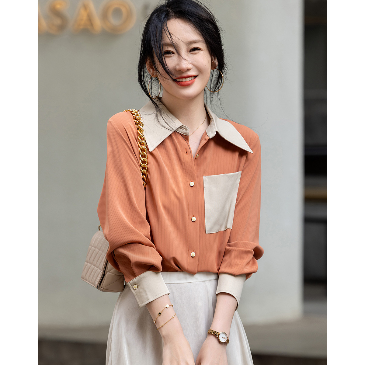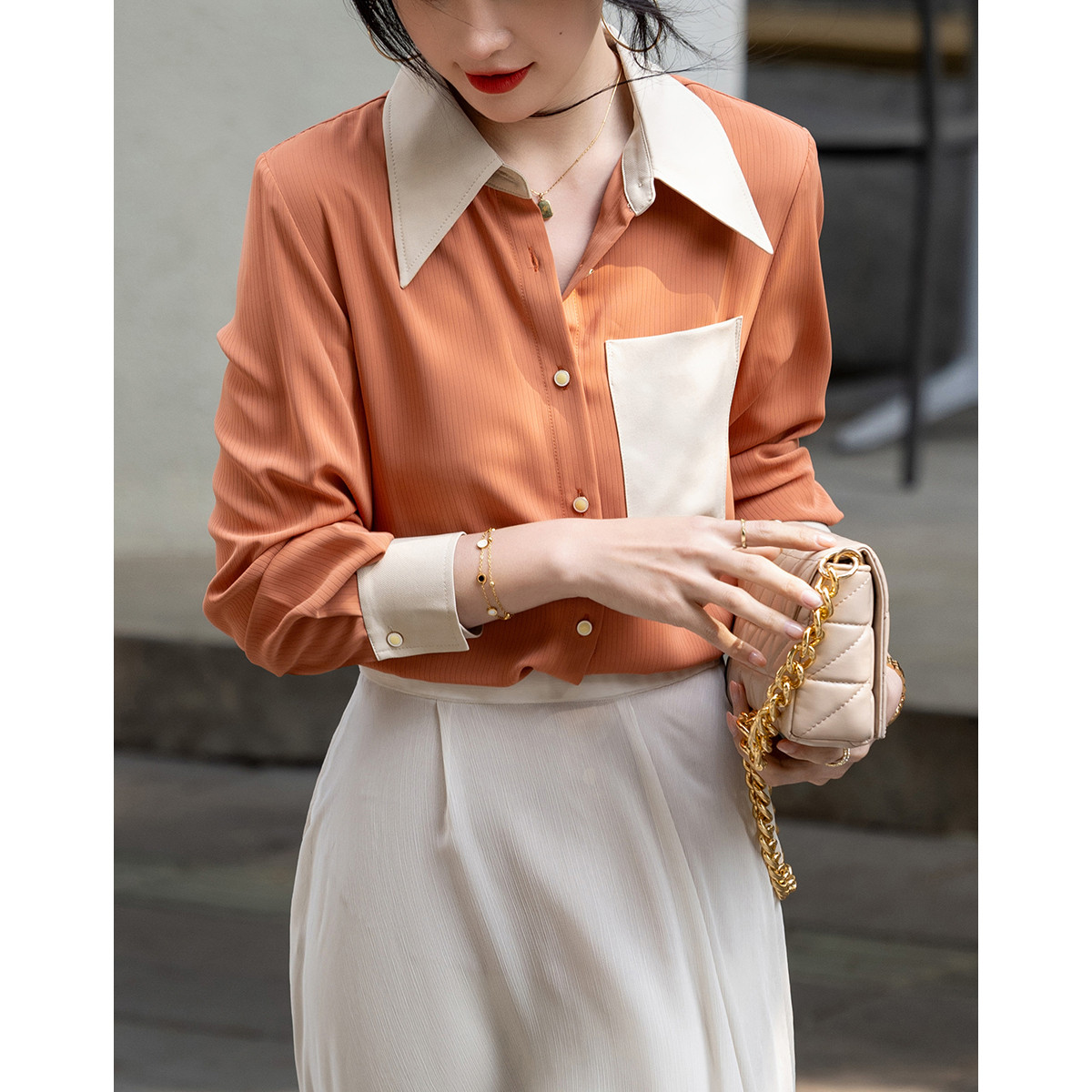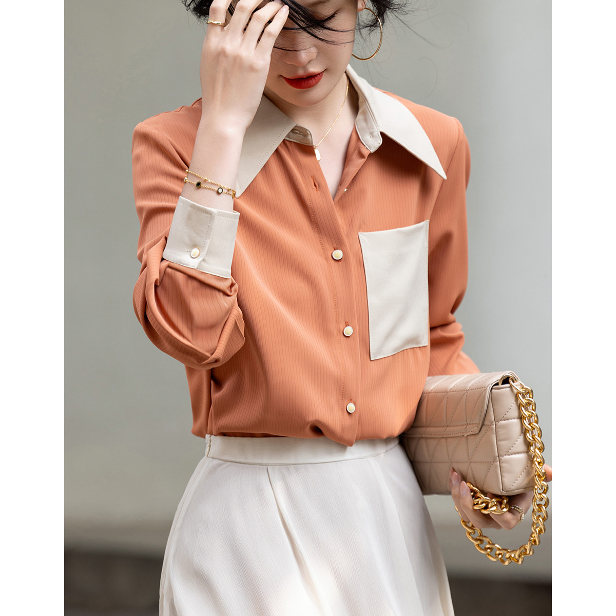 商品名称:【微风情书】春秋简约风拼色衬衫口袋装饰舒适藏肉衬衣女装上衣 167041