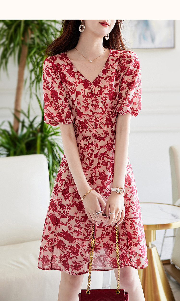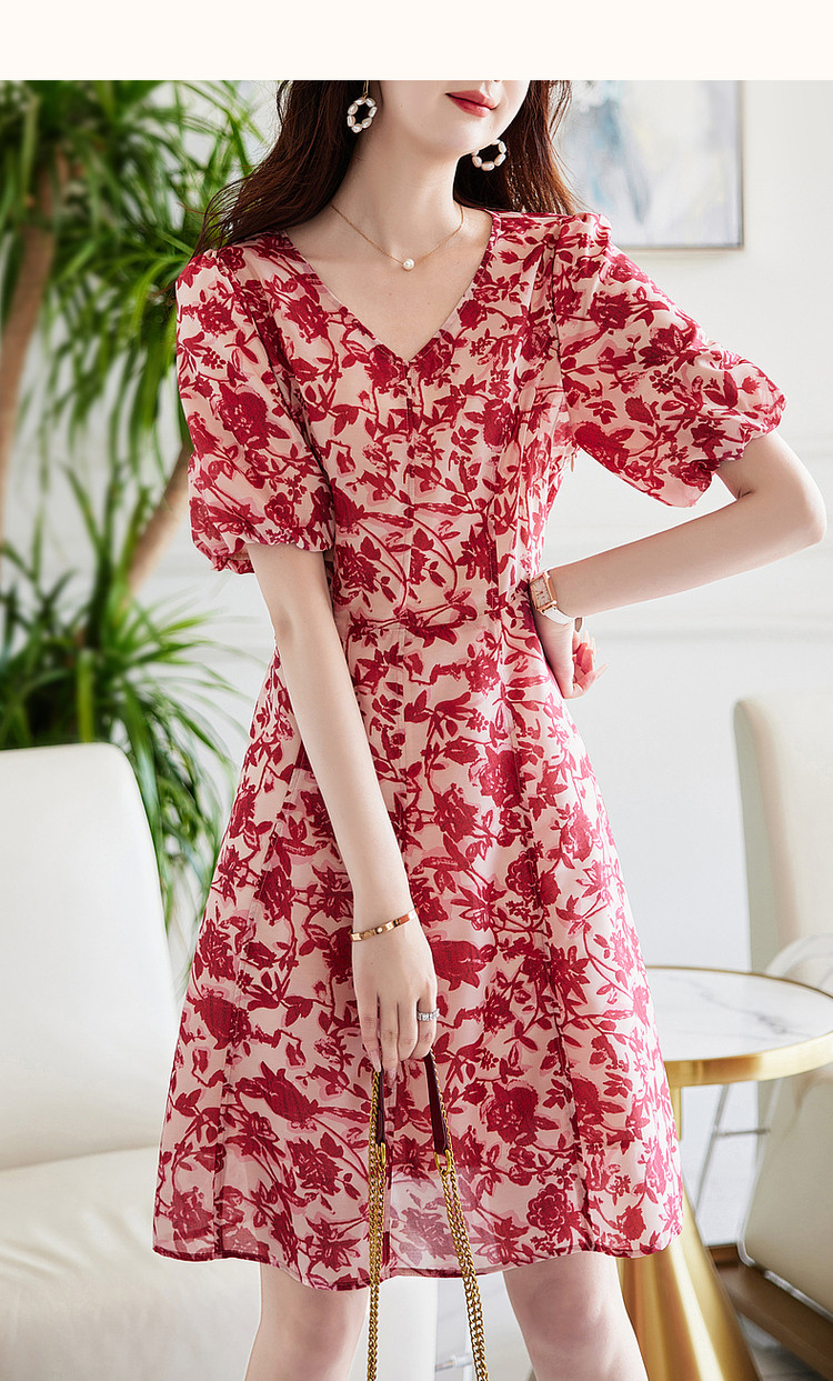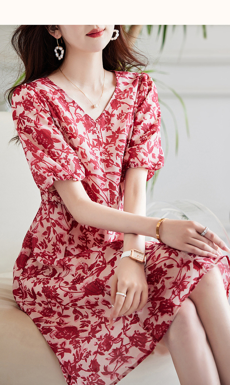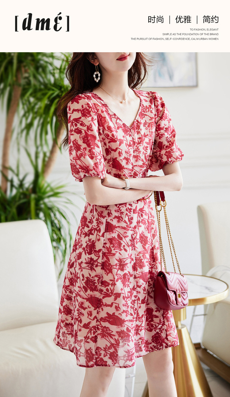 商品名称:【名媛风伞裙】夏季v领收腰灯笼袖连衣裙女中长款 072897