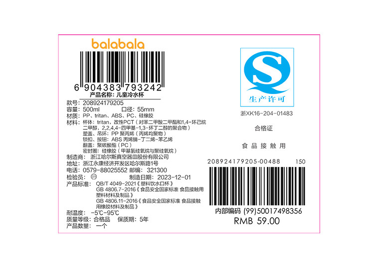 商品名称:500ML大容量儿童冷水杯男童女童直饮杯冷水壶实用便携外出 513989
