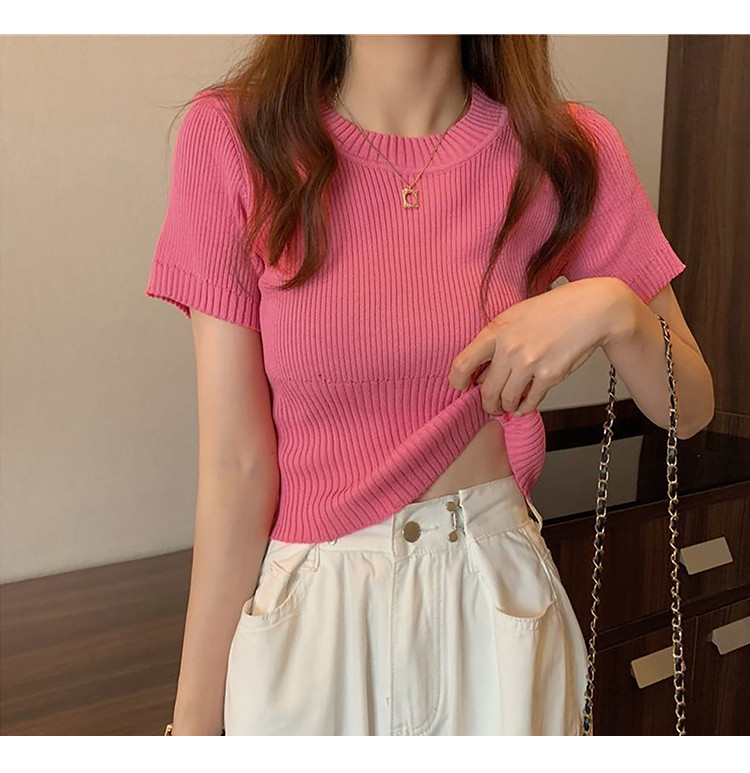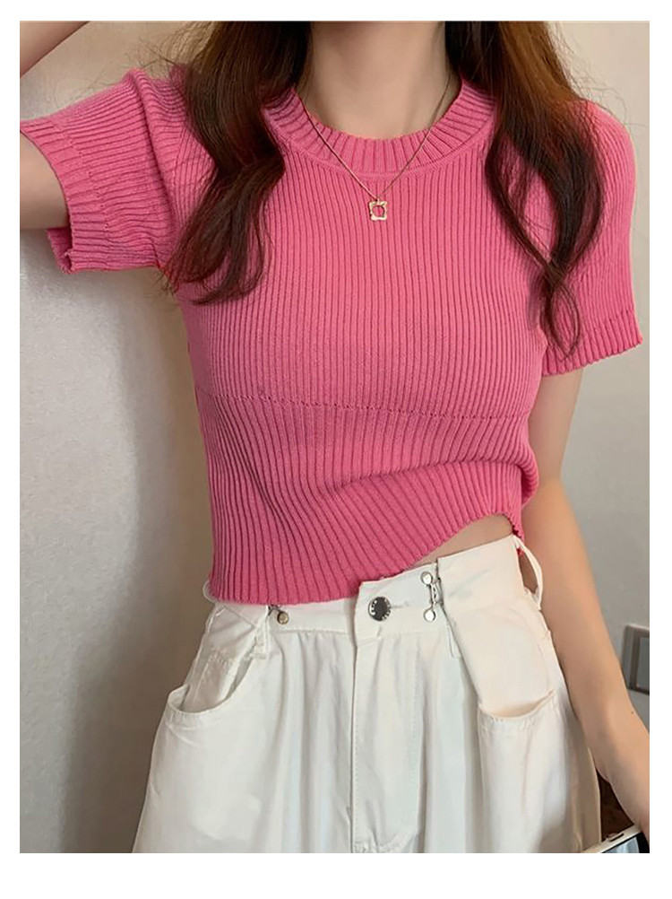 圆领短袖针织衫女百搭休闲短款显瘦针织t恤女上衣 763651