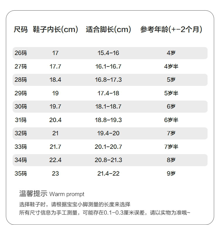 | 33码(脚长20.5/内长21.7) | 33 | 205 | 217 |