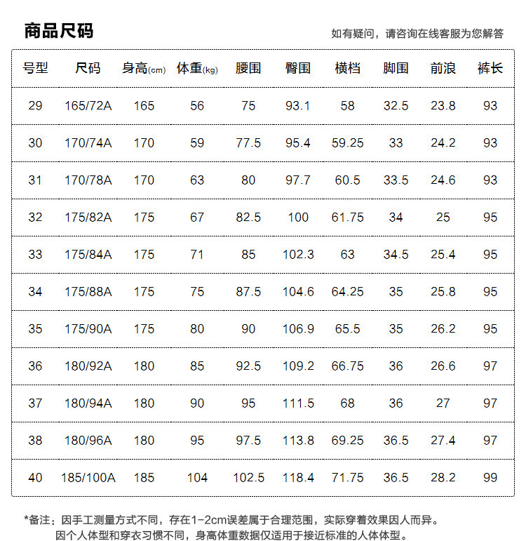 | 38(推荐91~95kg) | 36.5 | 97.5 | 97 | 27.4 | 113.8 | 180/96A |