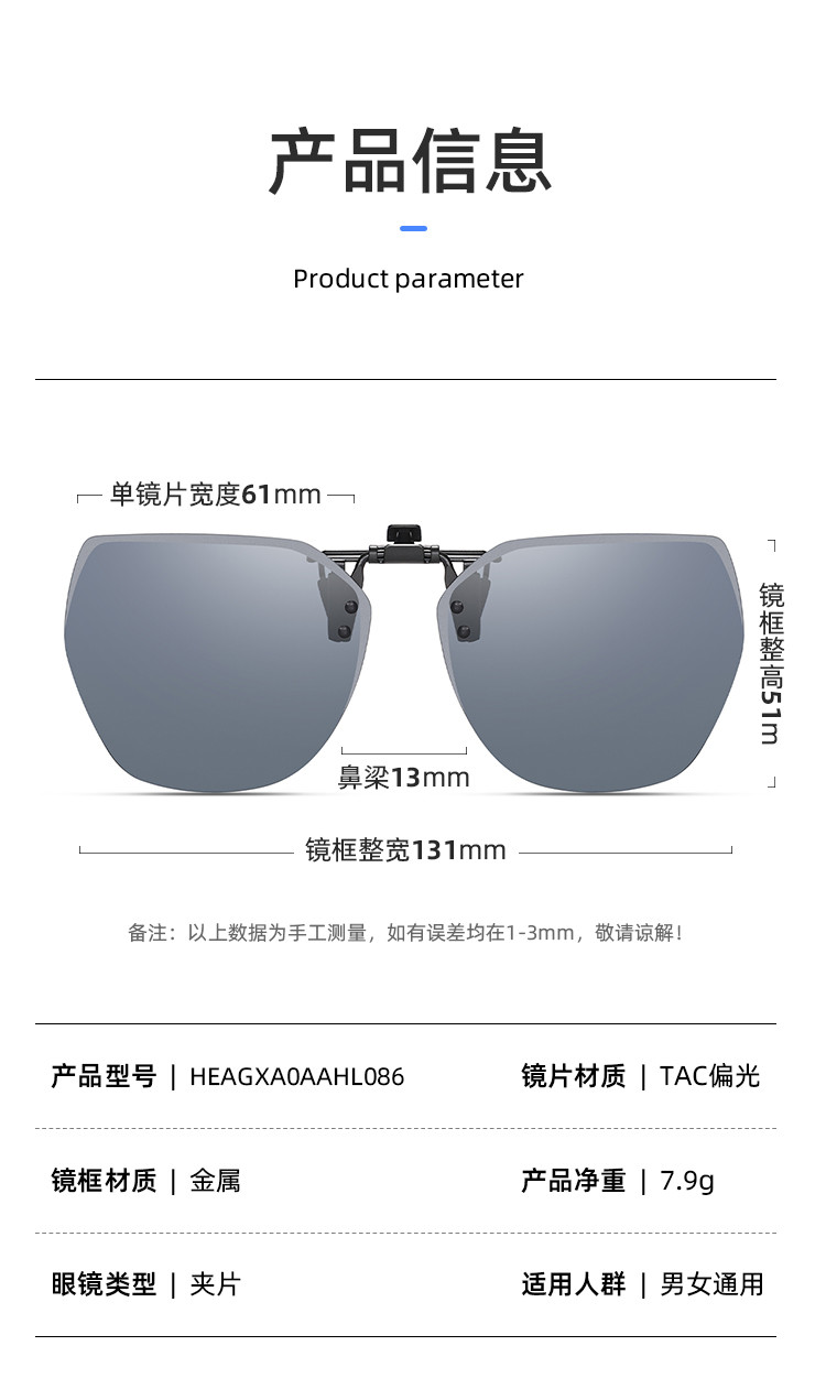商品名称:近视专用夹片秒变太阳镜防紫外线眼镜驾驶开车超轻便男女偏光夹片 432900