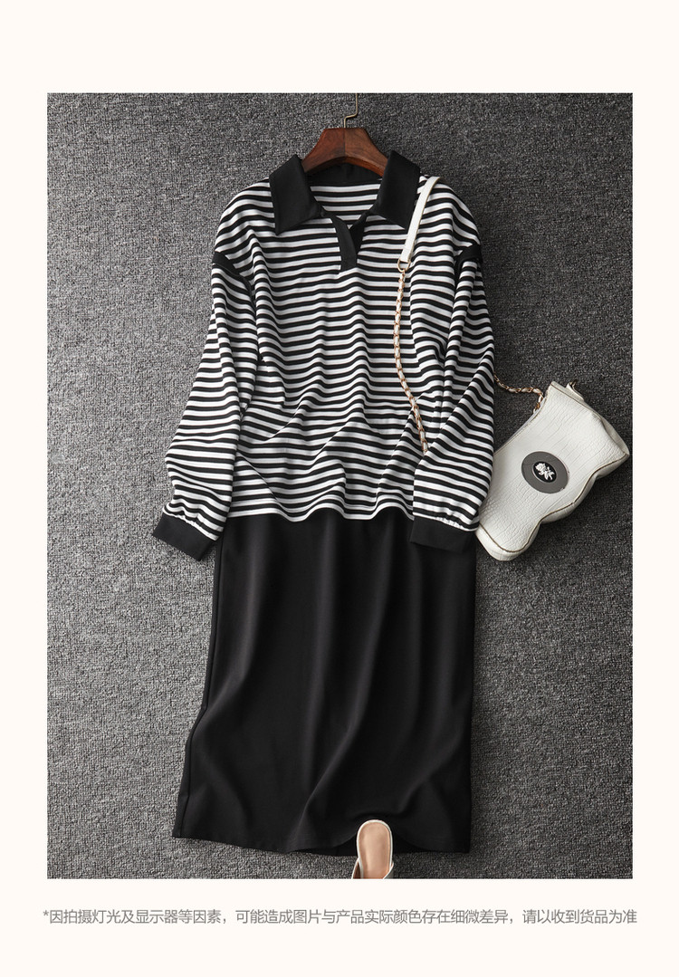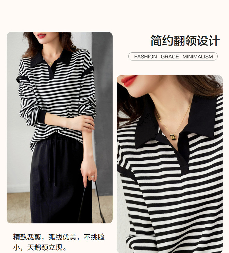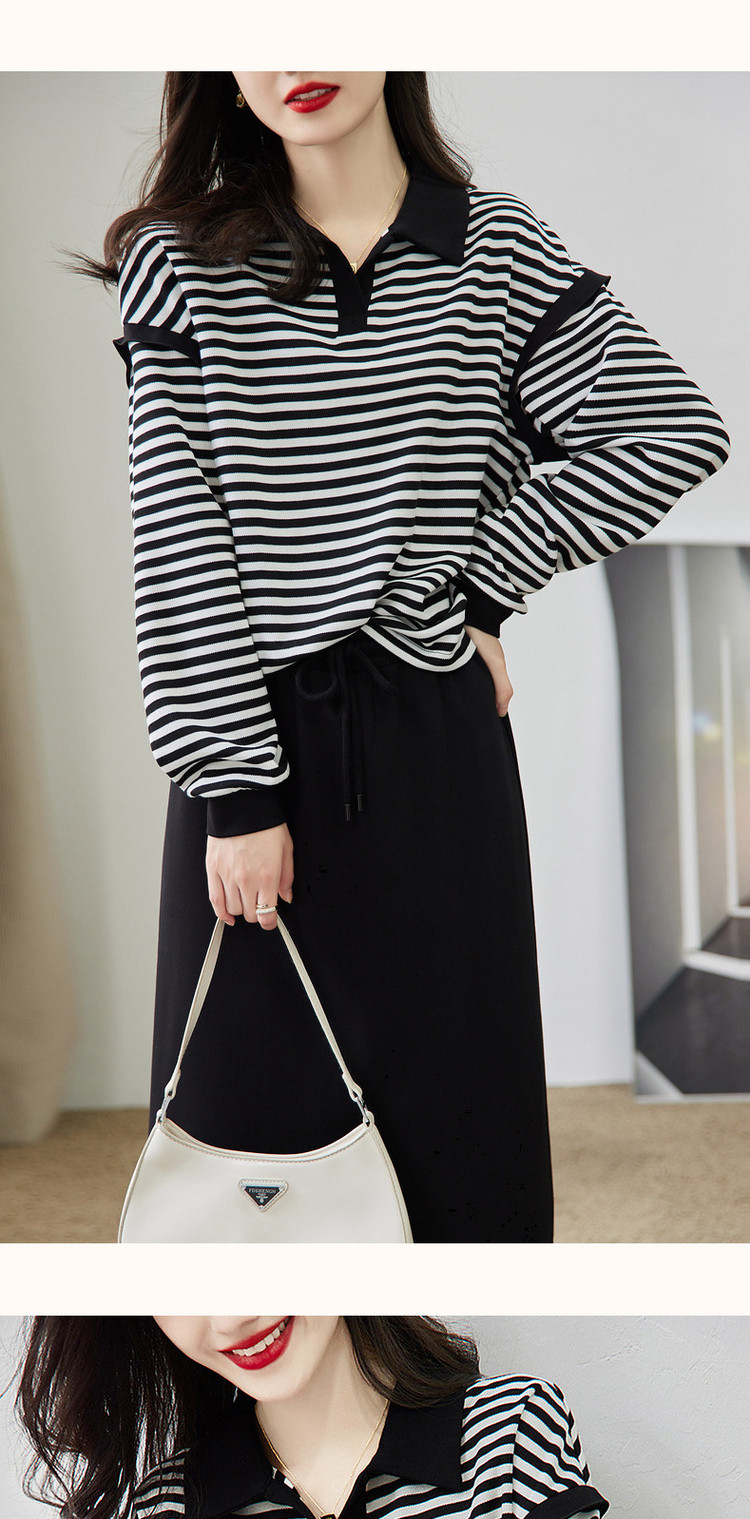 商品名称:【罗马布套装】春秋季翻领长袖条纹上衣中腰半裙套装女时尚 124417