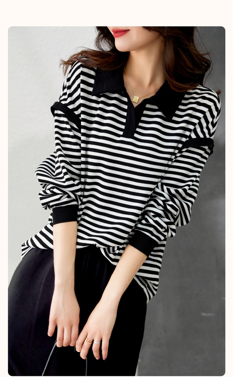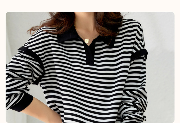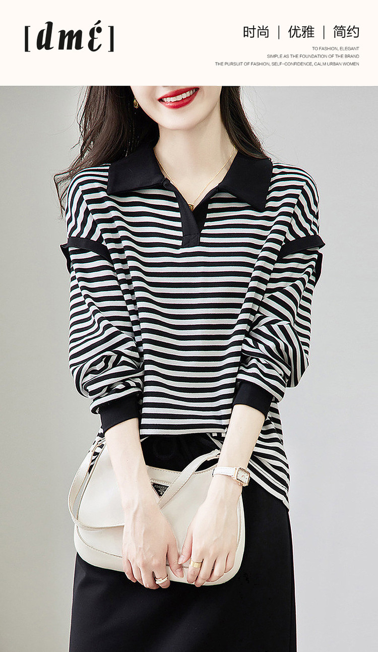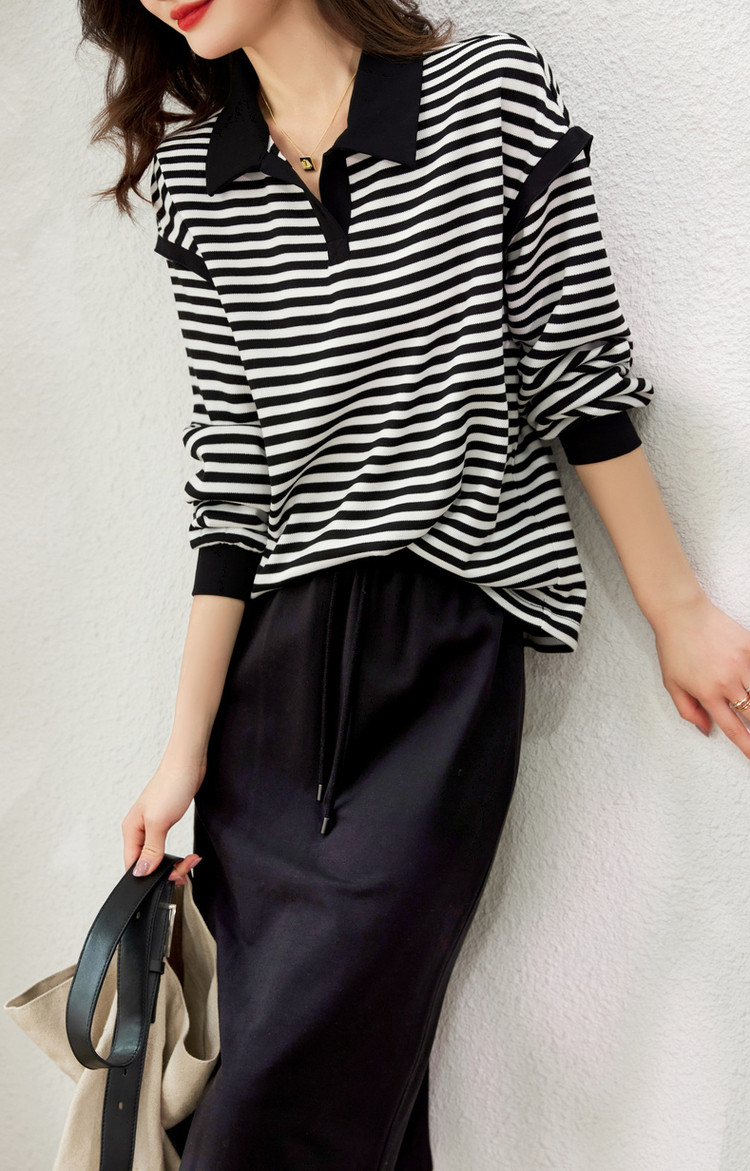 【罗马布套装】春秋季翻领长袖条纹上衣中腰半裙套装女时尚 124417