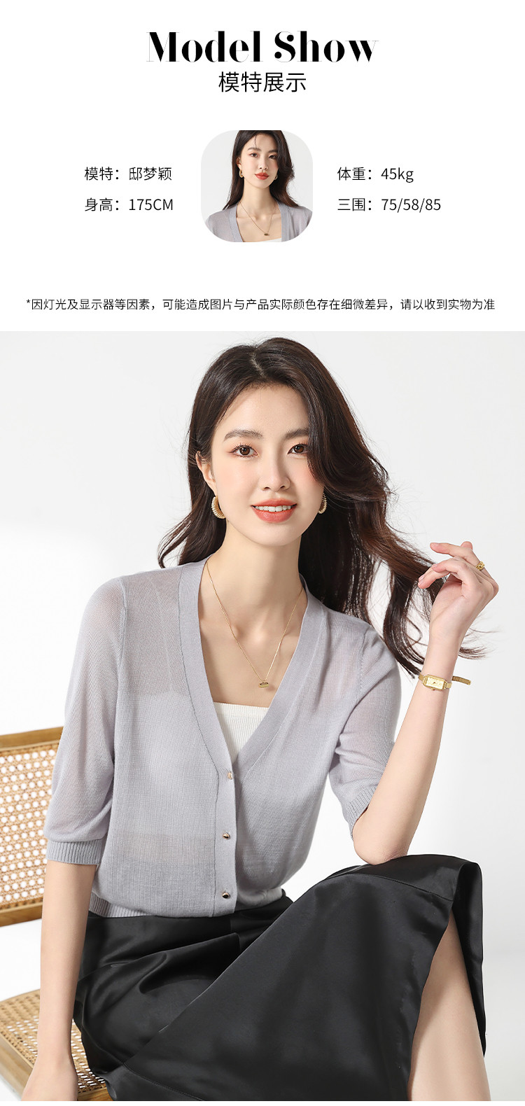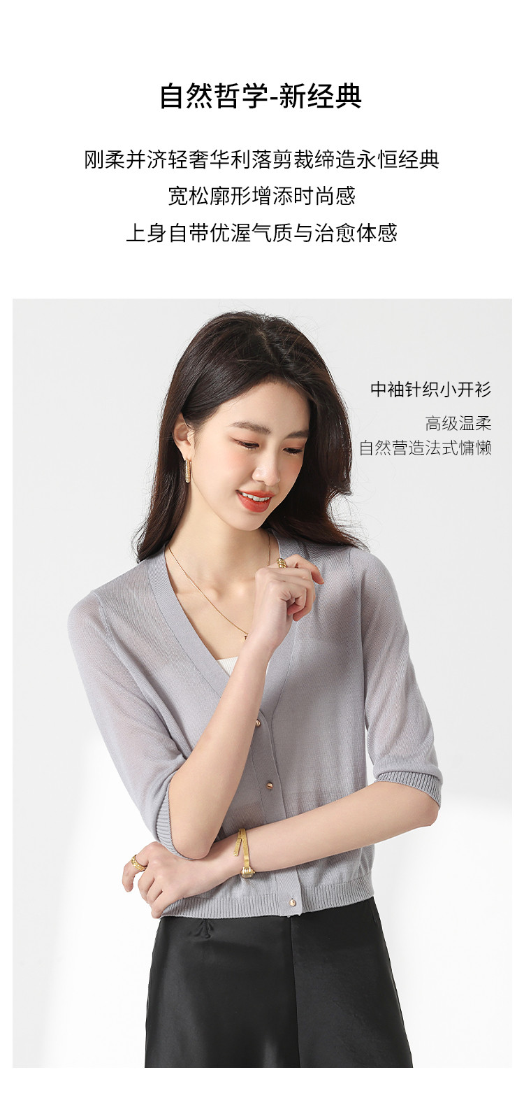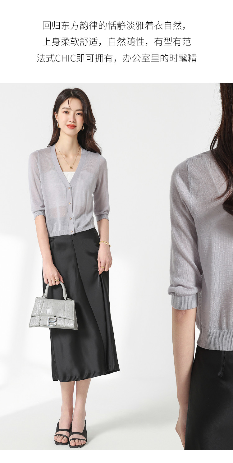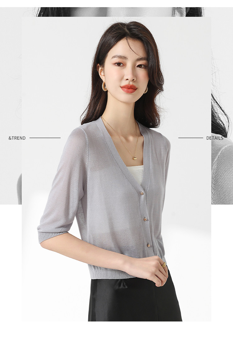 商品名称:【含桑蚕丝 纯色百搭】时尚中袖透气亲肤针织开衫空调衫女夏 810451