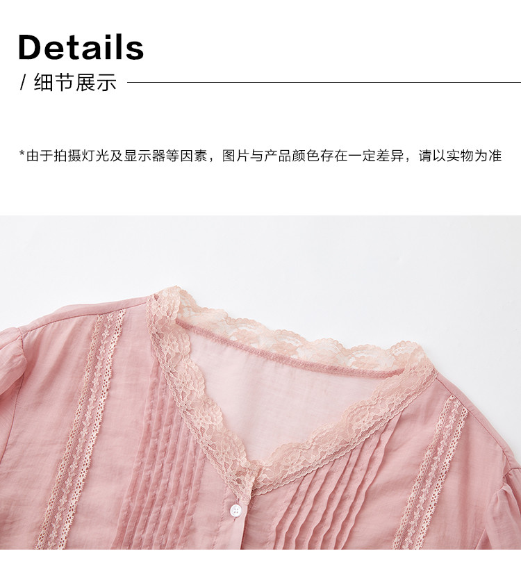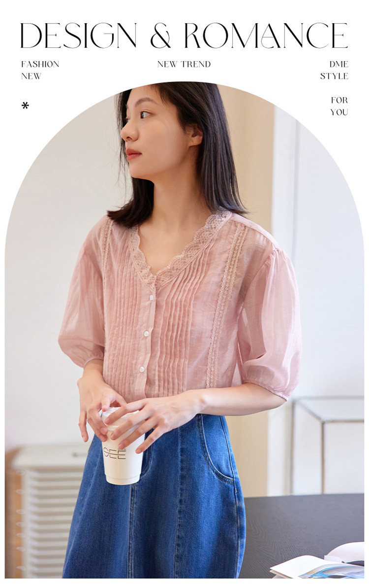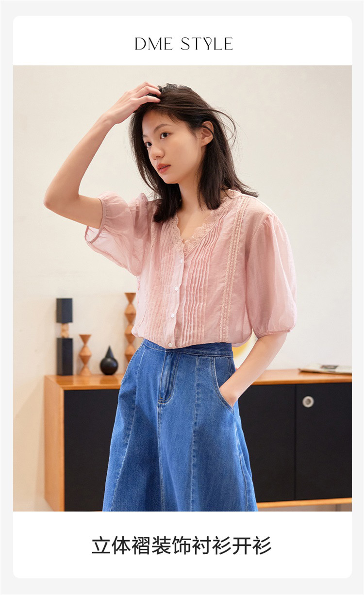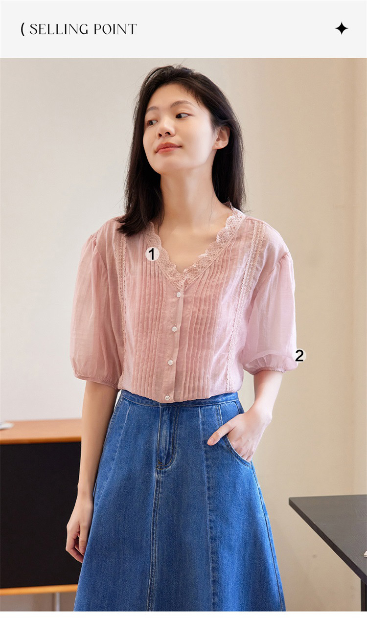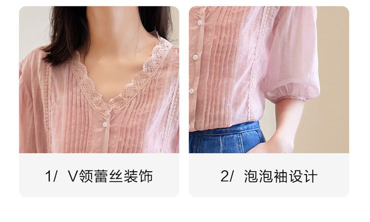 商品名称:【蕾丝V领开衫】夏款立体褶装饰泡泡袖短袖衬衫开衫女 670594