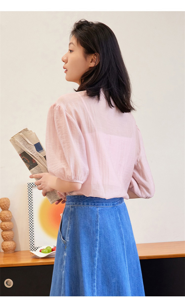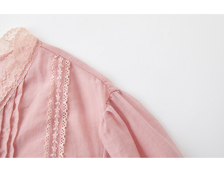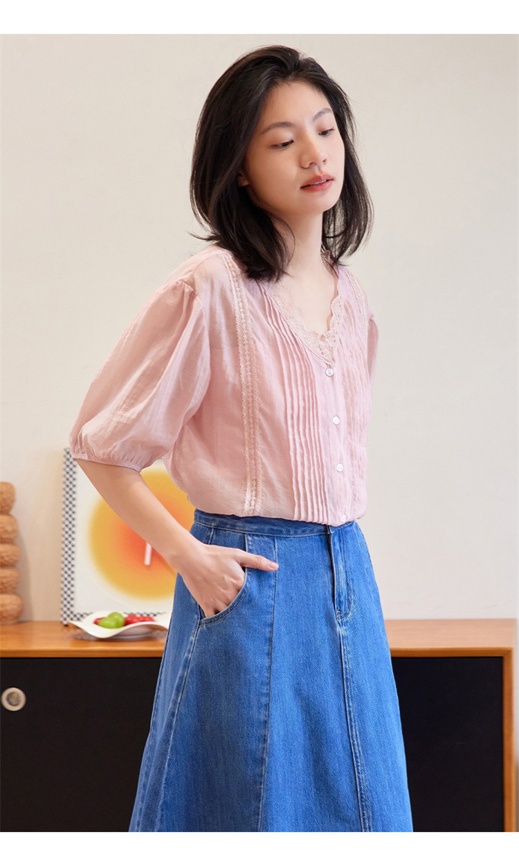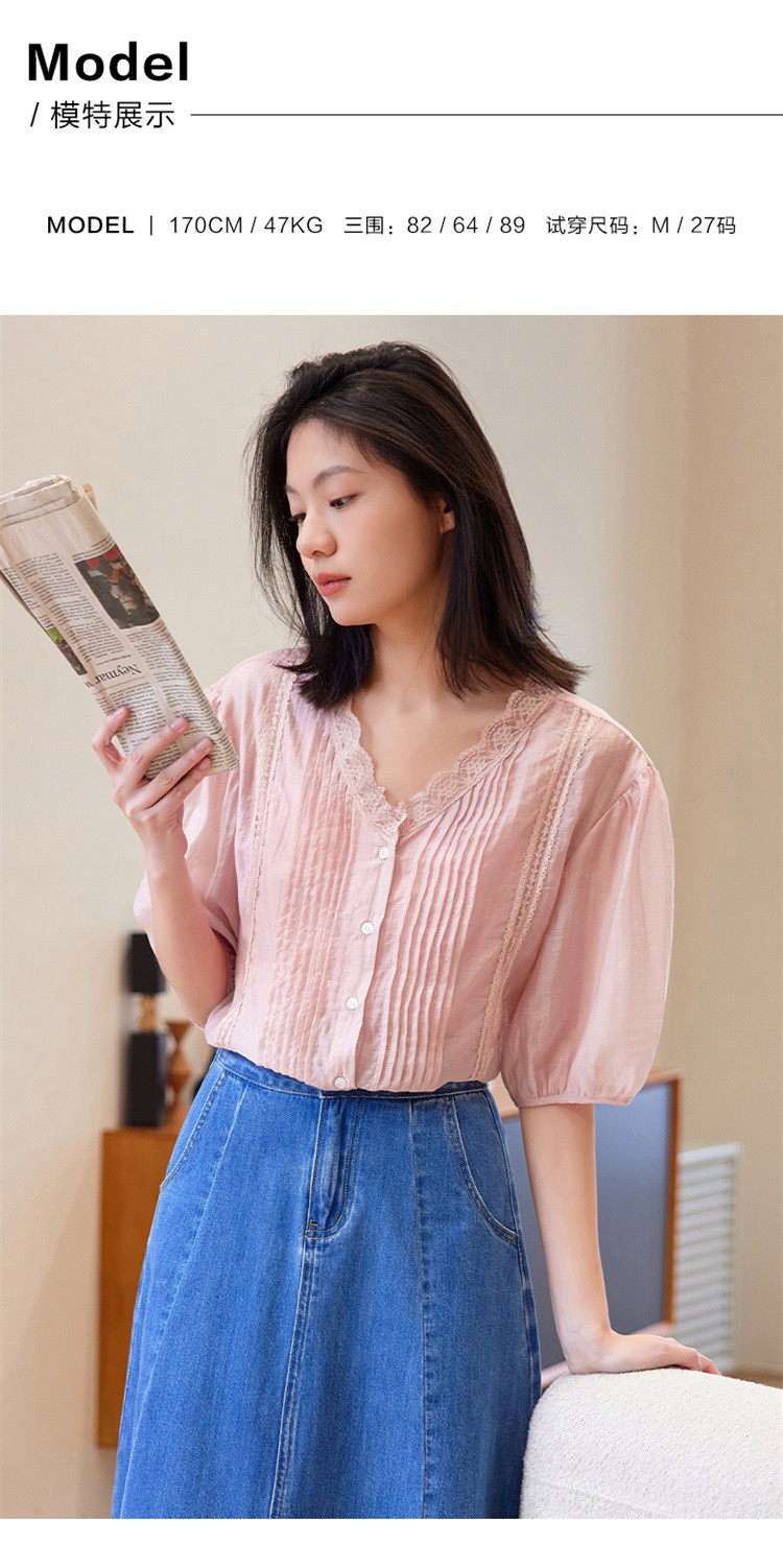 商品名称:【蕾丝V领开衫】夏款立体褶装饰泡泡袖短袖衬衫开衫女 670594