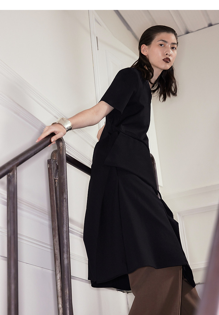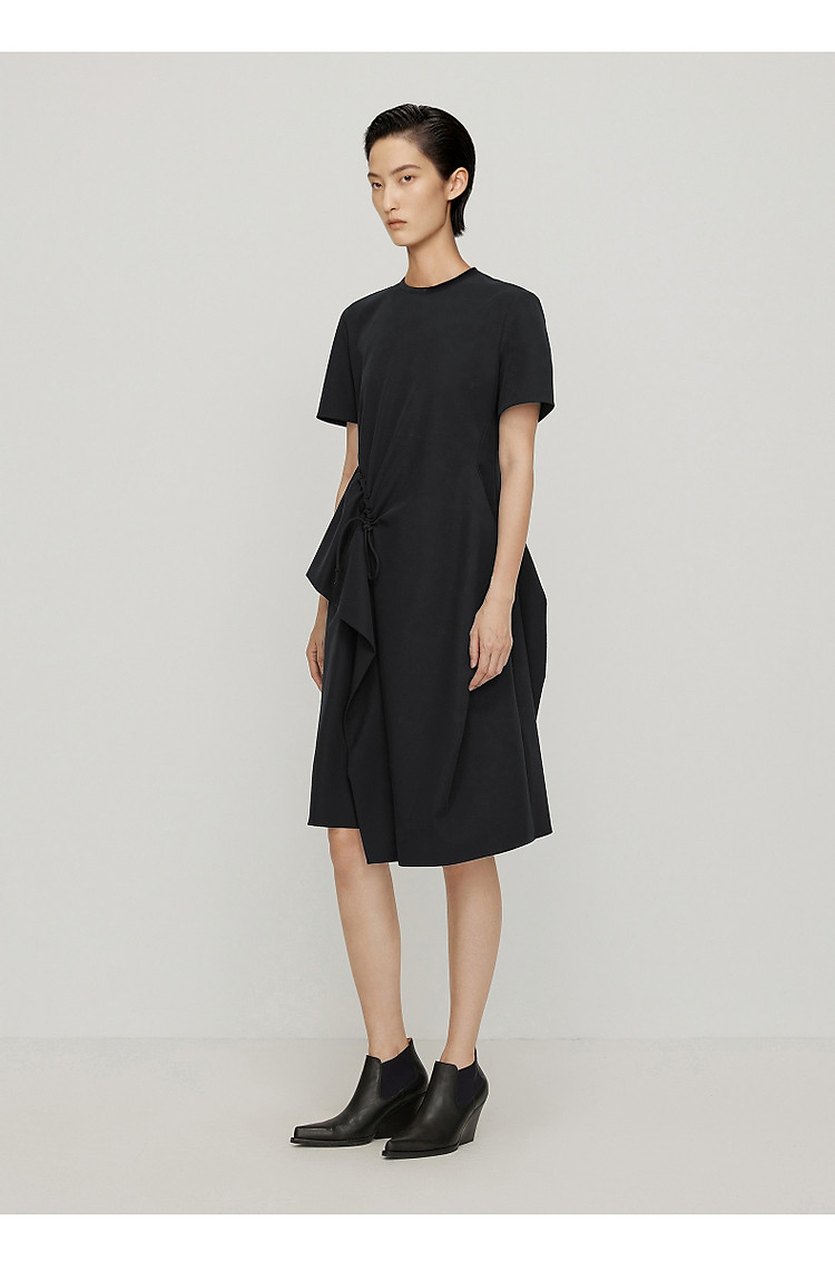 【亚麻莱赛尔混纺】夏季通勤圆领连袖单排扣腰带长款女式连衣裙 472449