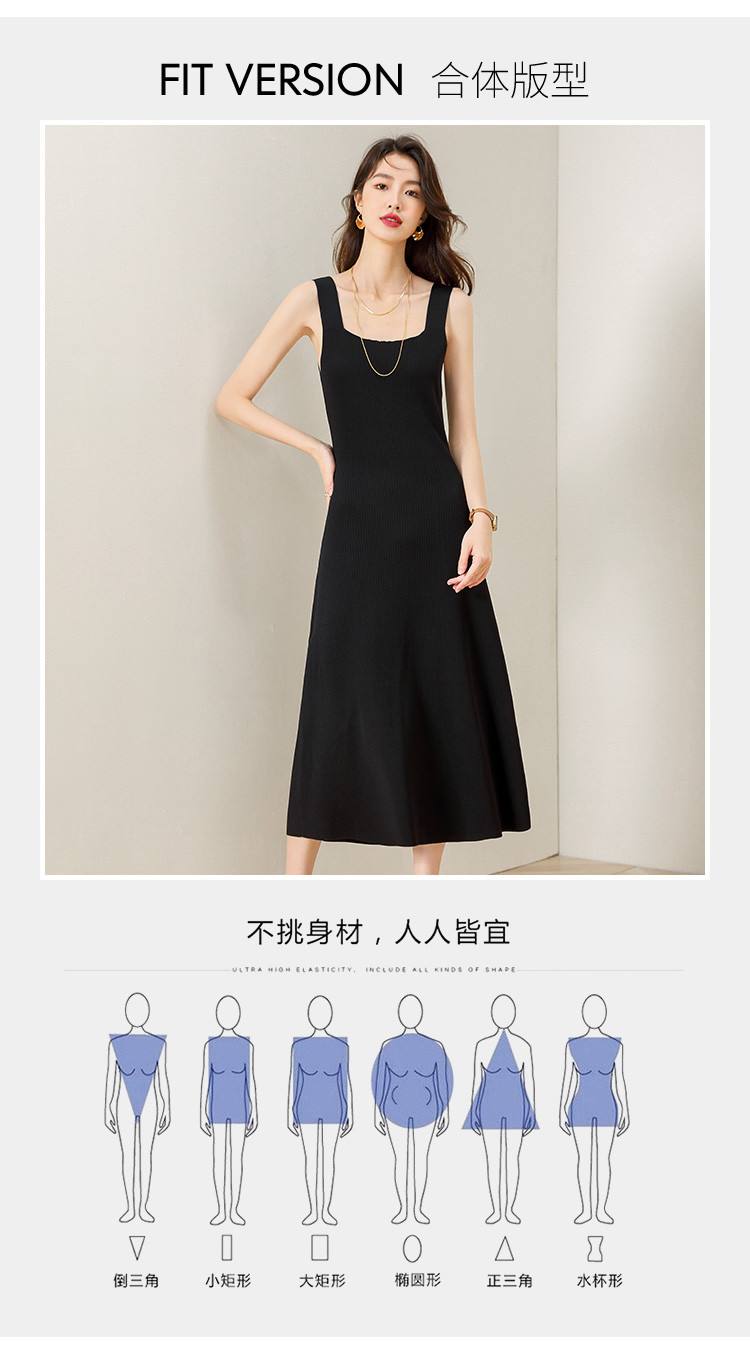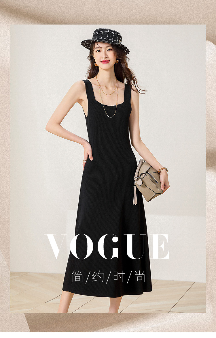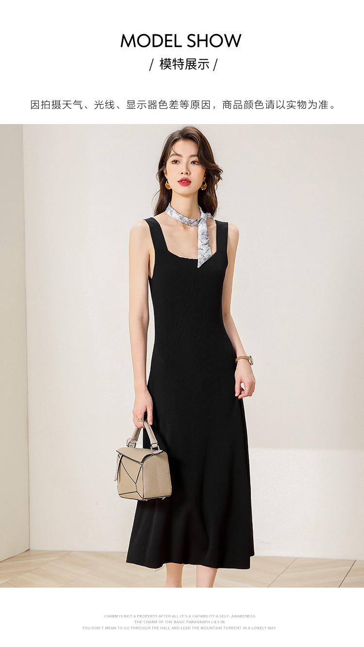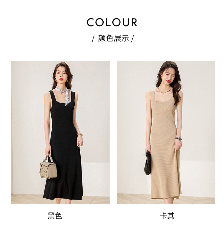 商品名称:【优雅淑女】简约百搭纯色方领收腰中长款无袖吊带针织连衣裙 141011